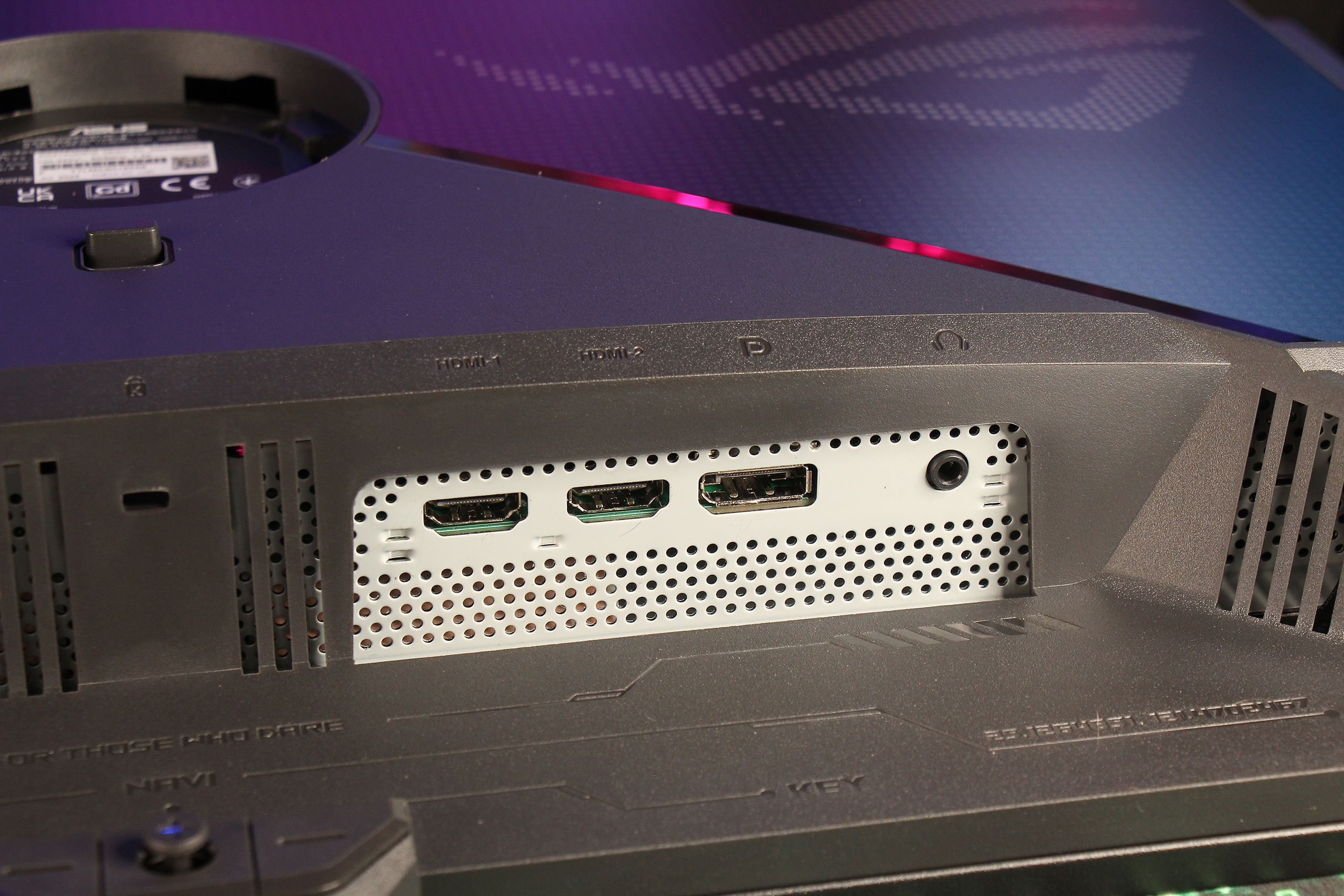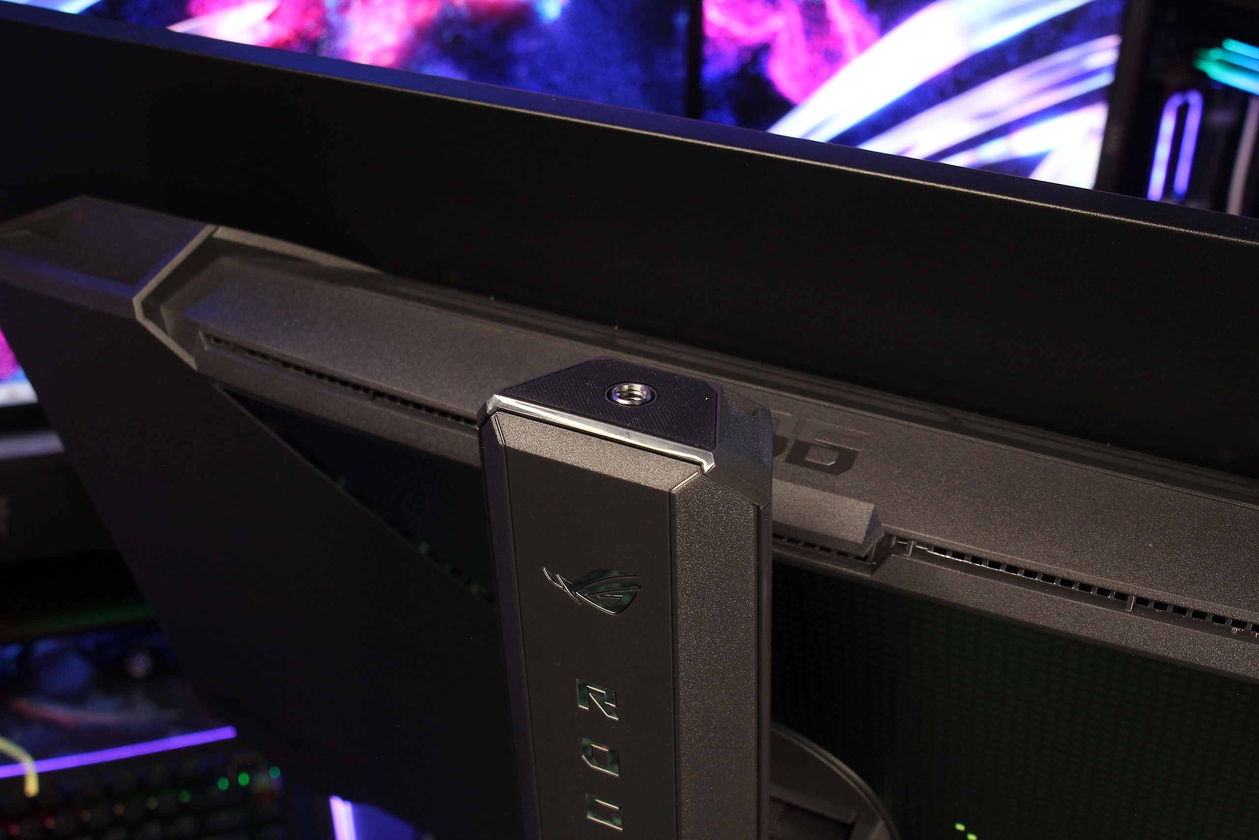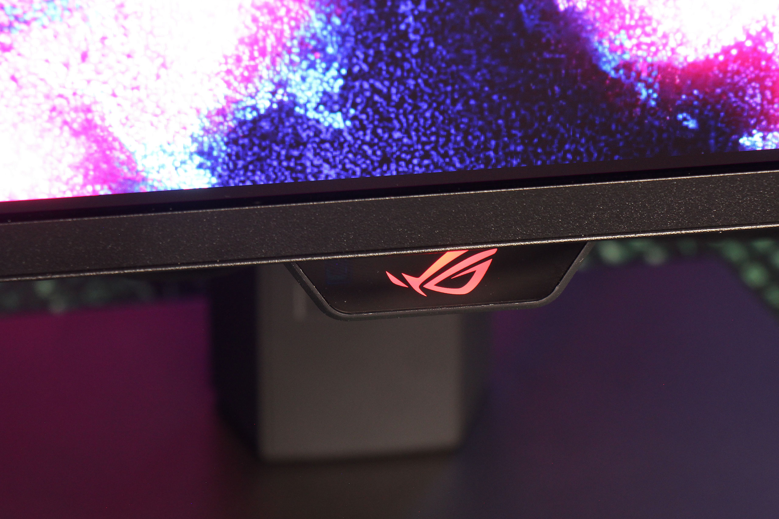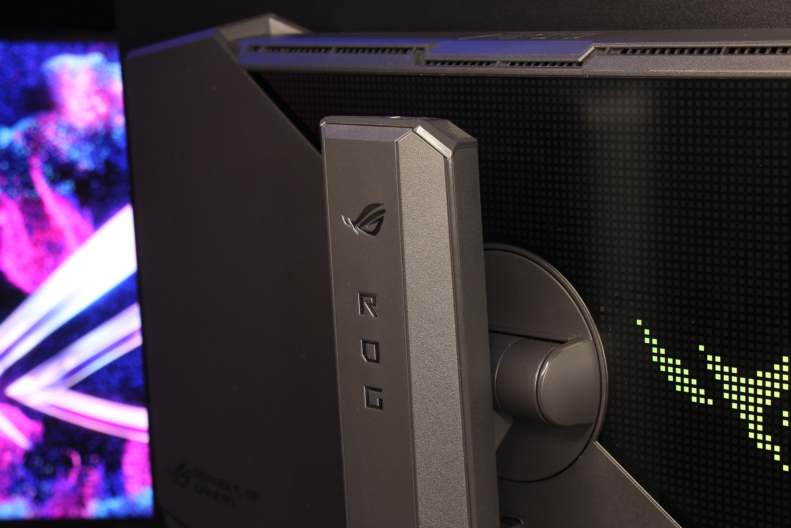 Задняя панель оформлена в киберпанковом (слова производителя!) стиле с футуристическими узорами и RGB-подсветкой Aura Sync в виде эмблемы Republic of Gamers, синхронизирующейся с другими устройствами экосистемы ASUS. Вентиляционные отверстия оптимизированы для эффективного отвода тепла от QD-OLED панели.