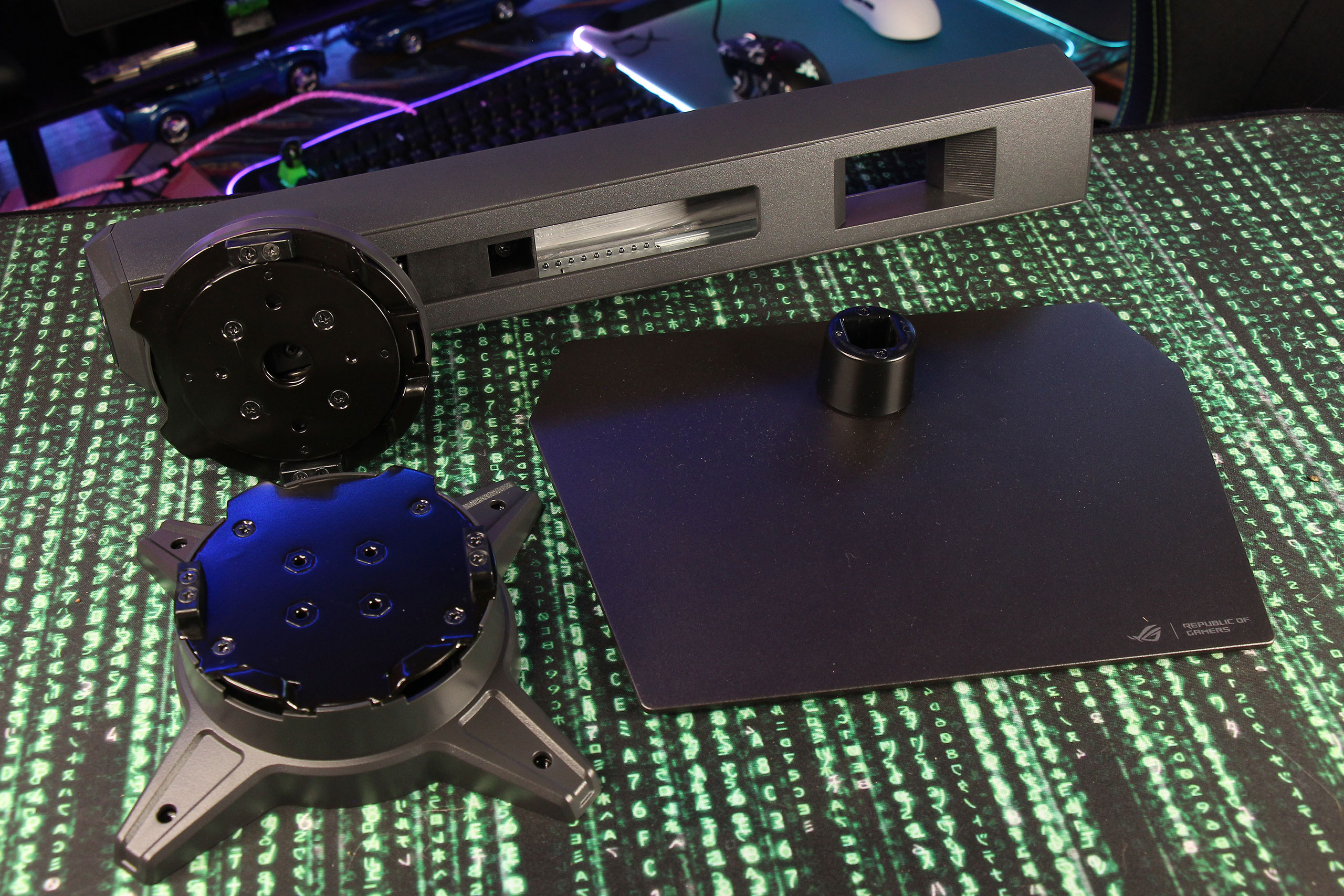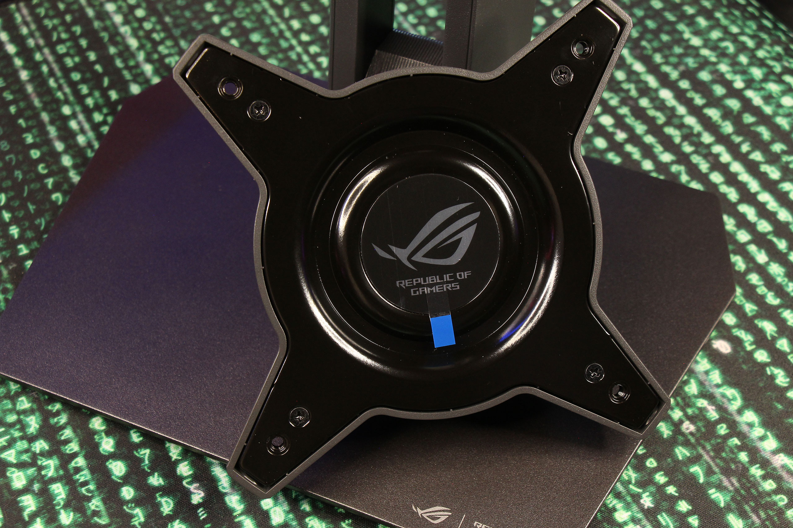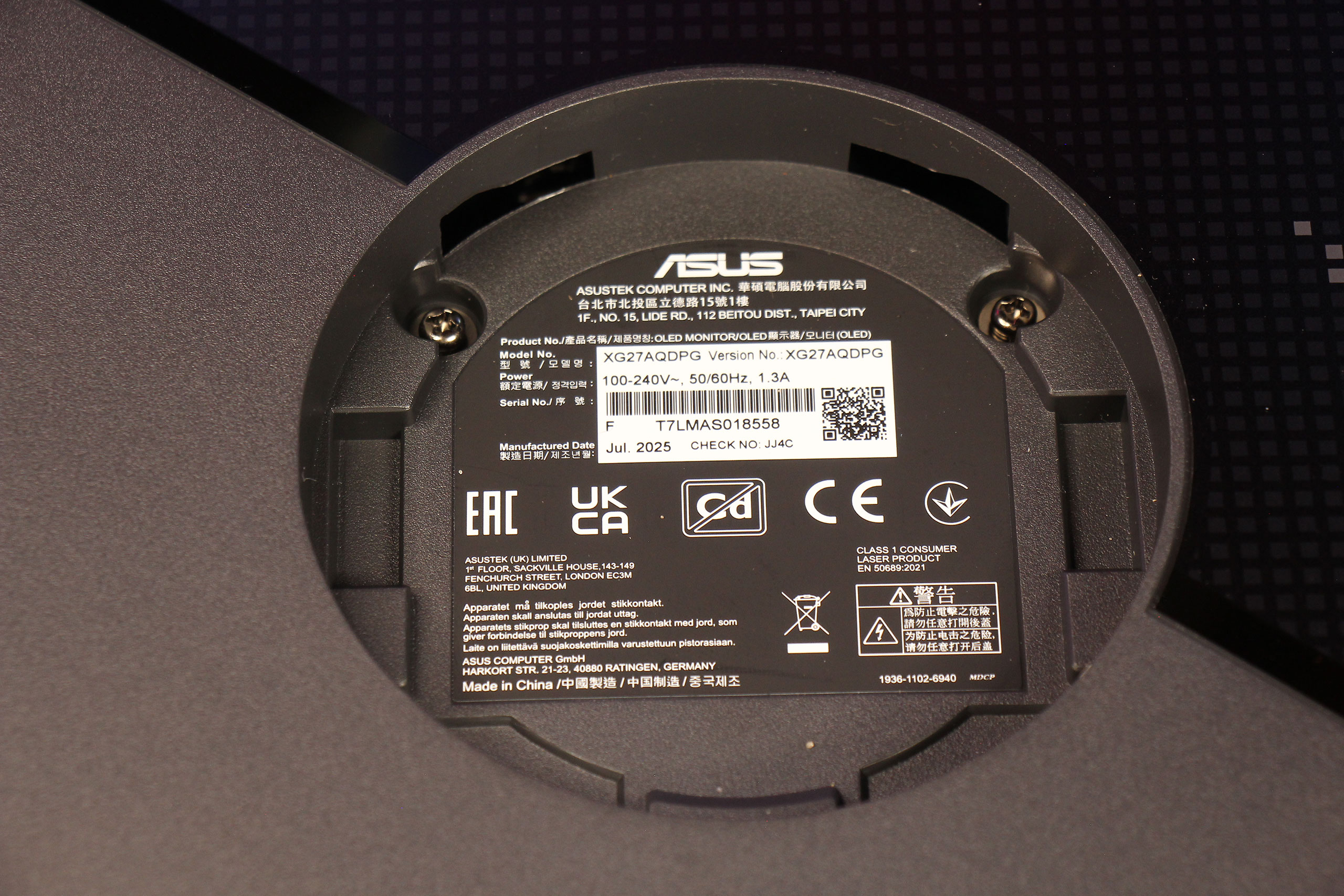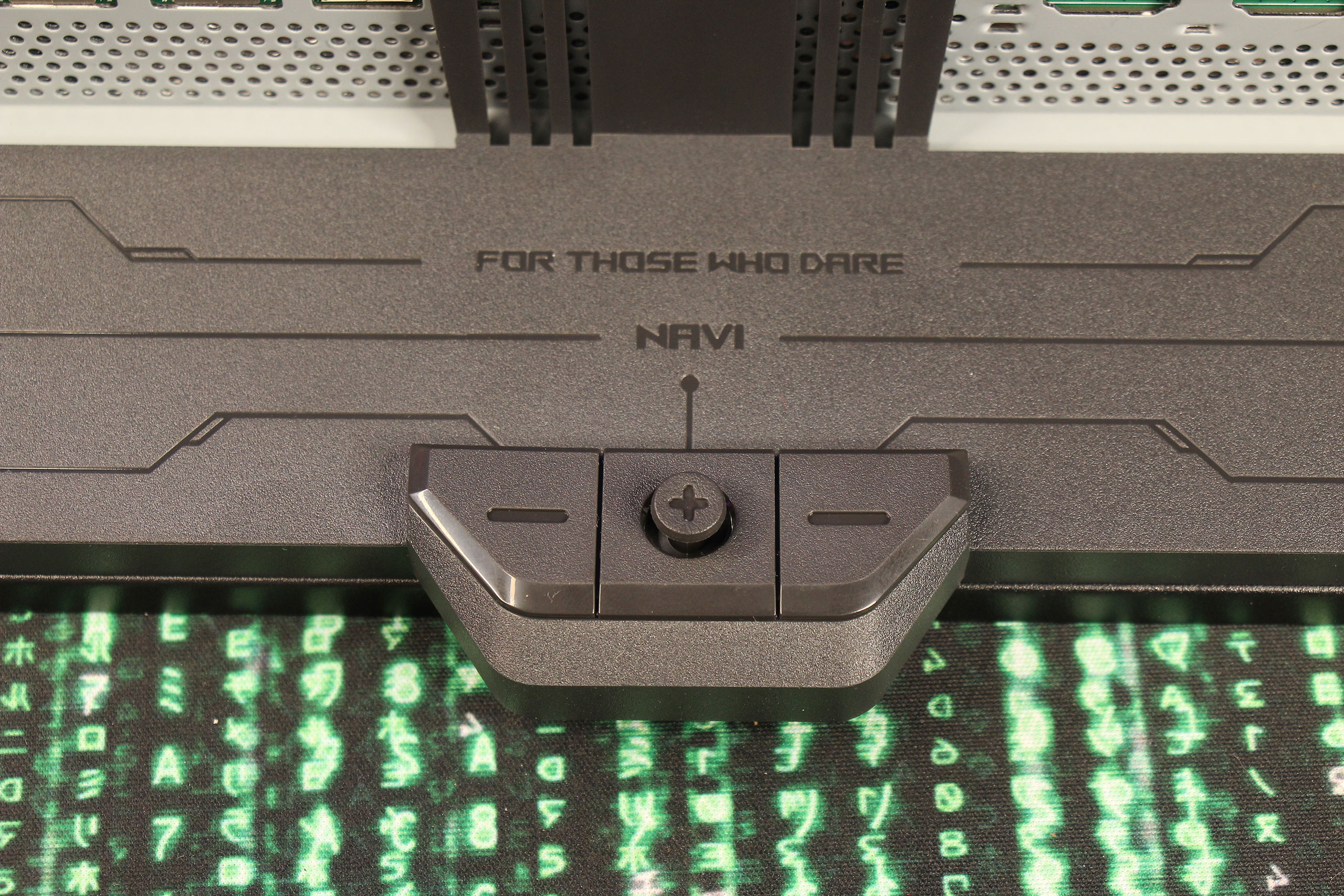 Задняя панель оформлена в киберпанковом (слова производителя!) стиле с футуристическими узорами и RGB-подсветкой Aura Sync в виде эмблемы Republic of Gamers, синхронизирующейся с другими устройствами экосистемы ASUS. Вентиляционные отверстия оптимизированы для эффективного отвода тепла от QD-OLED панели.