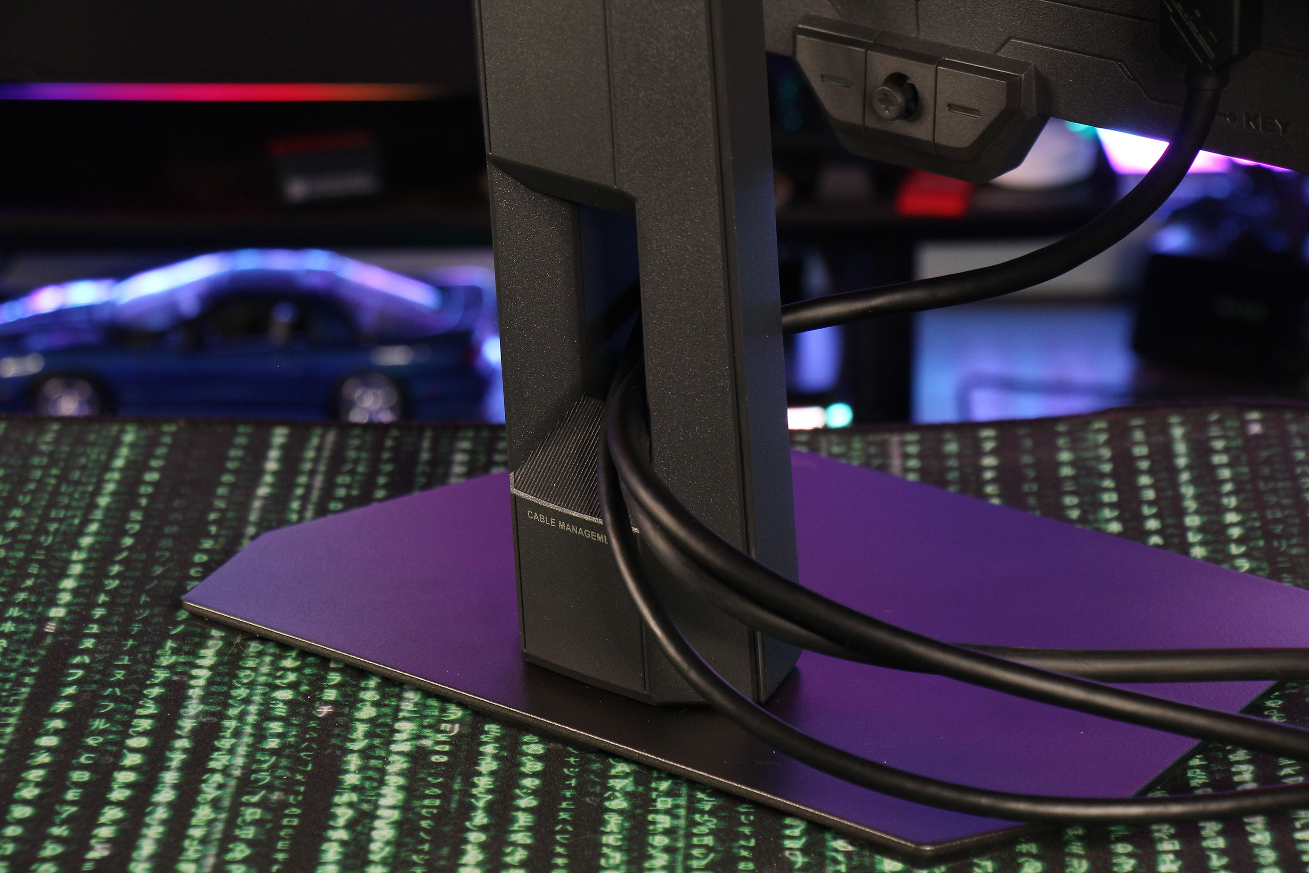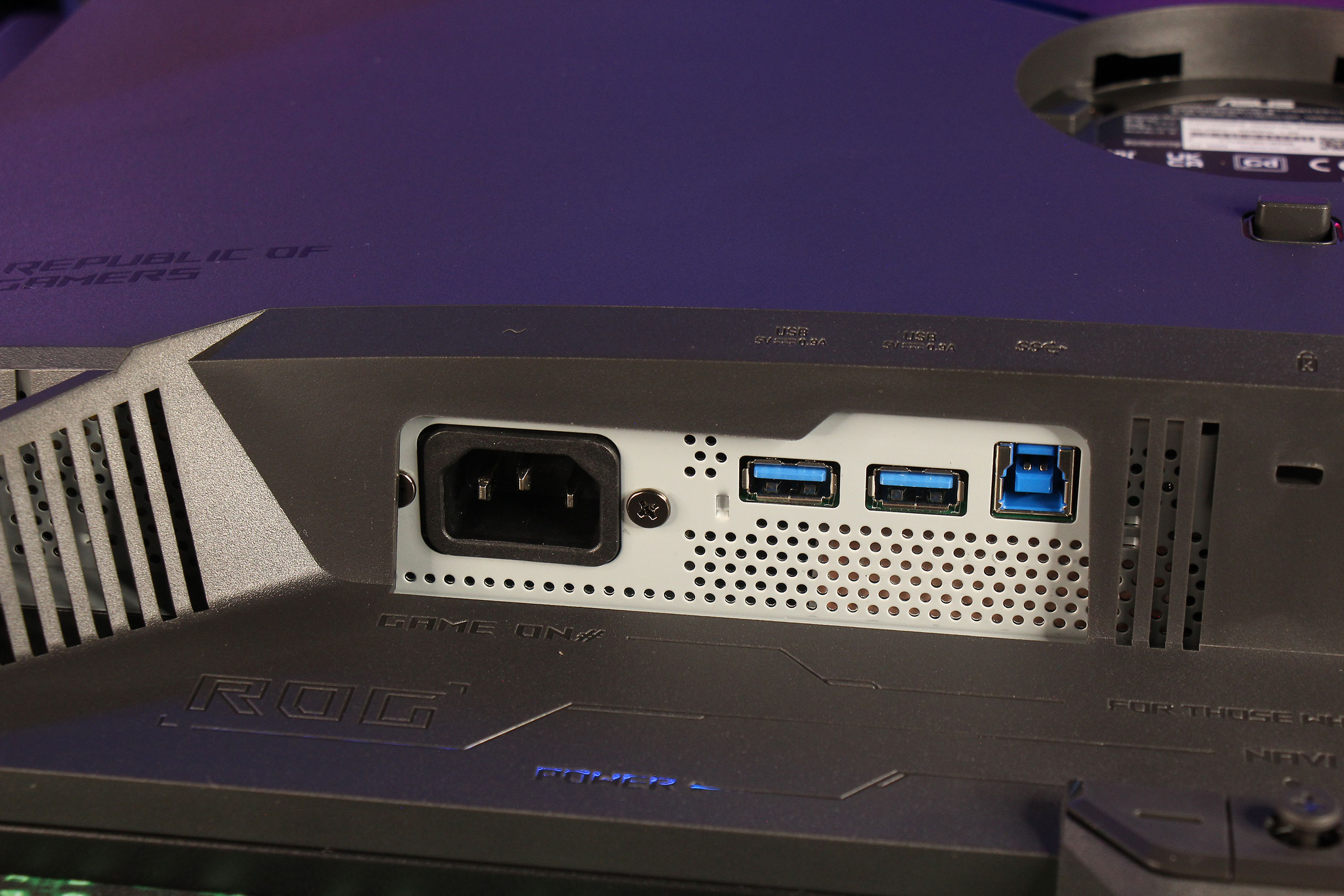 Панель портов расположена в нише под креплением подставки и включает DisplayPort 1.4 с поддержкой полной пропускной способности для 500 Гц, а также два HDMI 2.1 порта для консолей и дополнительных источников. К сожалению, USB‑C не предусмотрен. USB-хаб представляет собой два порта USB‑A 3.2 Gen1, KVM-функциональности нет. Также присутствует 3,5‑мм аудио-выход (как правило, для гарнитуры). Блок питания внутренний, так что монитор имеет стандартную розетку C14. Все перечисленные разъемы размещены вертикально, то есть подключаются снизу, чем экономят пространство за монитором.