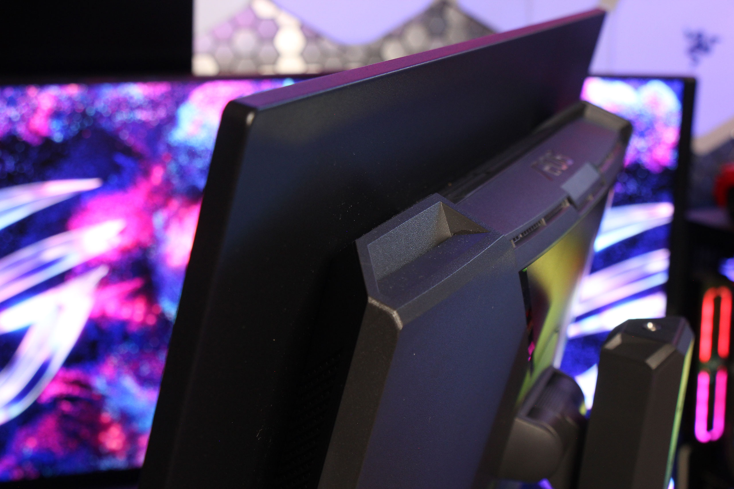 Монитор имеет типичный для OLED-панелей профиль с тонкими краями и массивной центральной частью, где размещена электроника. Впрочем, интересно, что здравый смысл подсказал ASUS не делать профиль «ультратонким», как это часто бывает с OLED. В результате, ощущается это все как экран ноутбука, а не как стекло без рамки и это хорошо.