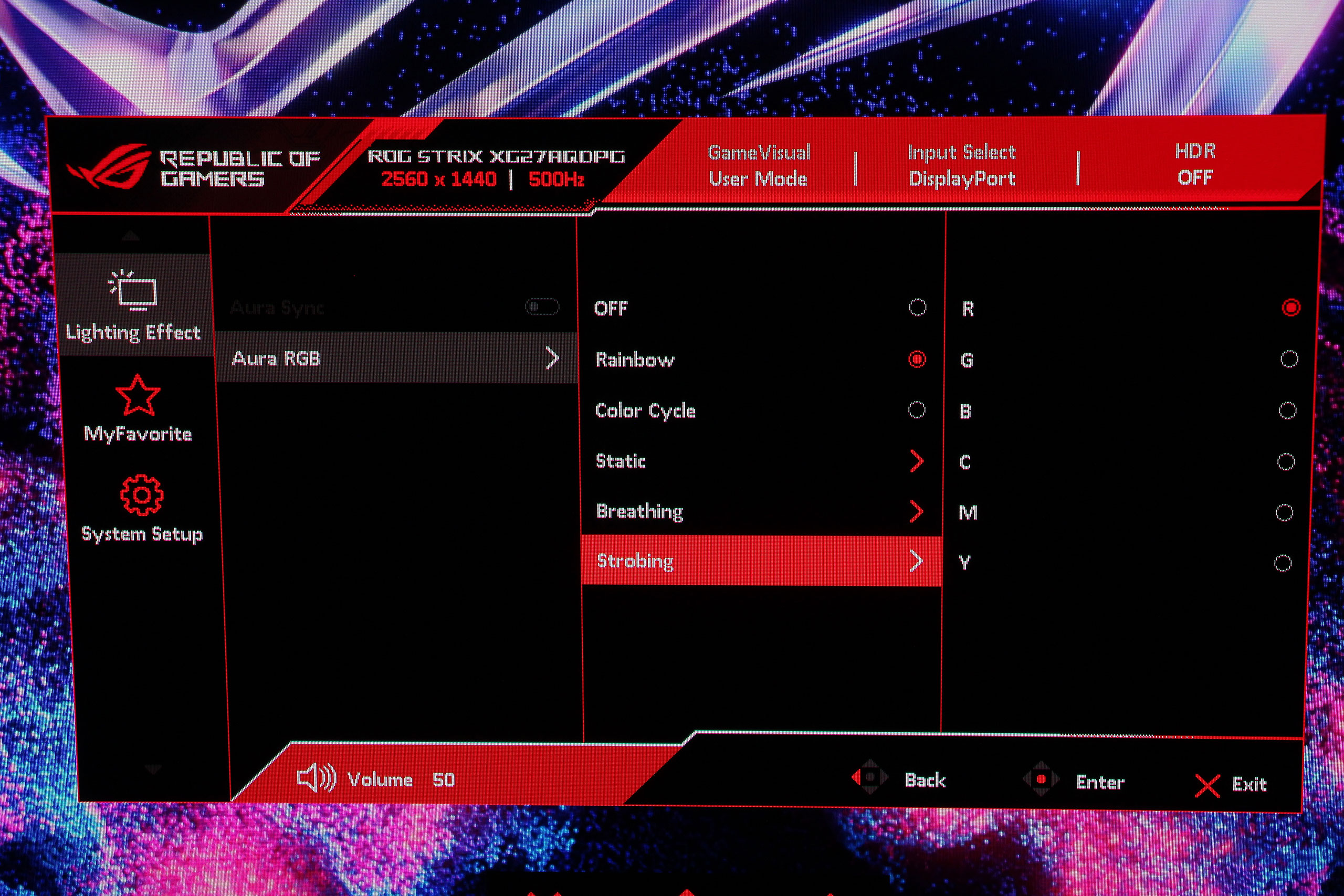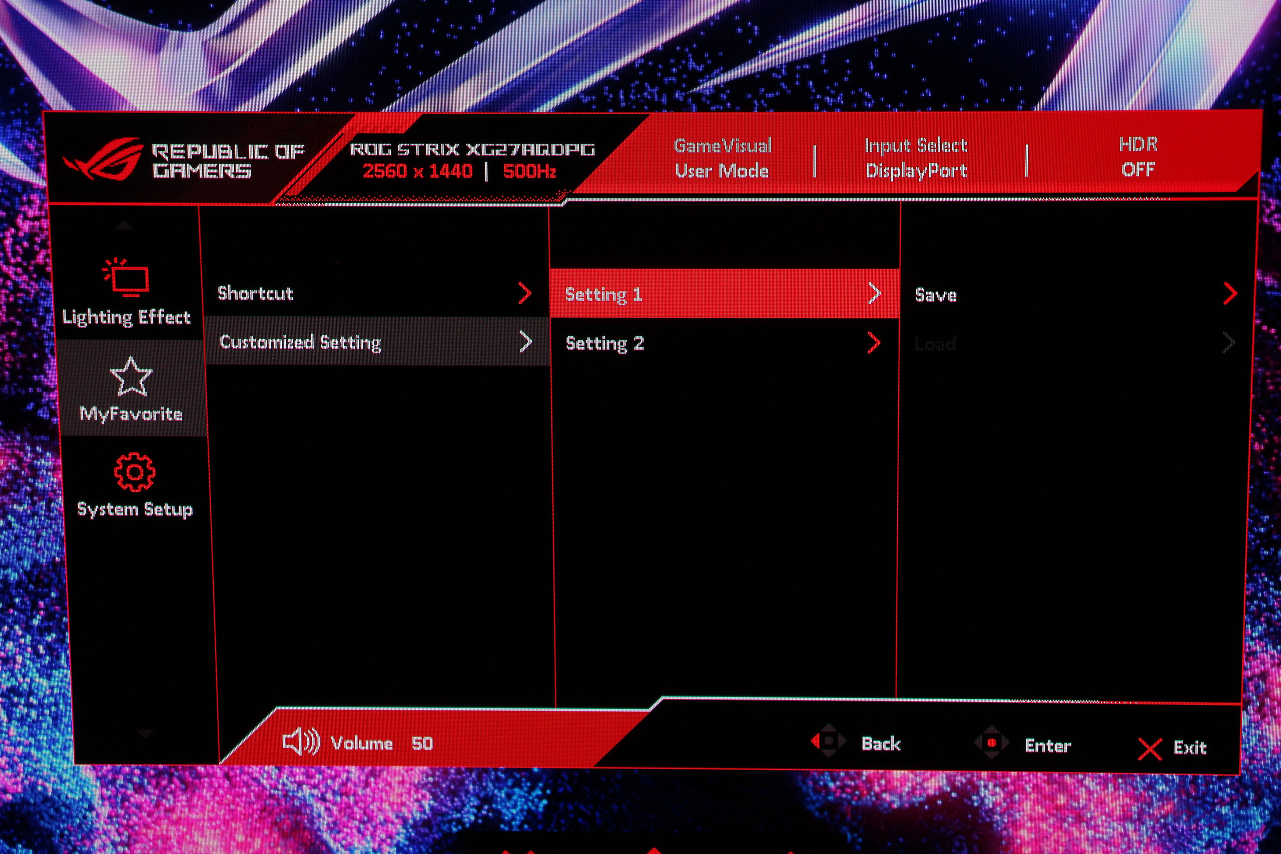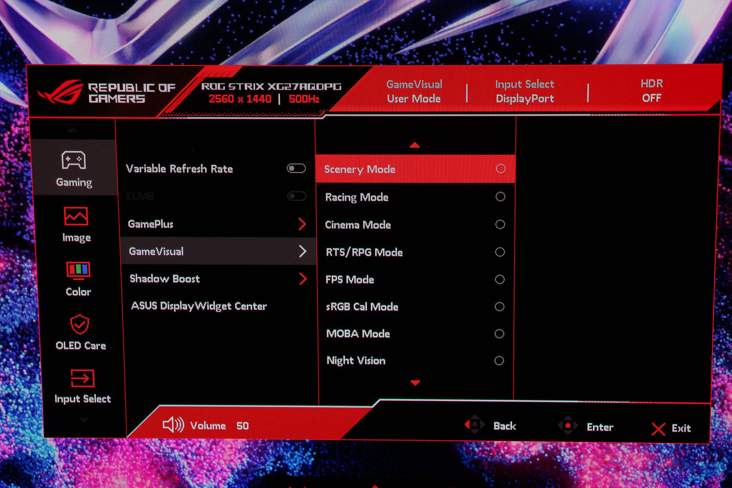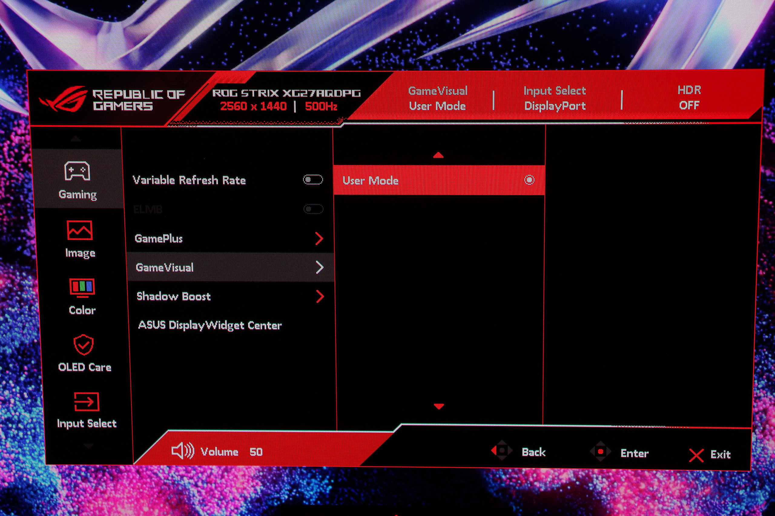 Экранное меню ASUS имеет традиционную для ROG структуру с интуитивной навигацией через 5‑позиционный джойстик. Интерфейс организован в несколько основных разделов с быстрым доступом к ключевым функциям. Пункт GameVisual предлагает оптимизированные профили для различных жанров игр: Scenery, Racing, Cinema, RTS/RPG, FPS, sRGB, MOBA, Night VIsion и User Mode. Каждый режим имеет предварительно настроенные параметры яркости, контраста и цветопередачи, а также некоторые дополнительные, при этом большинство режимов позволяют изменять и сохранять большинство параметров (то есть, фактически все они являются User-режимами). Странная получилась формулировка, но она честная, а более точная потребовала бы детального перечня ограничений каждого из режимов.