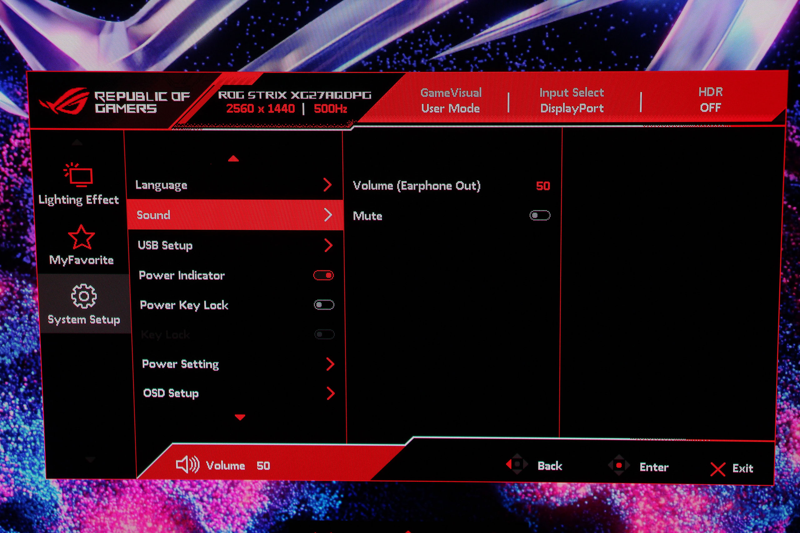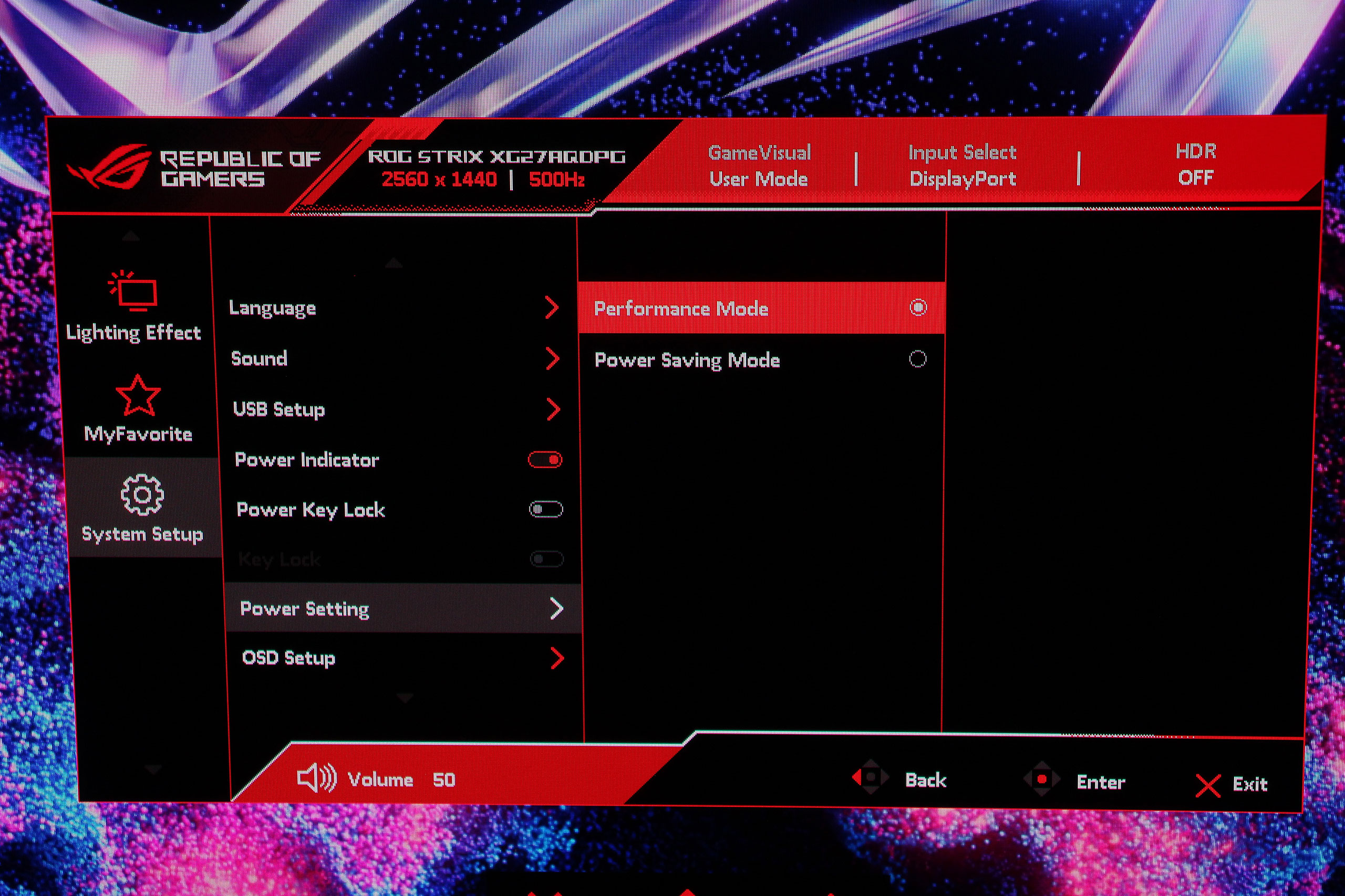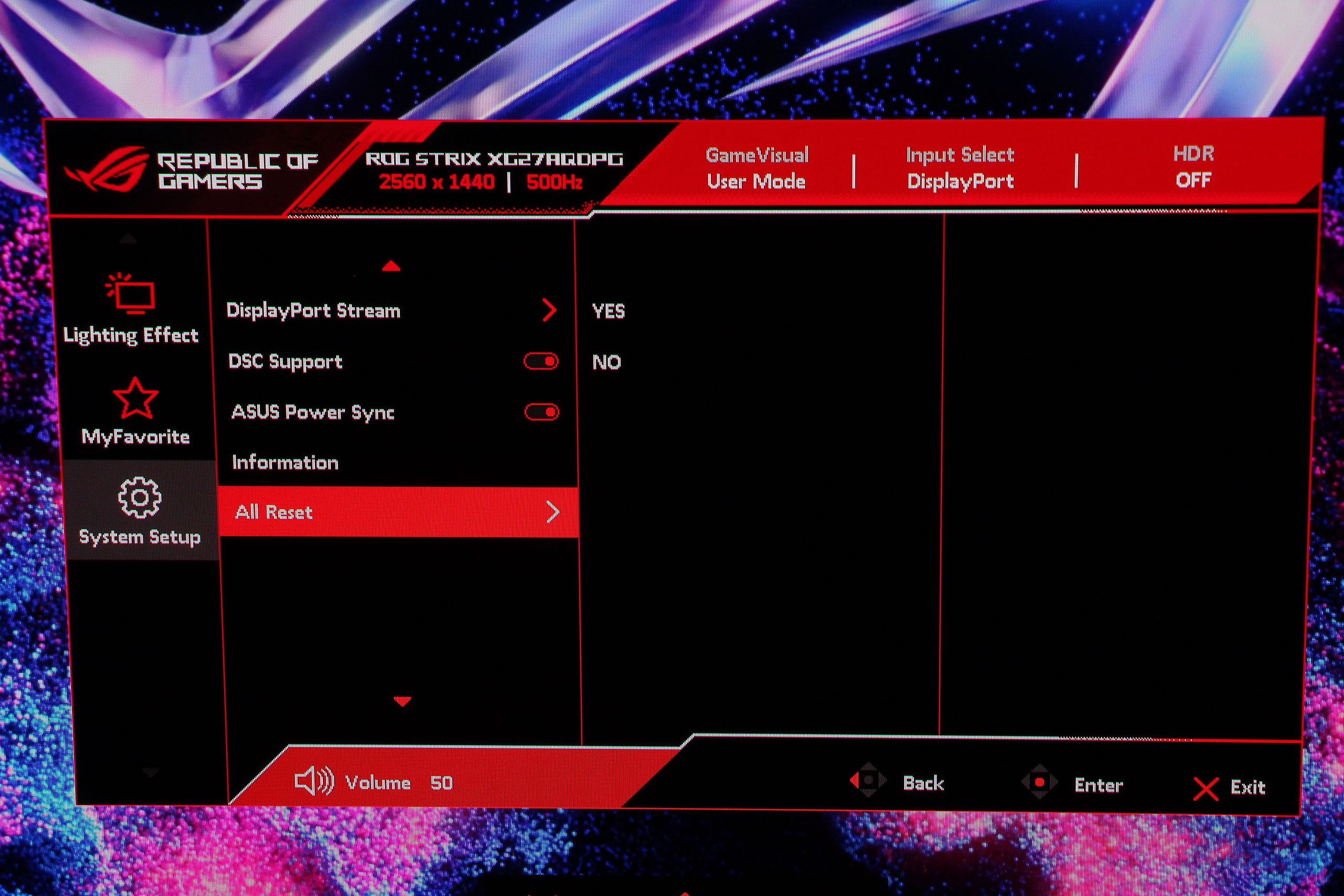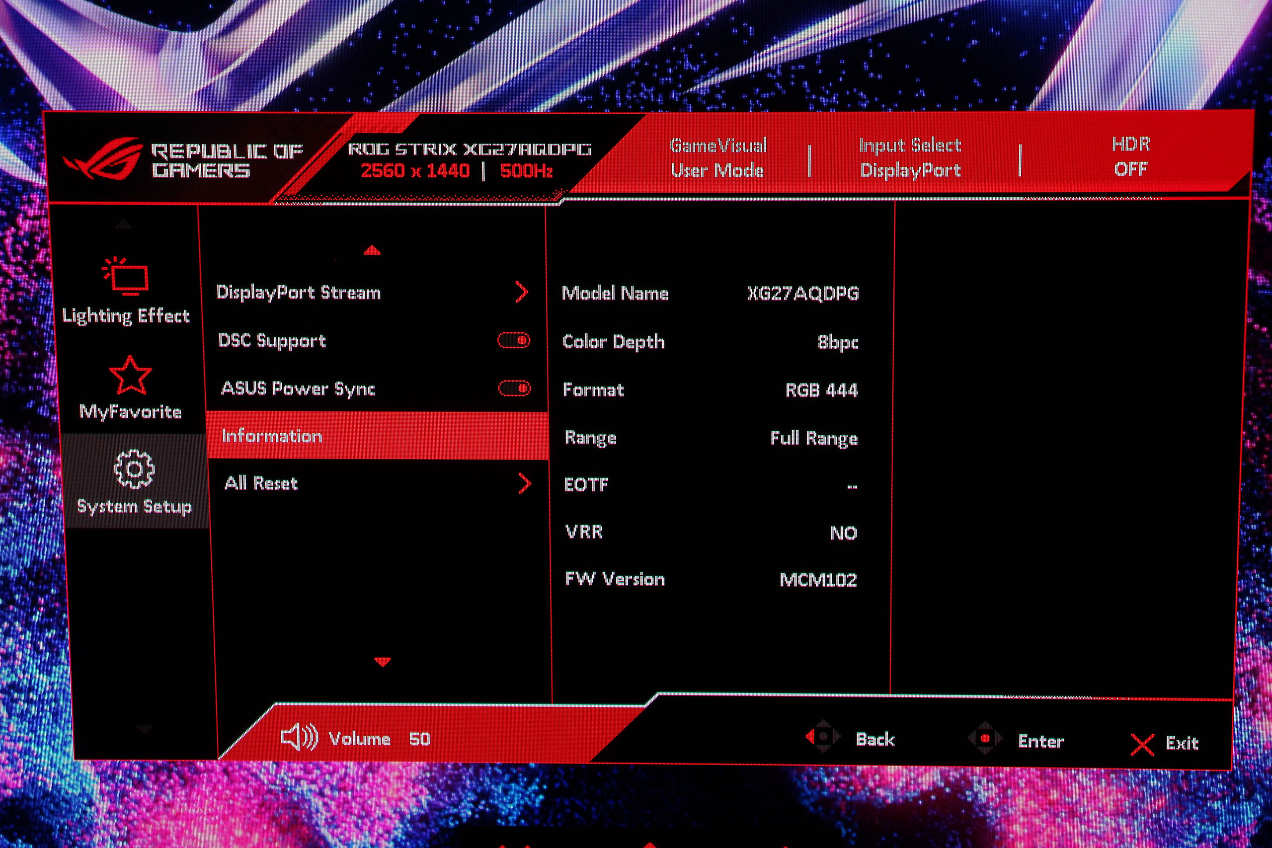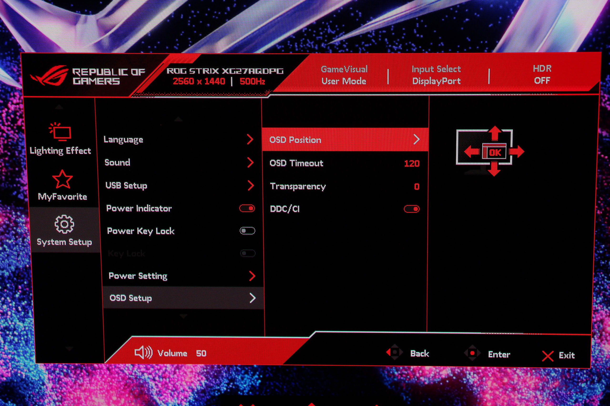 Экранное меню ASUS имеет традиционную для ROG структуру с интуитивной навигацией через 5‑позиционный джойстик. Интерфейс организован в несколько основных разделов с быстрым доступом к ключевым функциям. Пункт GameVisual предлагает оптимизированные профили для различных жанров игр: Scenery, Racing, Cinema, RTS/RPG, FPS, sRGB, MOBA, Night VIsion и User Mode. Каждый режим имеет предварительно настроенные параметры яркости, контраста и цветопередачи, а также некоторые дополнительные, при этом большинство режимов позволяют изменять и сохранять большинство параметров (то есть, фактически все они являются User-режимами). Странная получилась формулировка, но она честная, а более точная потребовала бы детального перечня ограничений каждого из режимов.