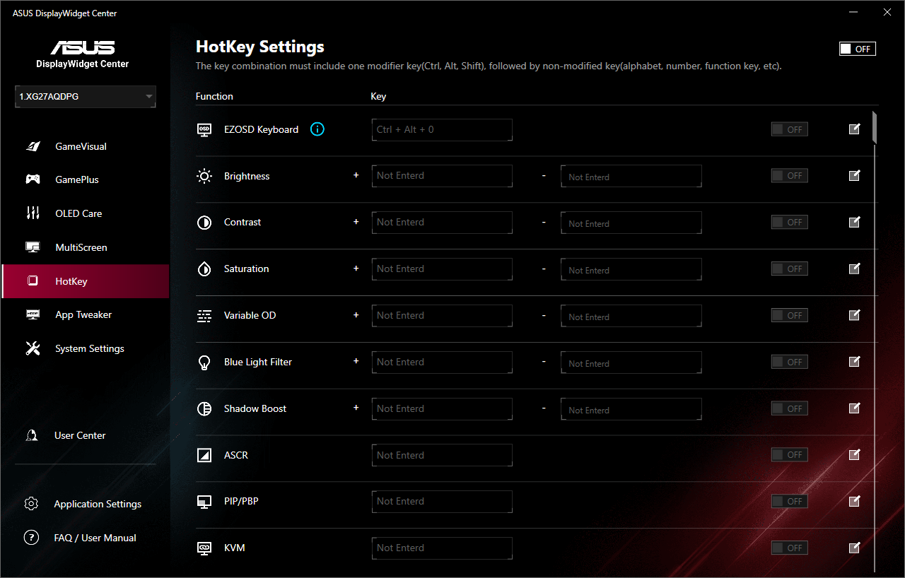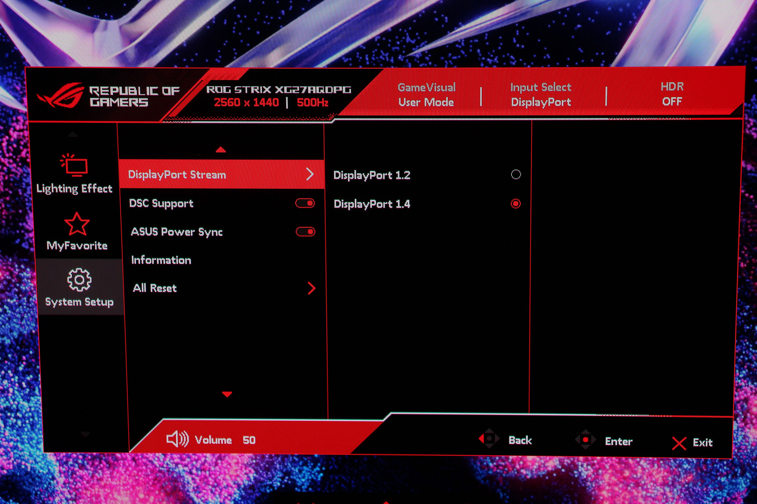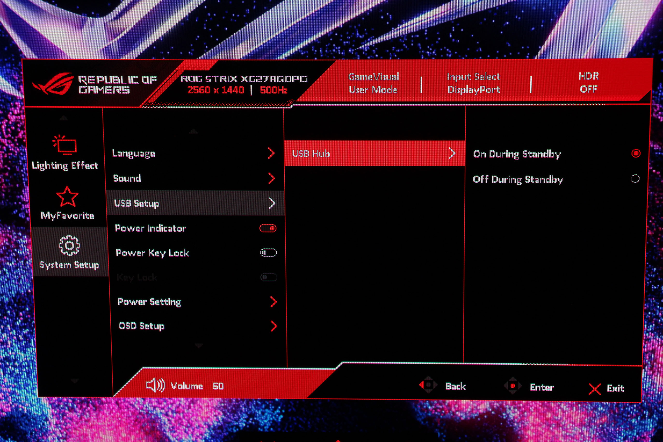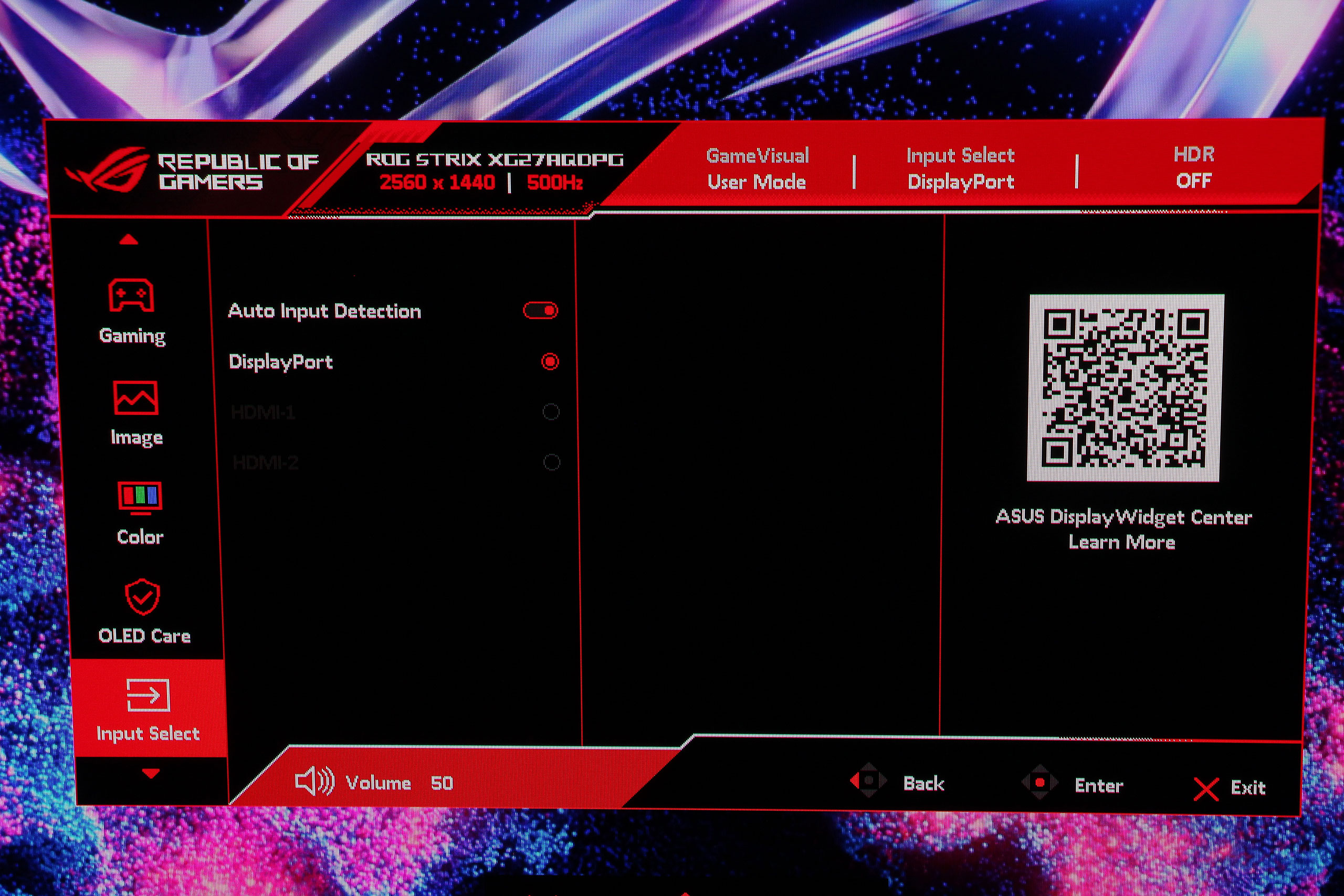 Экранное меню ASUS имеет традиционную для ROG структуру с интуитивной навигацией через 5‑позиционный джойстик. Интерфейс организован в несколько основных разделов с быстрым доступом к ключевым функциям. Пункт GameVisual предлагает оптимизированные профили для различных жанров игр: Scenery, Racing, Cinema, RTS/RPG, FPS, sRGB, MOBA, Night VIsion и User Mode. Каждый режим имеет предварительно настроенные параметры яркости, контраста и цветопередачи, а также некоторые дополнительные, при этом большинство режимов позволяют изменять и сохранять большинство параметров (то есть, фактически все они являются User-режимами). Странная получилась формулировка, но она честная, а более точная потребовала бы детального перечня ограничений каждого из режимов.