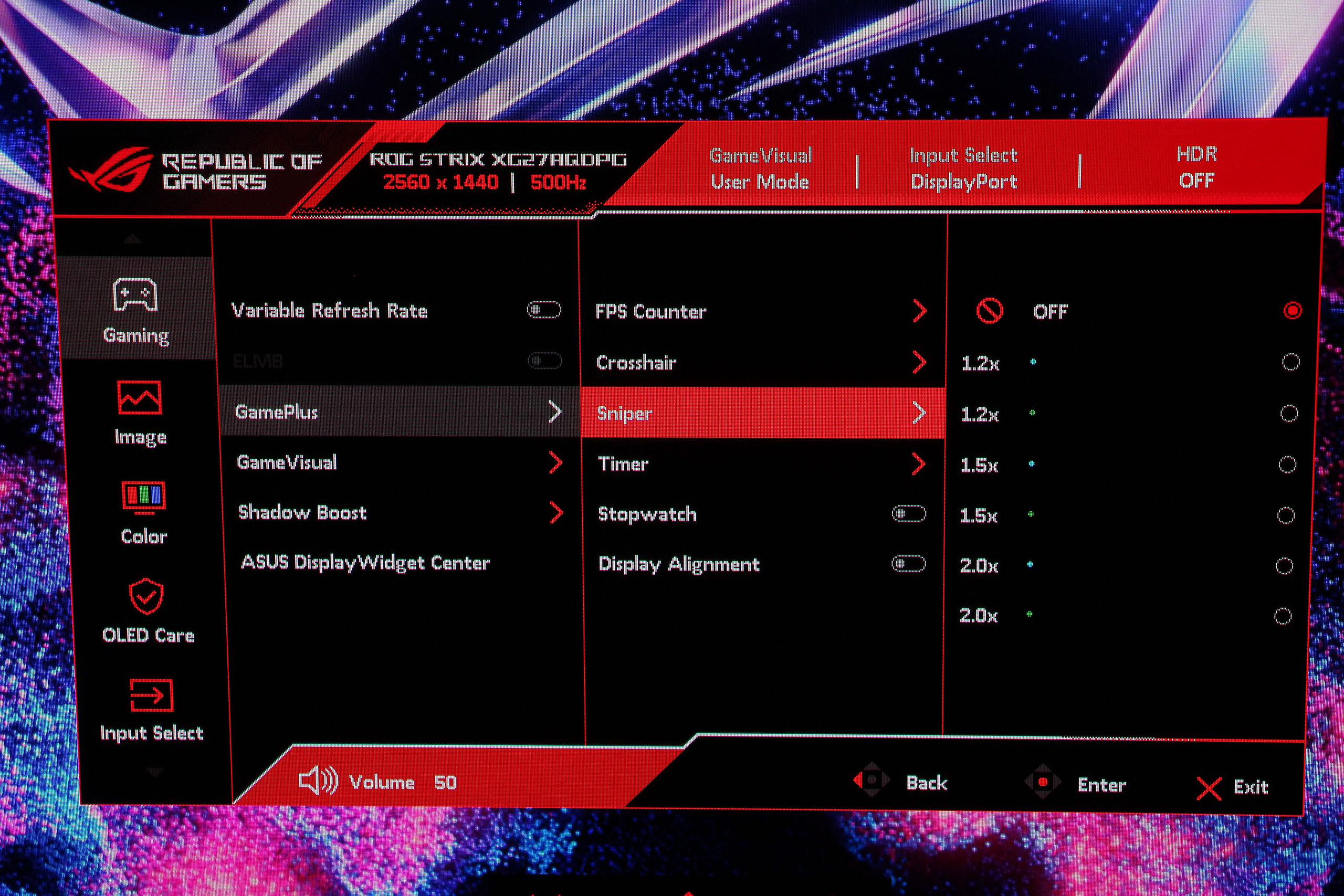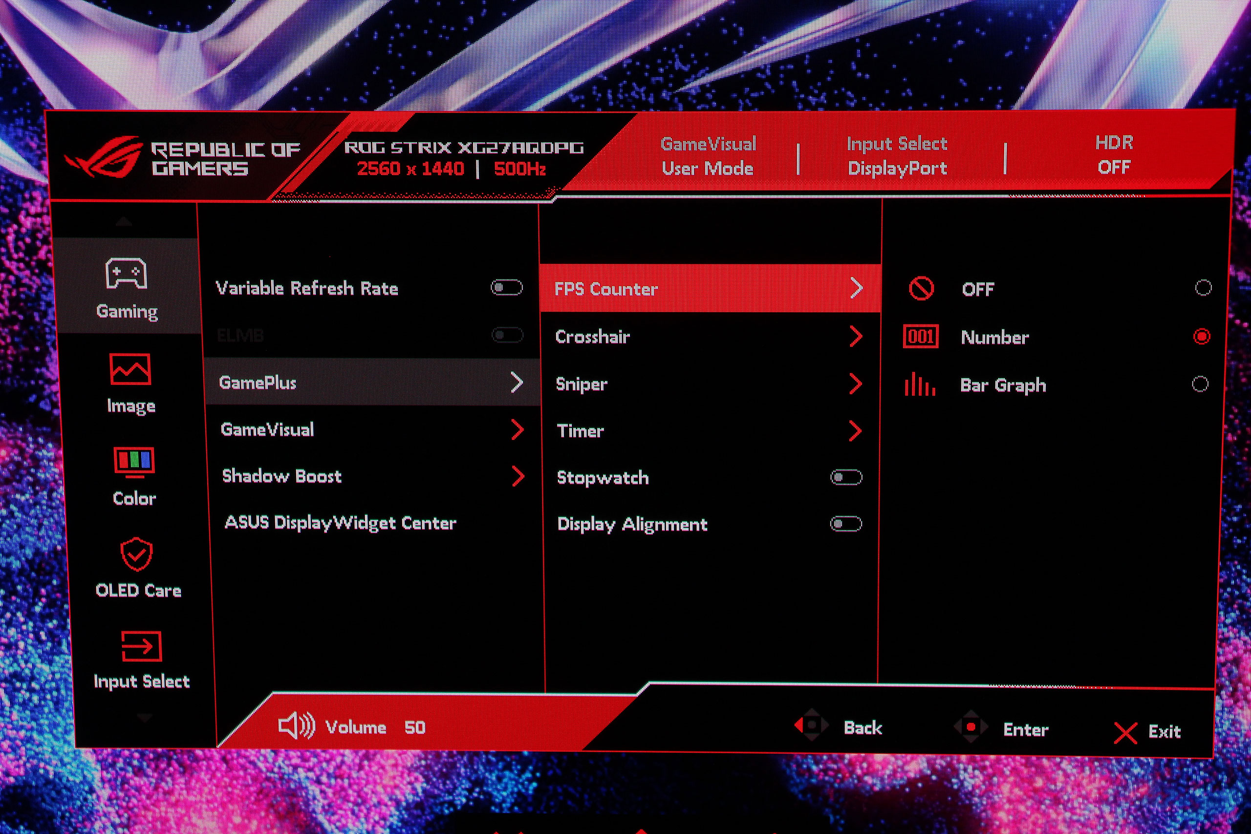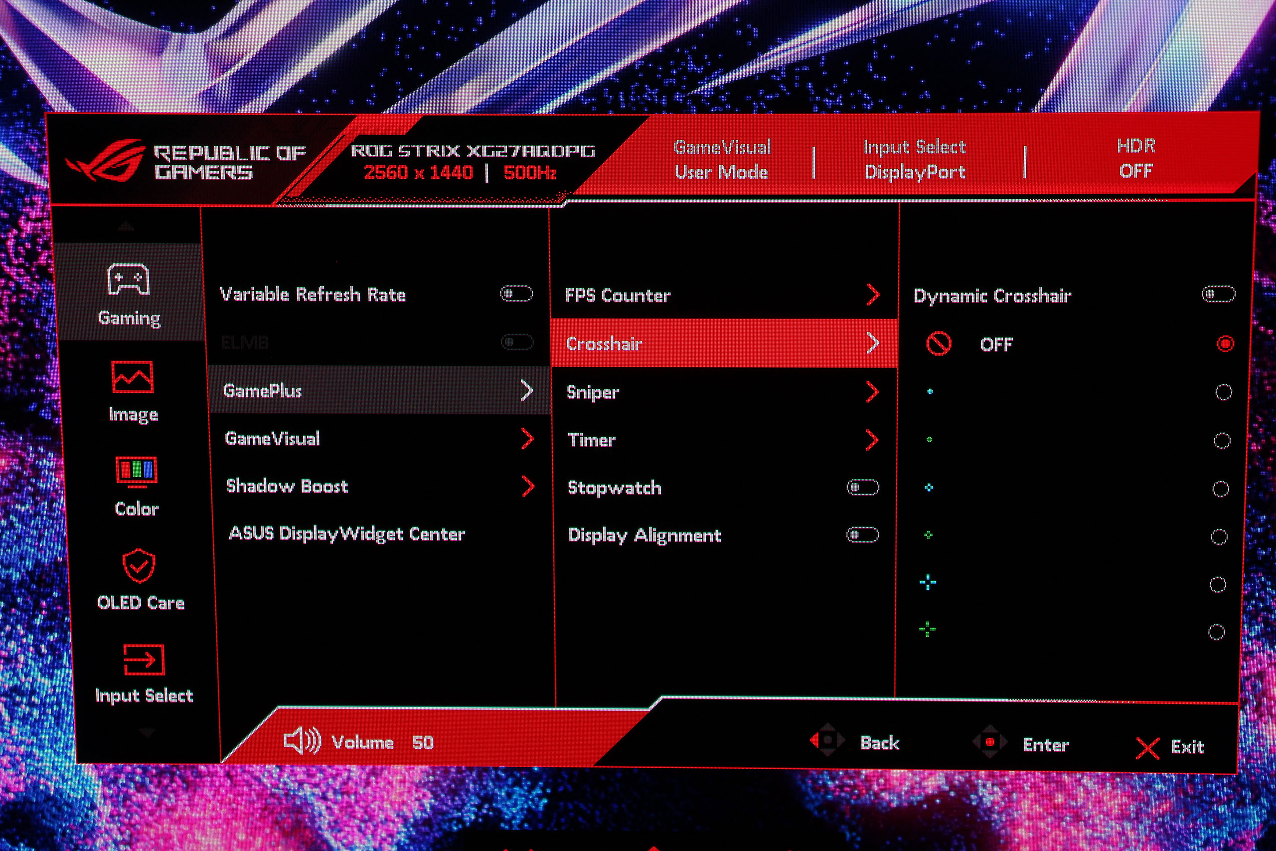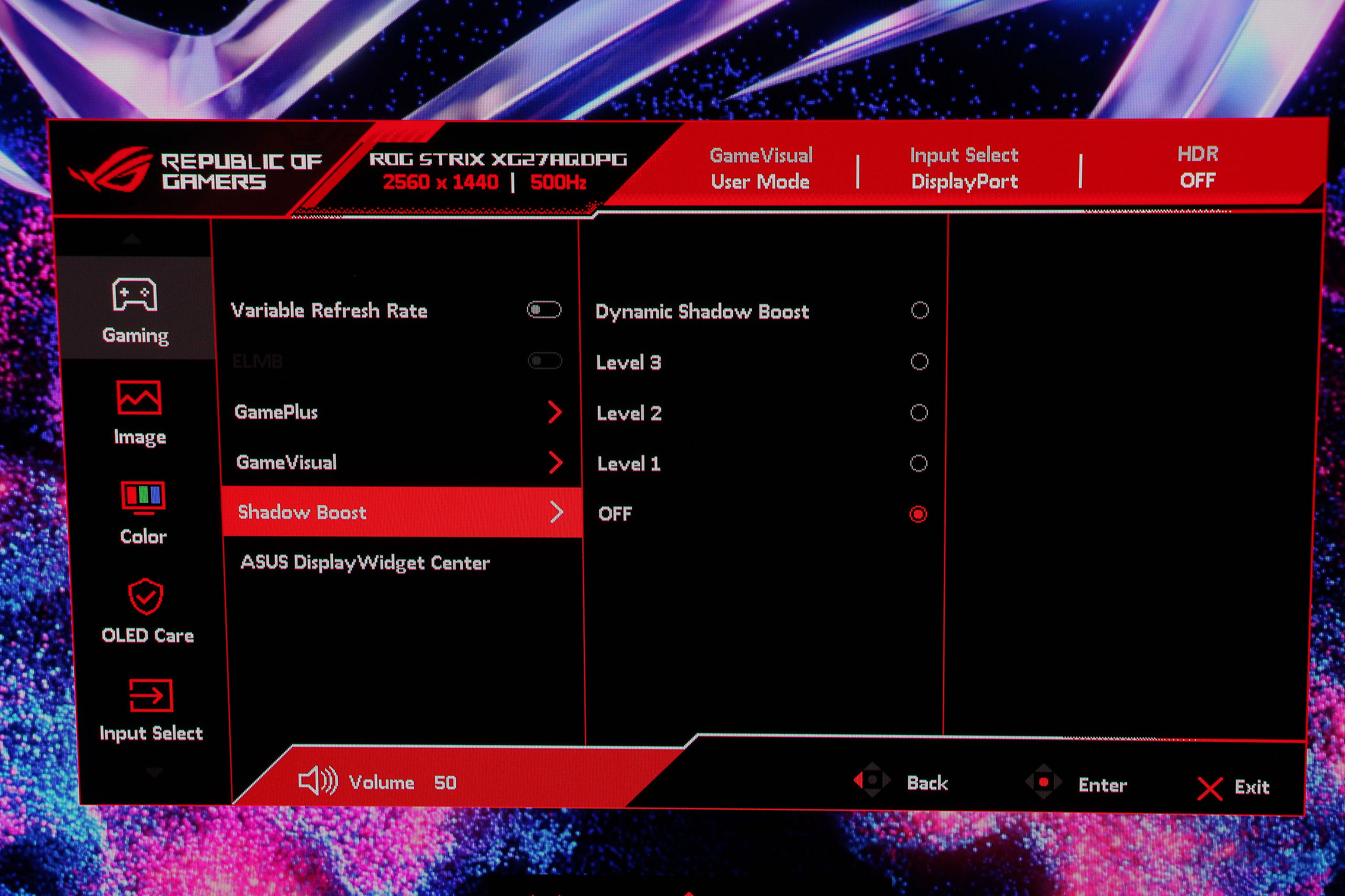 Вкладка Gaming также содержит настройки адаптивной синхронизации, ELMB (Extreme Low Motion Blur), GamePlus с функциями перекрестия, таймера и FPS-счетчика. Отдельно стоит отметить Shadow Boost для улучшения видимости в темных зонах. Также отдельно стоит отметить полное отсутствие намеков на какой-то Overdrive — 500-герцовому OLED это просто не нужно!