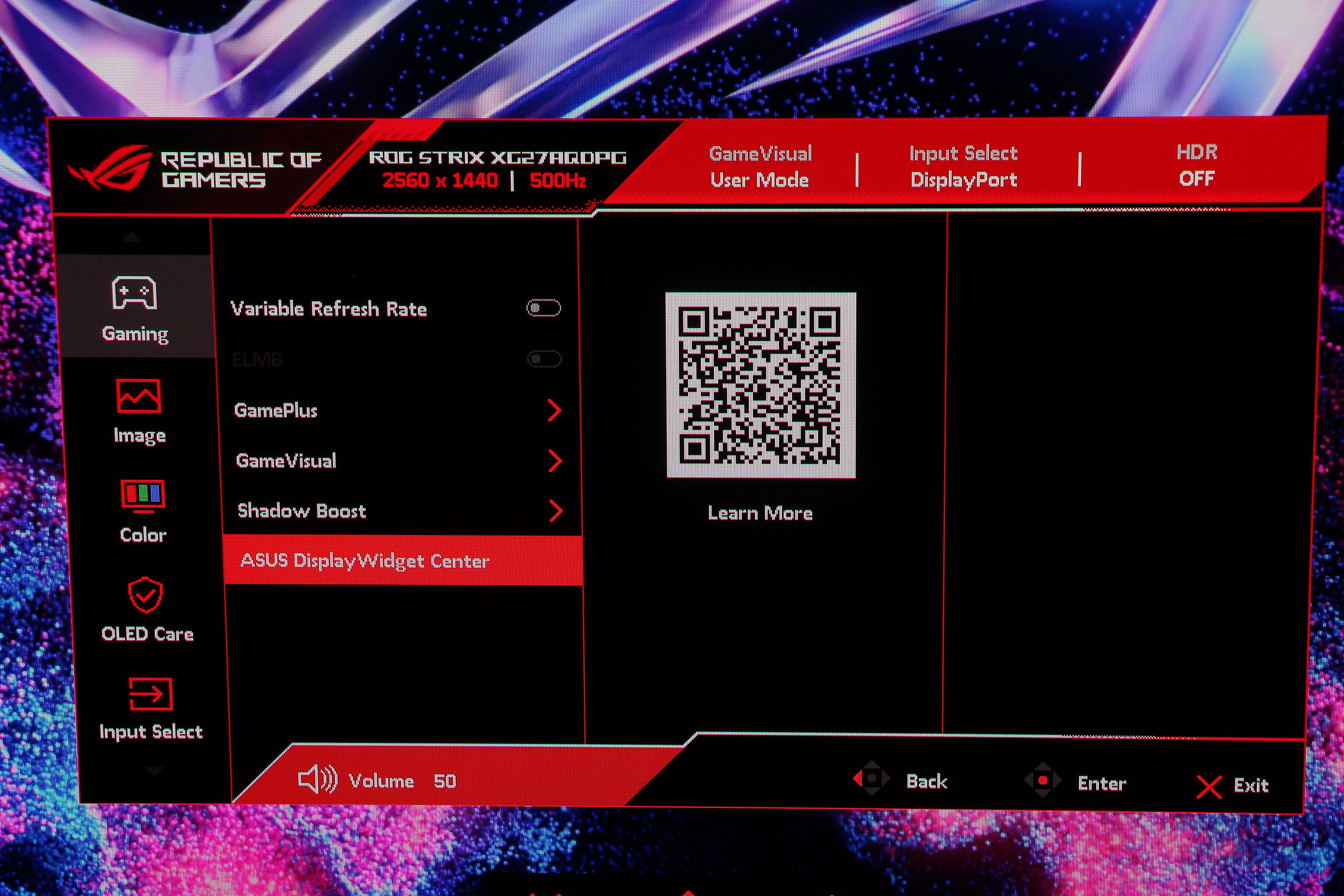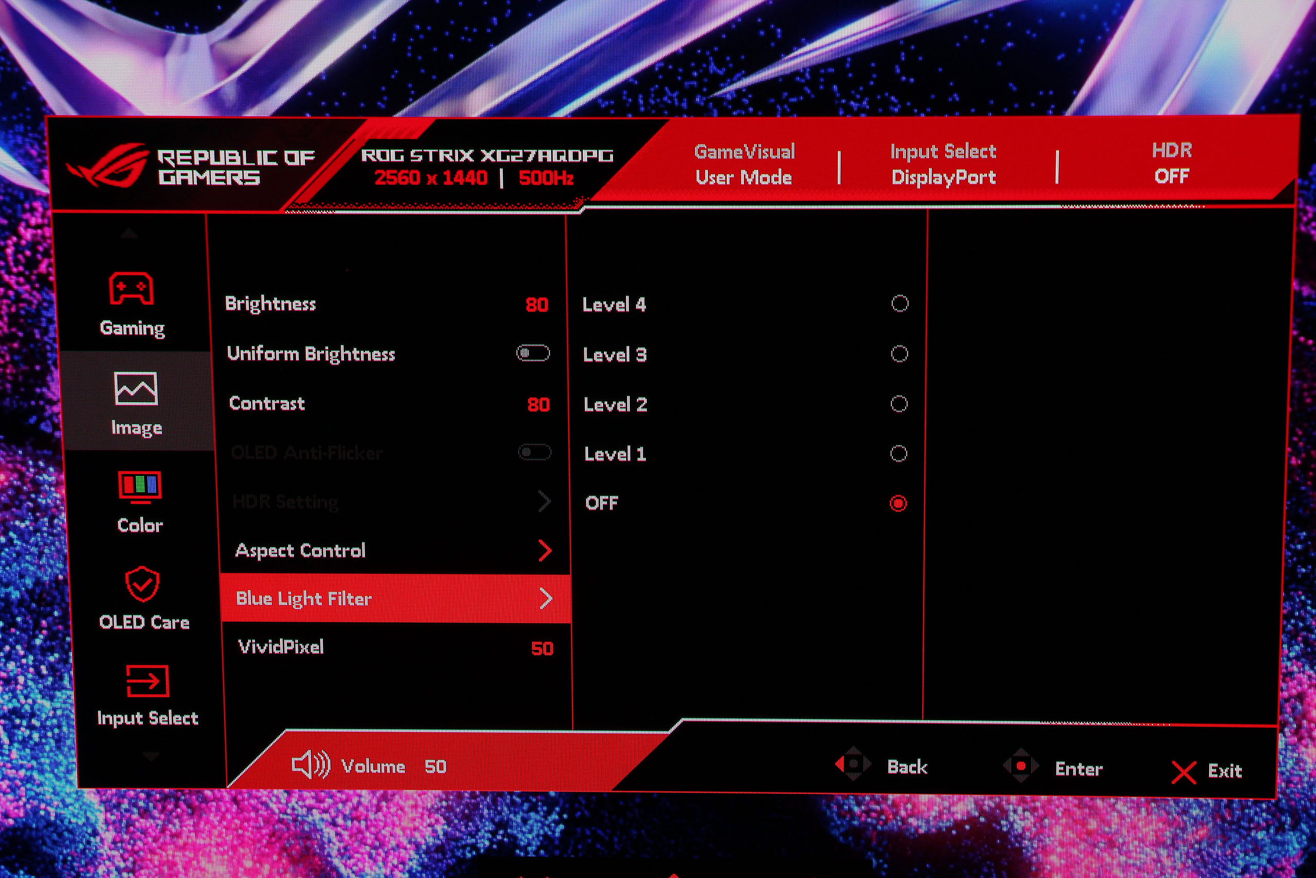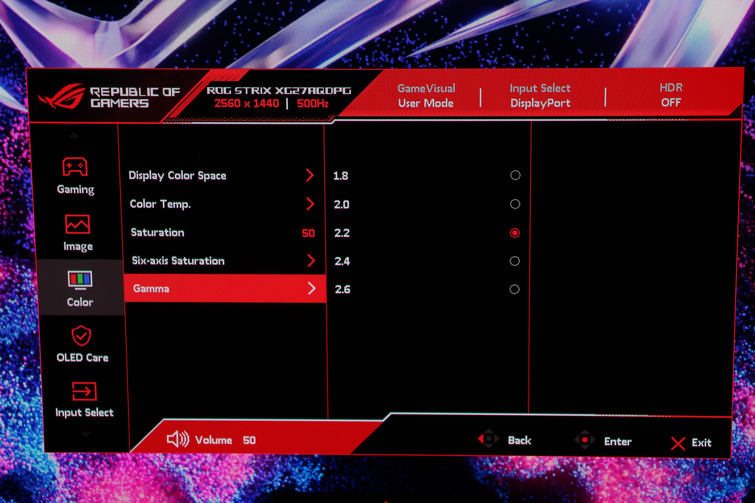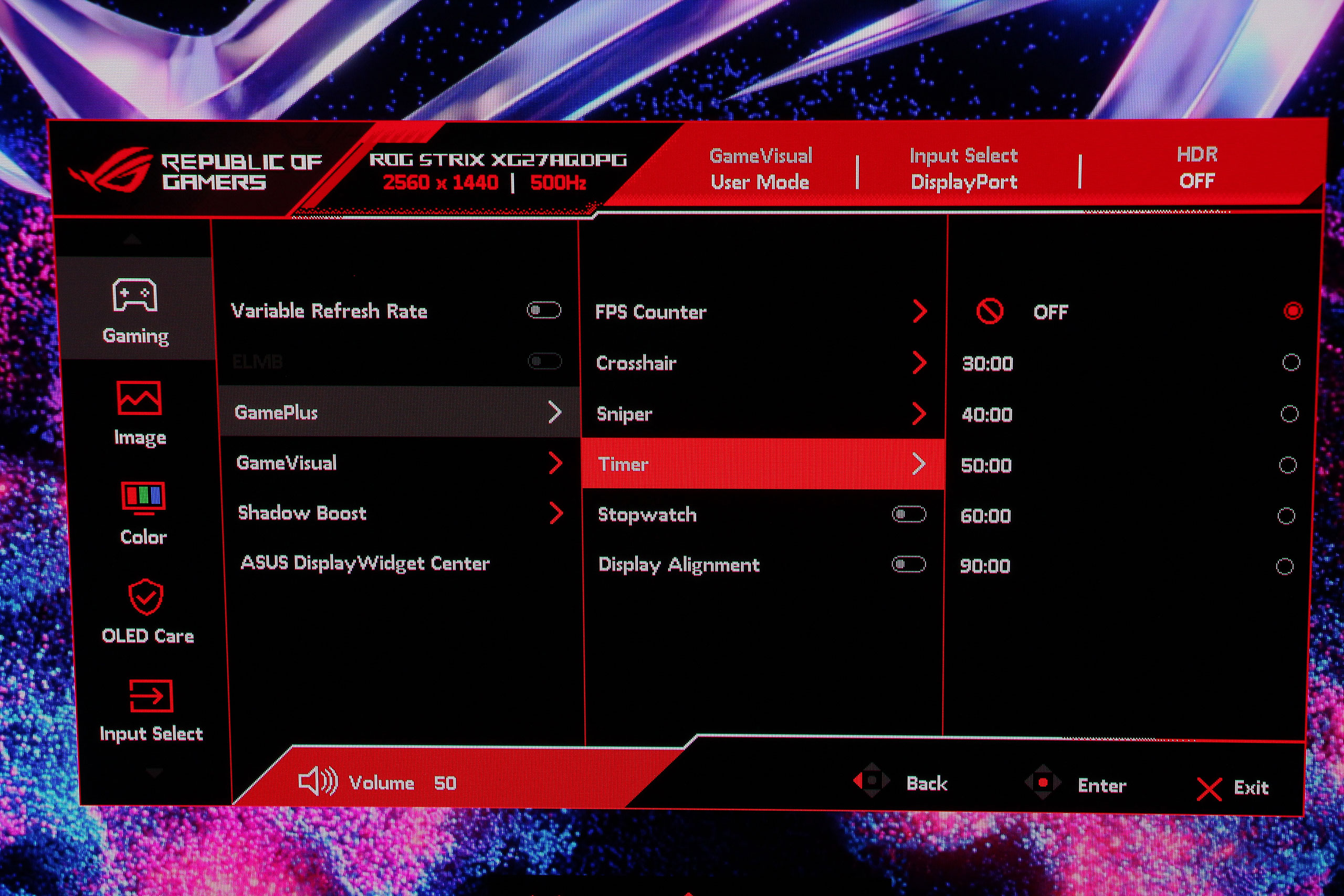 Вкладка Gaming также содержит настройки адаптивной синхронизации, ELMB (Extreme Low Motion Blur), GamePlus с функциями перекрестия, таймера и FPS-счетчика. Отдельно стоит отметить Shadow Boost для улучшения видимости в темных зонах. Также отдельно стоит отметить полное отсутствие намеков на какой-то Overdrive — 500-герцовому OLED это просто не нужно!