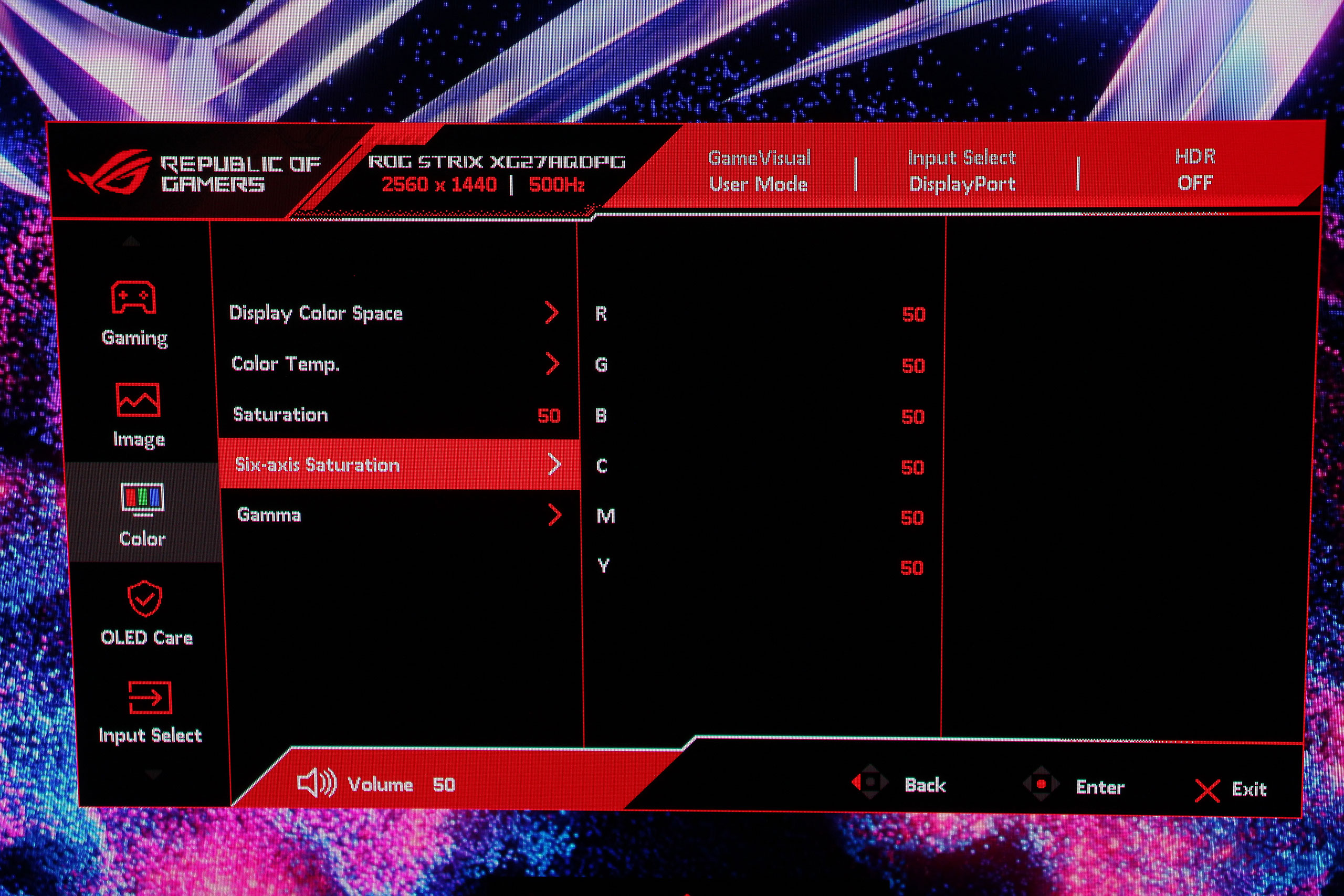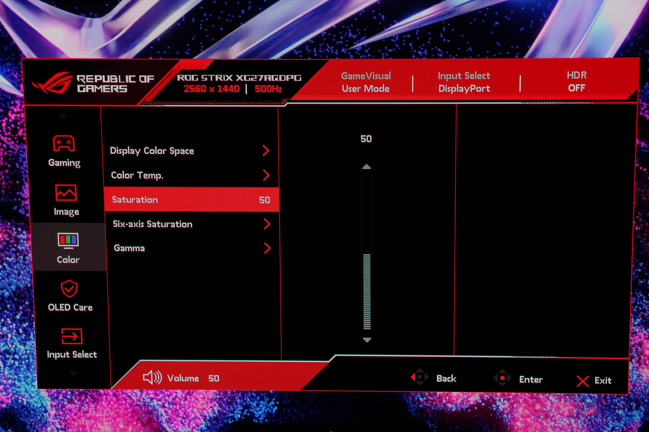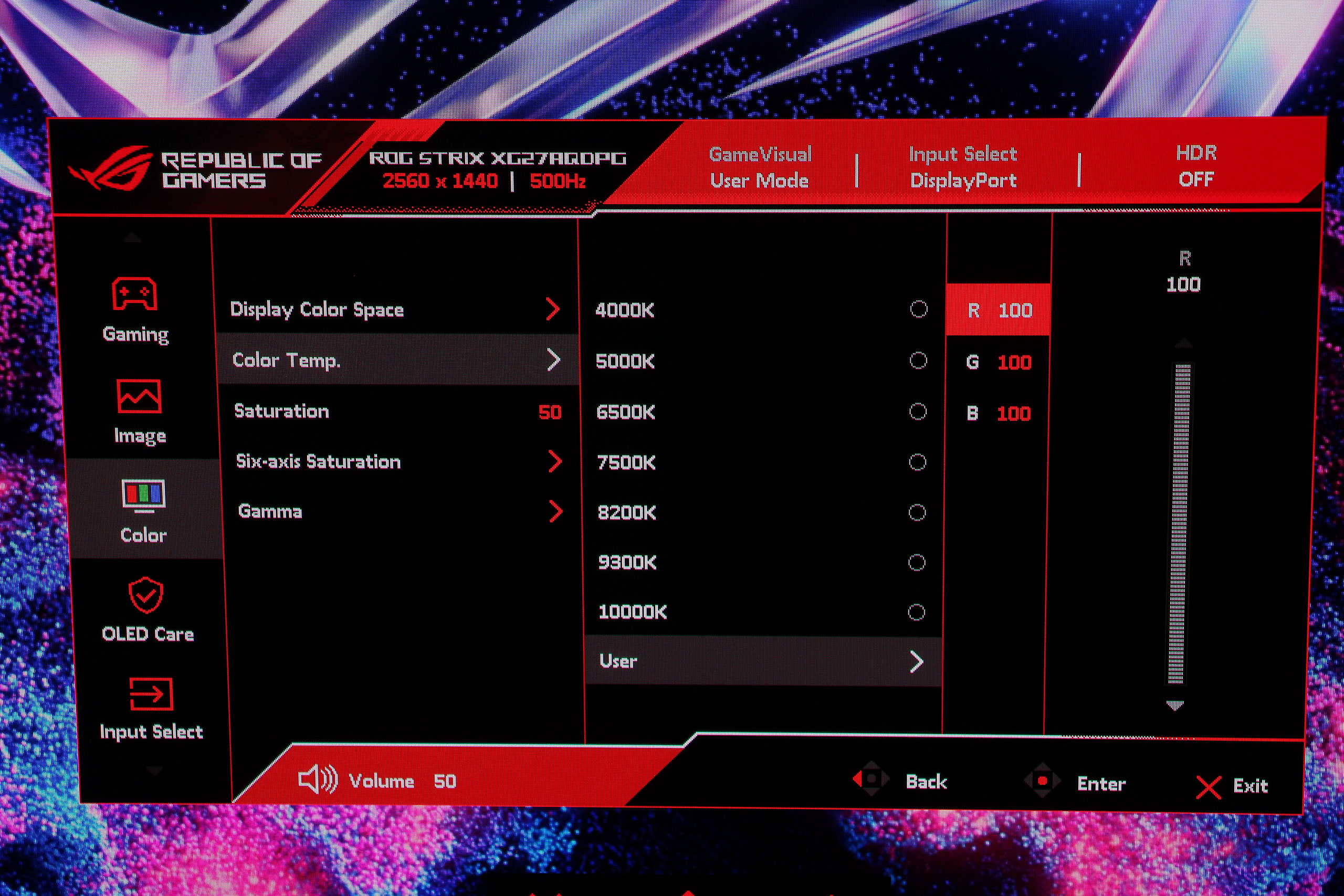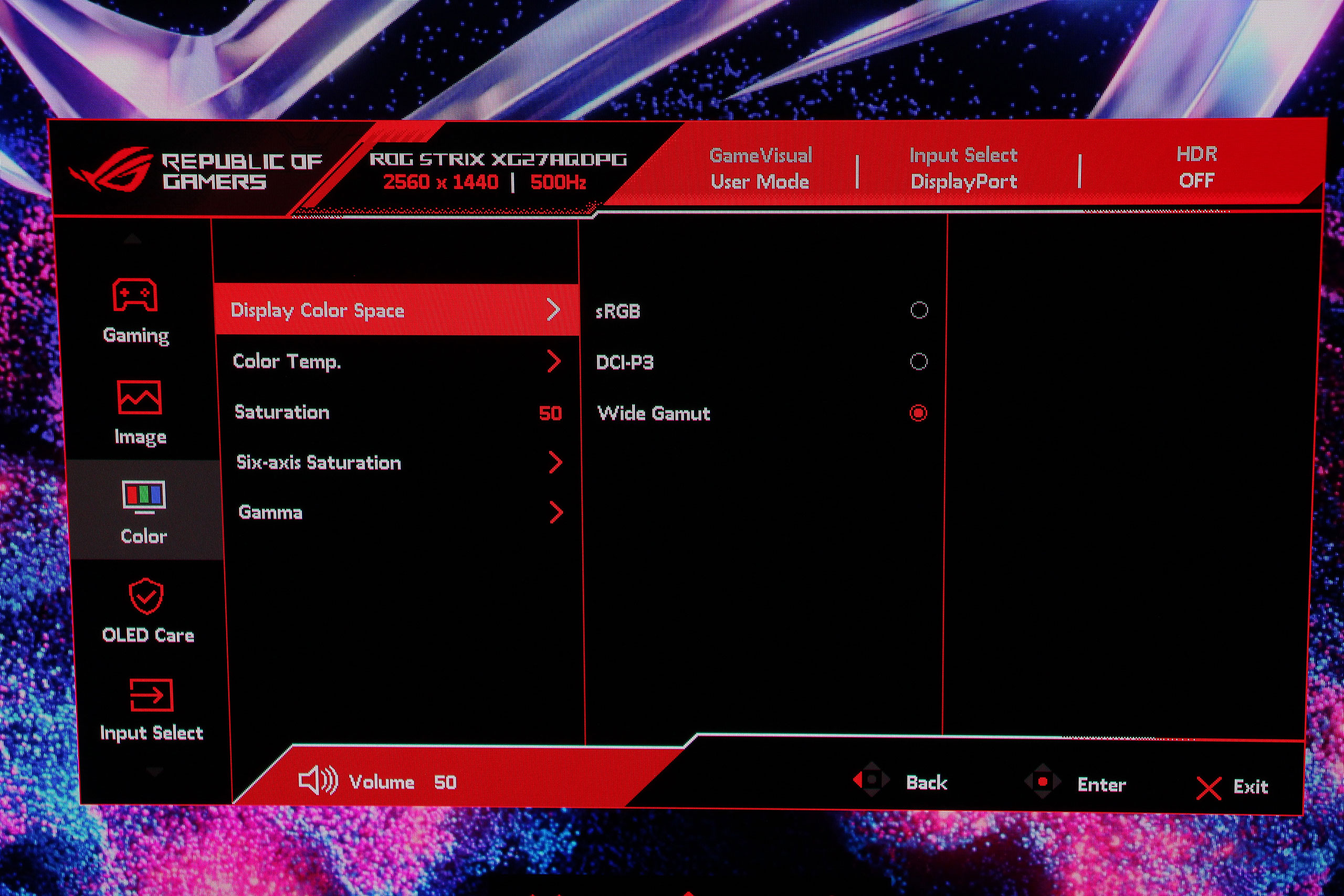 Вкладка Gaming также содержит настройки адаптивной синхронизации, ELMB (Extreme Low Motion Blur), GamePlus с функциями перекрестия, таймера и FPS-счетчика. Отдельно стоит отметить Shadow Boost для улучшения видимости в темных зонах. Также отдельно стоит отметить полное отсутствие намеков на какой-то Overdrive — 500-герцовому OLED это просто не нужно!