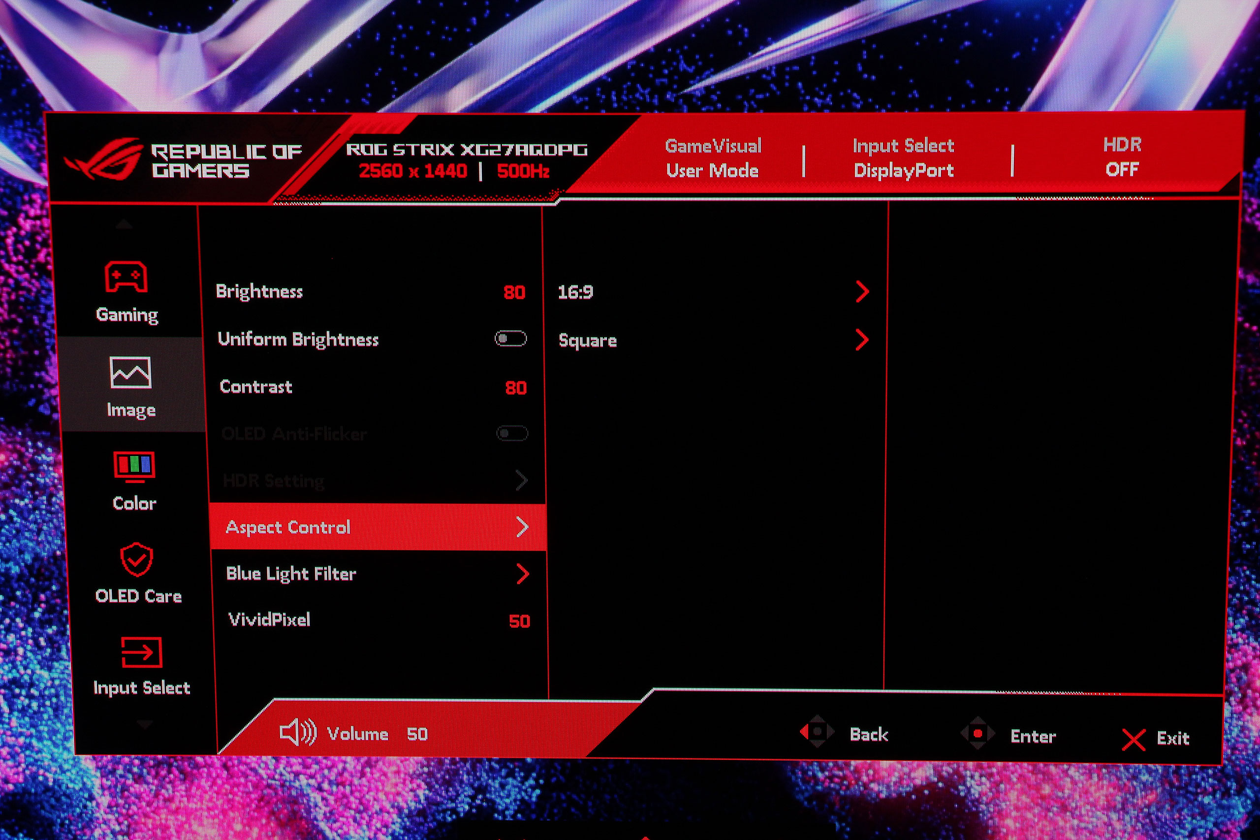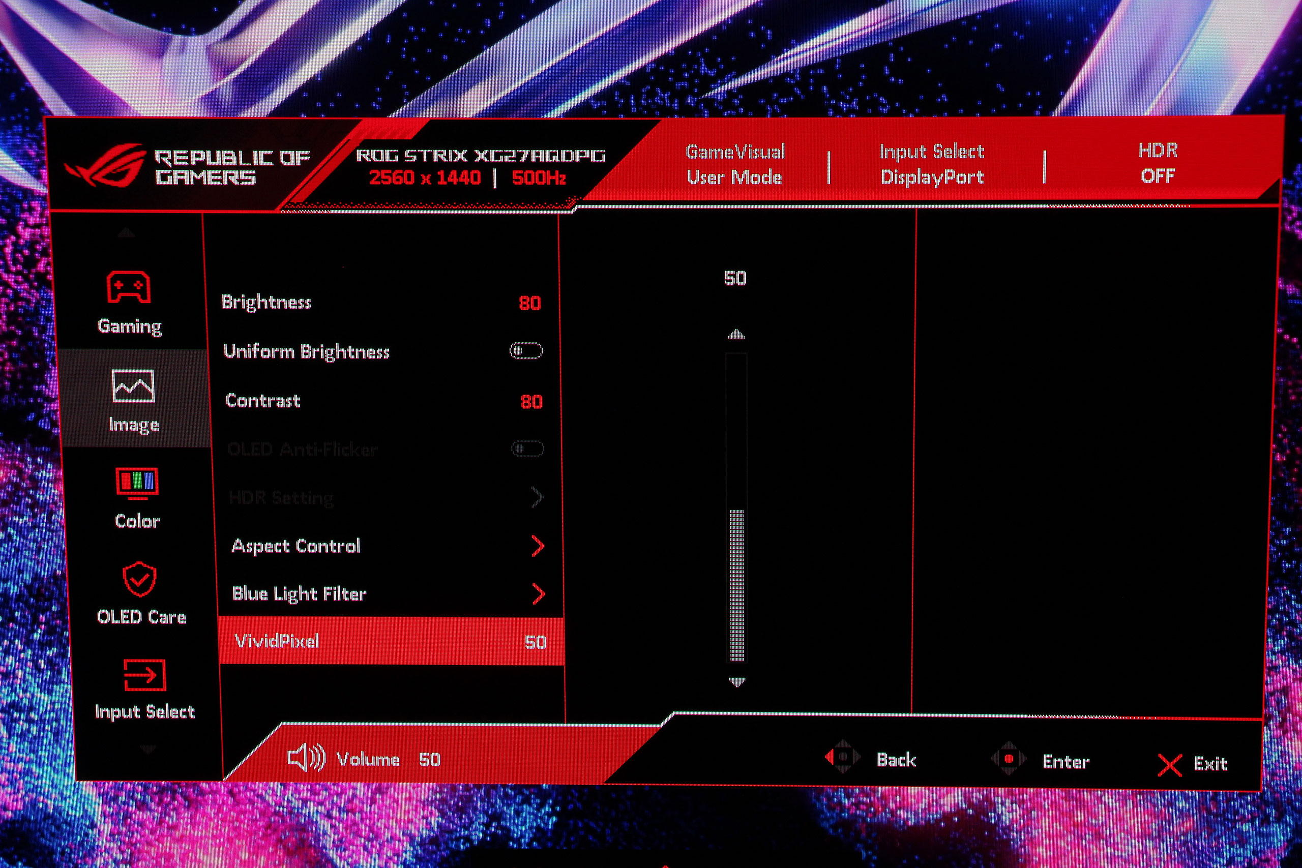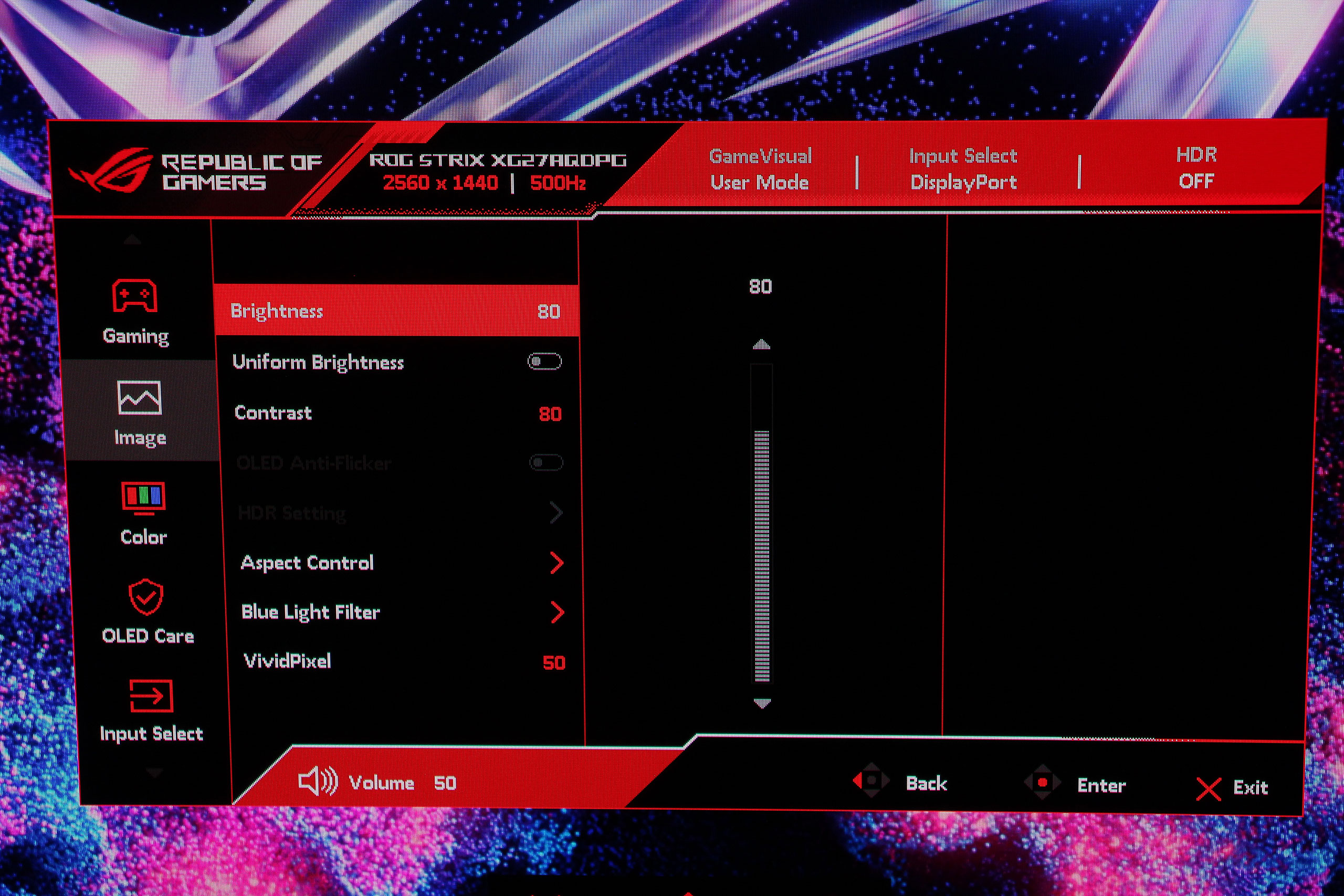 Раздел Image включает стандартные параметры яркости, контраста, насыщенности, цветовой температуры и гаммы. Также есть интересный режим симуляции 24,5‑дюймового дисплея для геймеров, которые в соревновательных целях привыкли именно к такой диагонали.