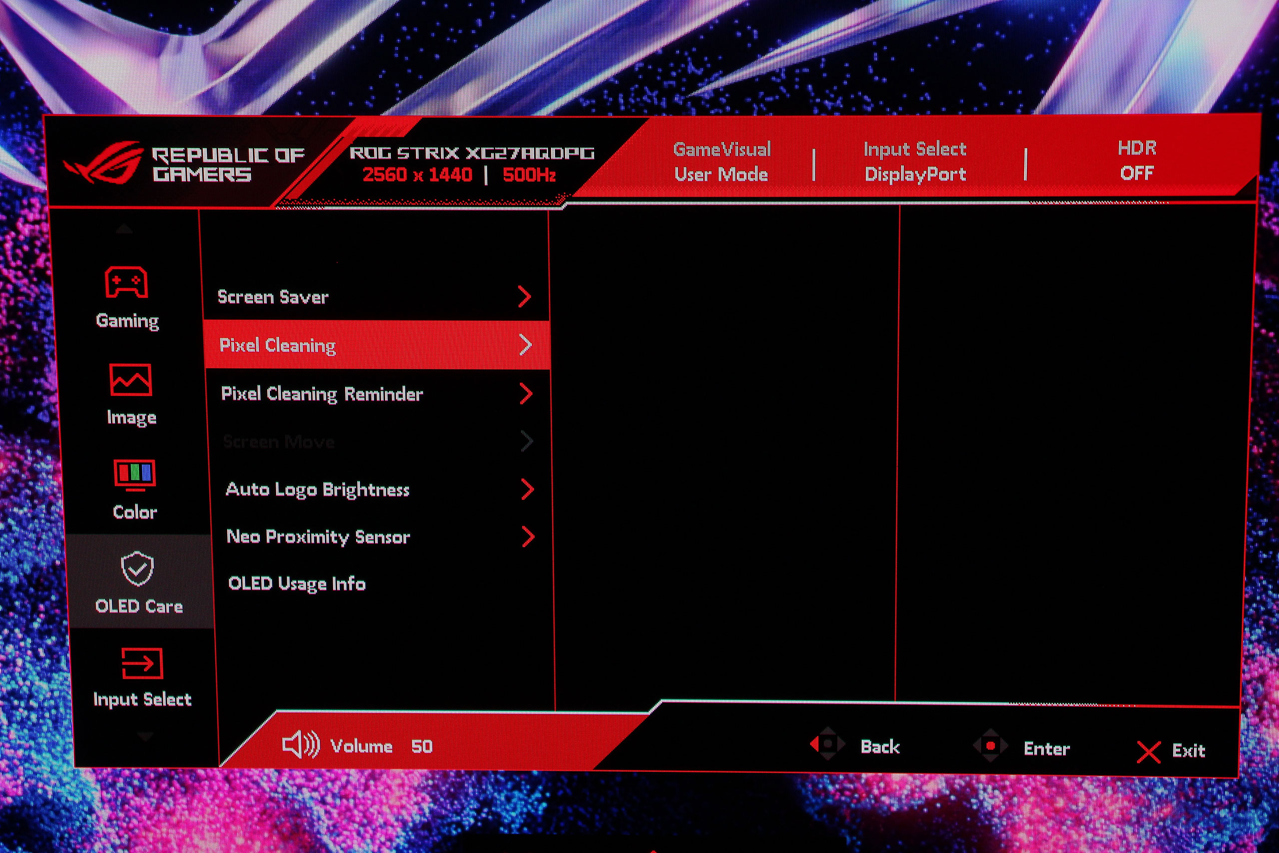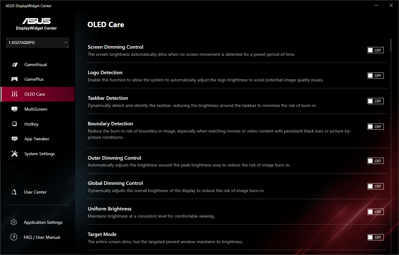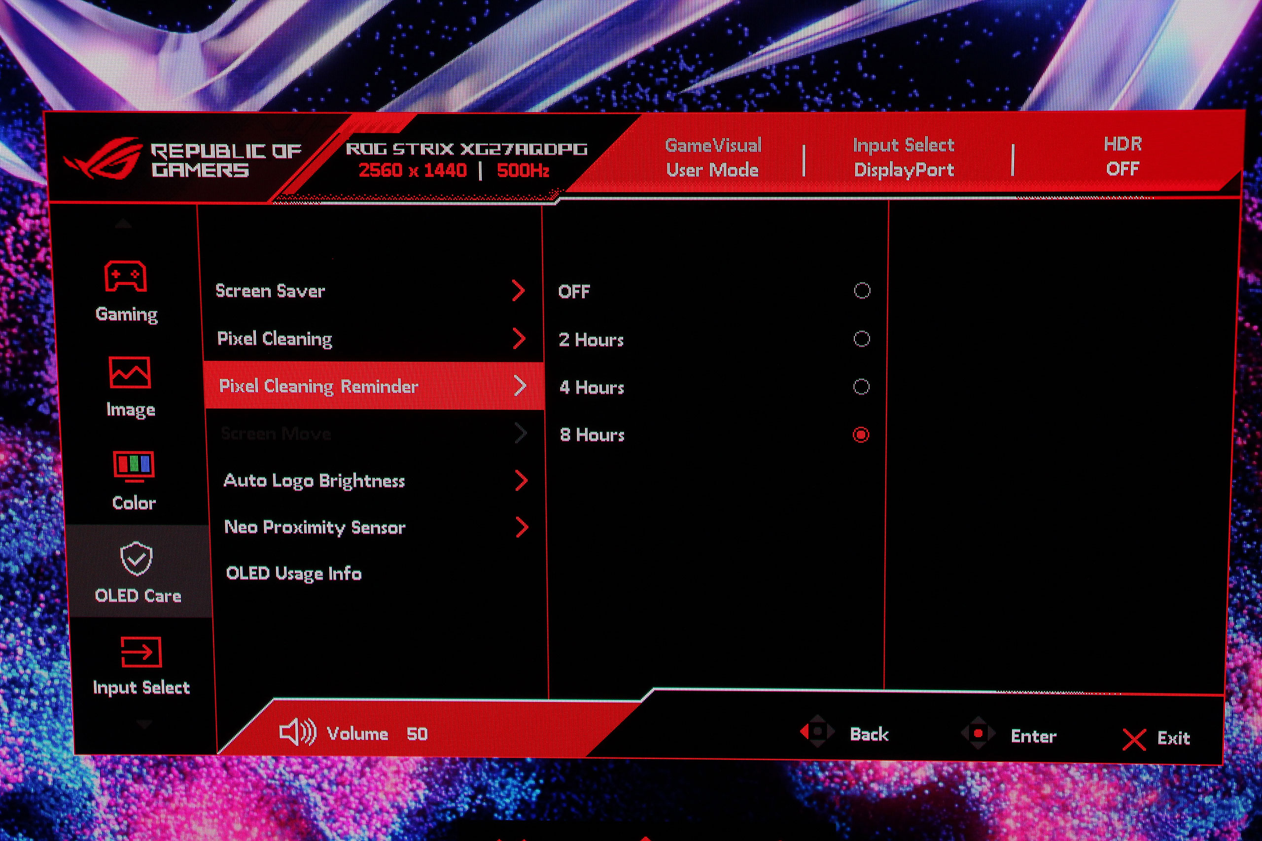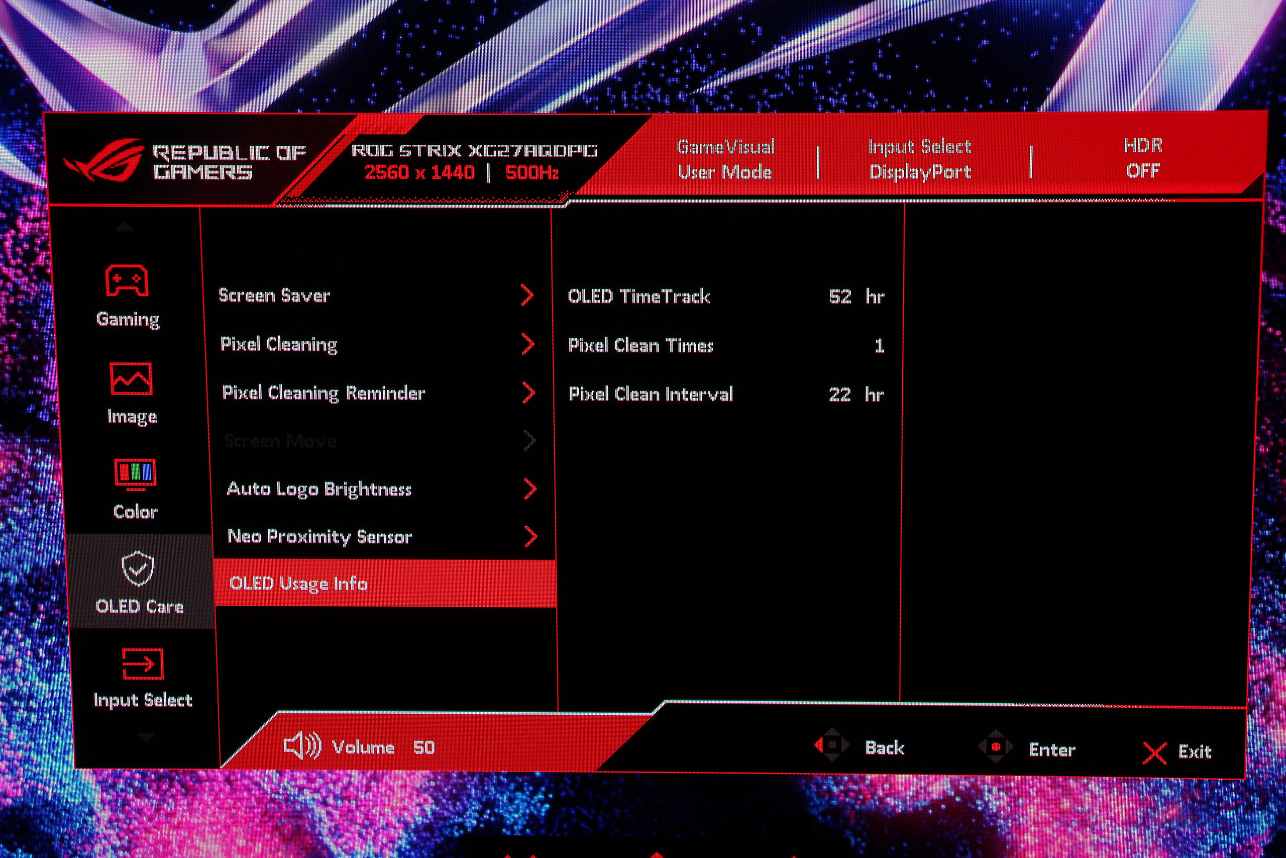 OLED Care интегрирует все защитные функции с подробной статистикой использования панели, включая счетчик часов работы и историю циклов восстановления пикселей.