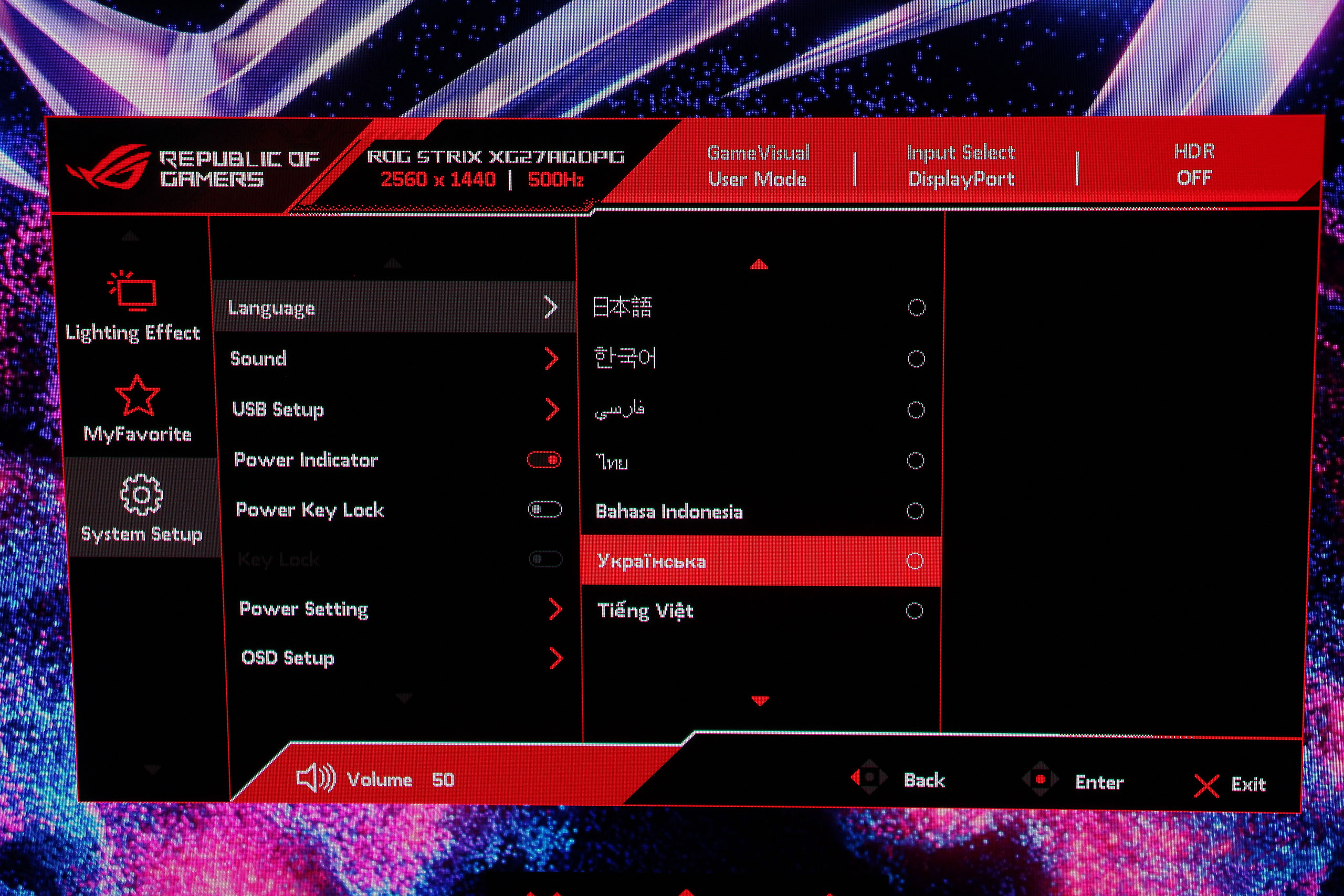 System Setup содержит общие настройки: язык меню (включая украинский), прозрачность OSD, таймер отключения, информацию о прошивке и сброс к заводским настройкам.