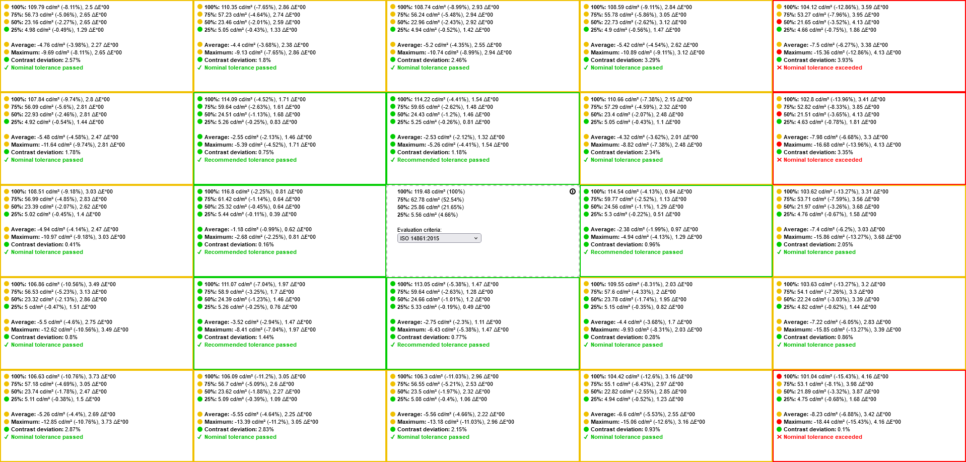 Измерение было осуществлено после калибровки профиля User. Как видно, большинство плоскости монитора по равномерности соответствует стандарту ISO 14861:2015.