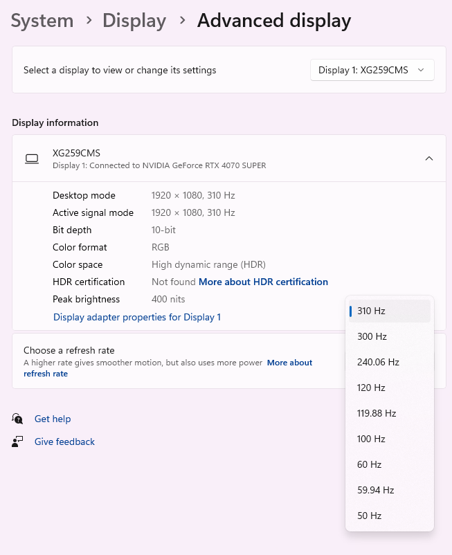 Самый интересный замер для данного монитора — это скорость матрицы. Стоит напомнить, что 310 Гц — это не рекорд даже среди протестированных нами продуктов (была модель на 360 Гц), но это все равно очень уважаемый для 2024 года показатель, особенно с учетом разумного ценника ASUS ROG Strix XG259CMS. Итак, система Windows 11 позволяет выставить следующие режимы: 50/59,94/60/100/119,88/120/240,06/300/310 Гц. Причем, без включения функции разгона в меню доступно только 300 Гц, но после — появляется отдельная опция 310 Гц: