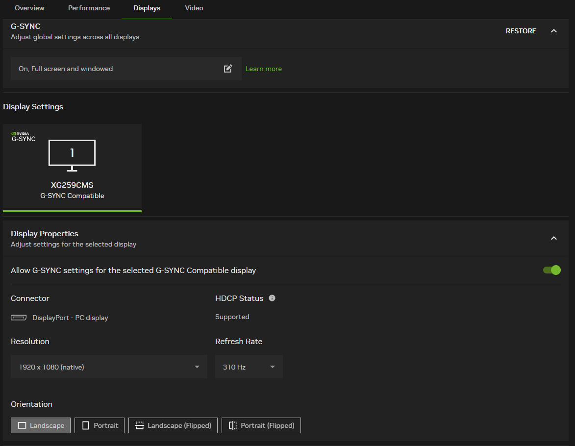 Монитор оснащен быстрой IPS-матрицей со временем реакции в 1 мс (GtG; производитель заявляет такое время как возможное минимальное). Частота 310 Гц делает его идеальным для соревновательных игр, особенно жанра FPS.
