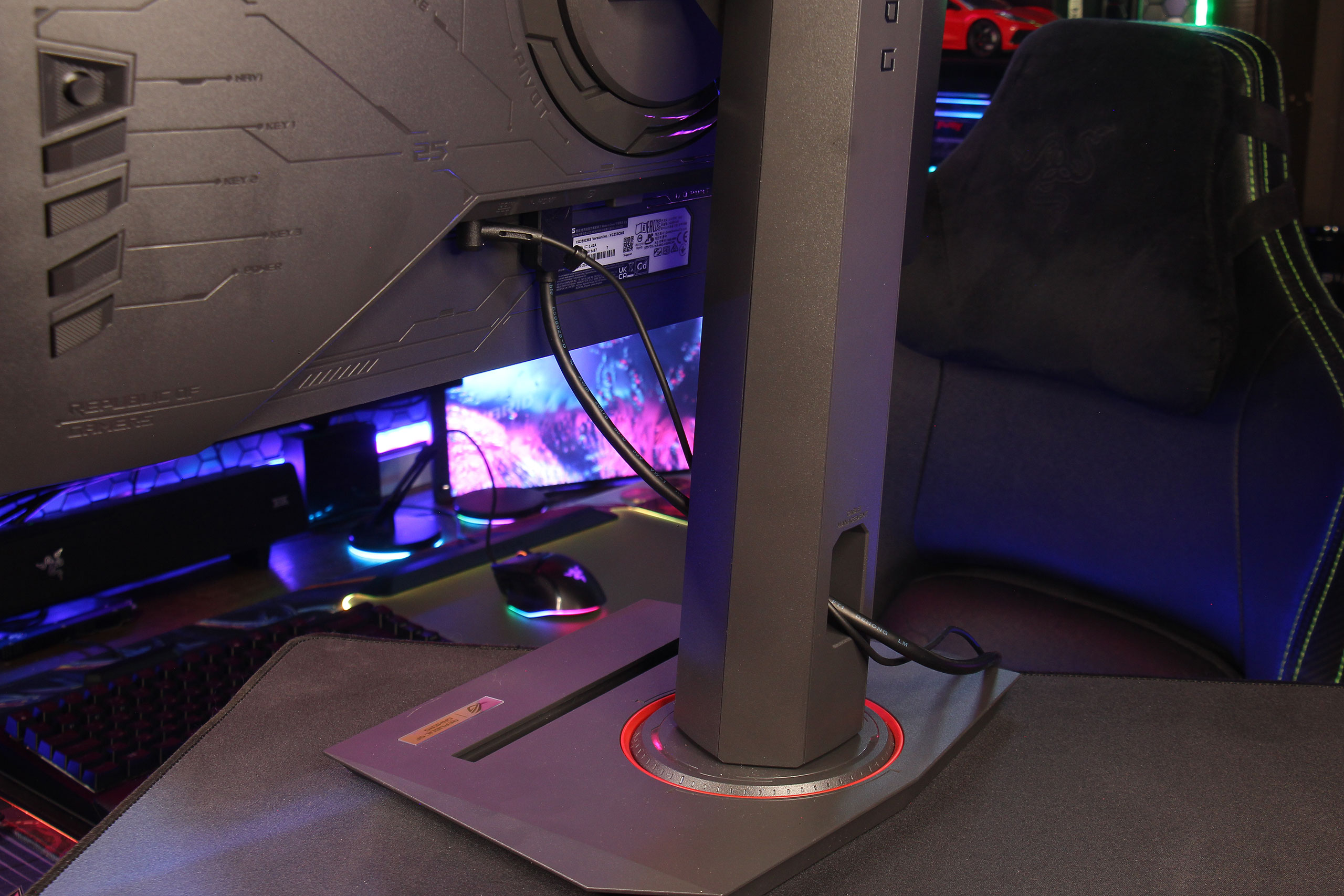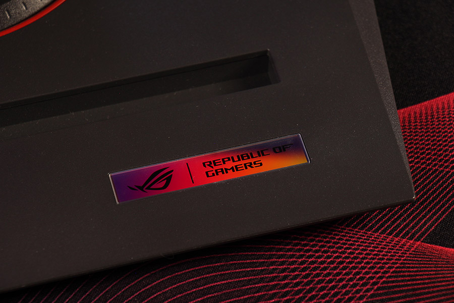 Конструкция подставки обеспечивает отличную стабильность монитора в пространстве, при этом занимая относительно небольшую площадь на столе. Внизу находятся аж семь резиновых ножек. Из интересных элементов подставки также вырез-держатель смартфона, голографическая эмблема Republic of Gamers и красный акцент вокруг поворотной части подставки.
