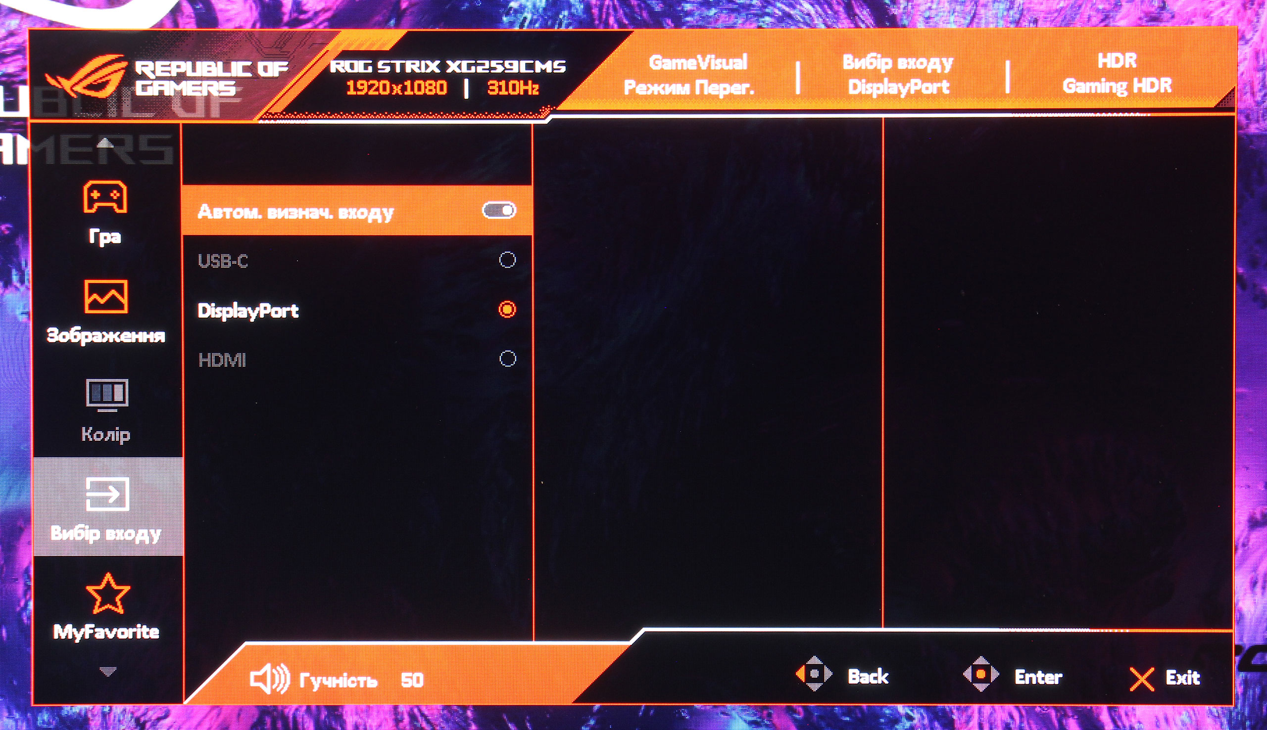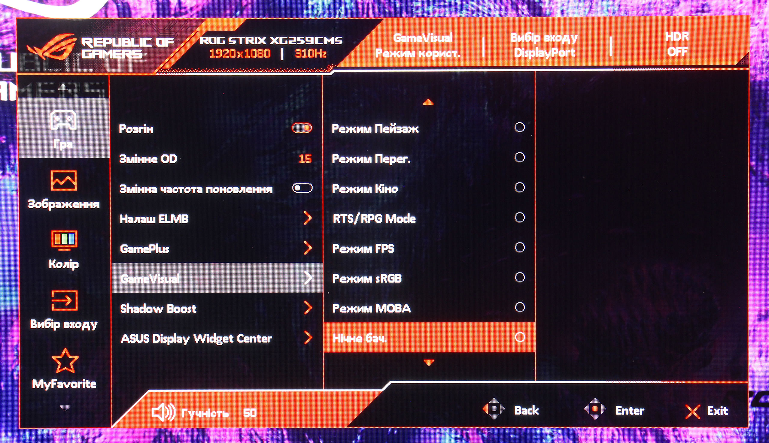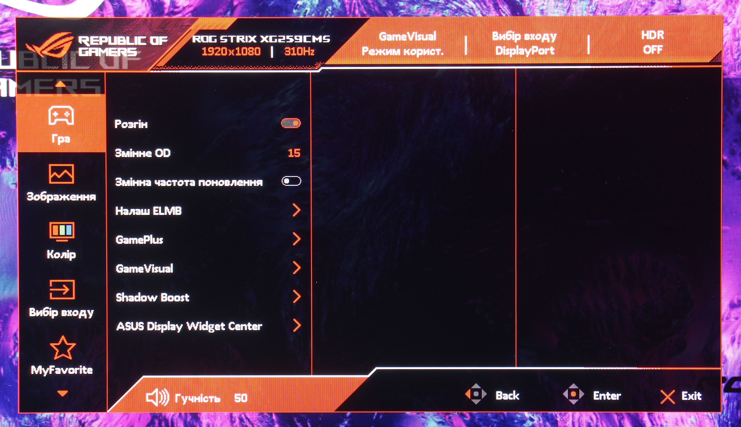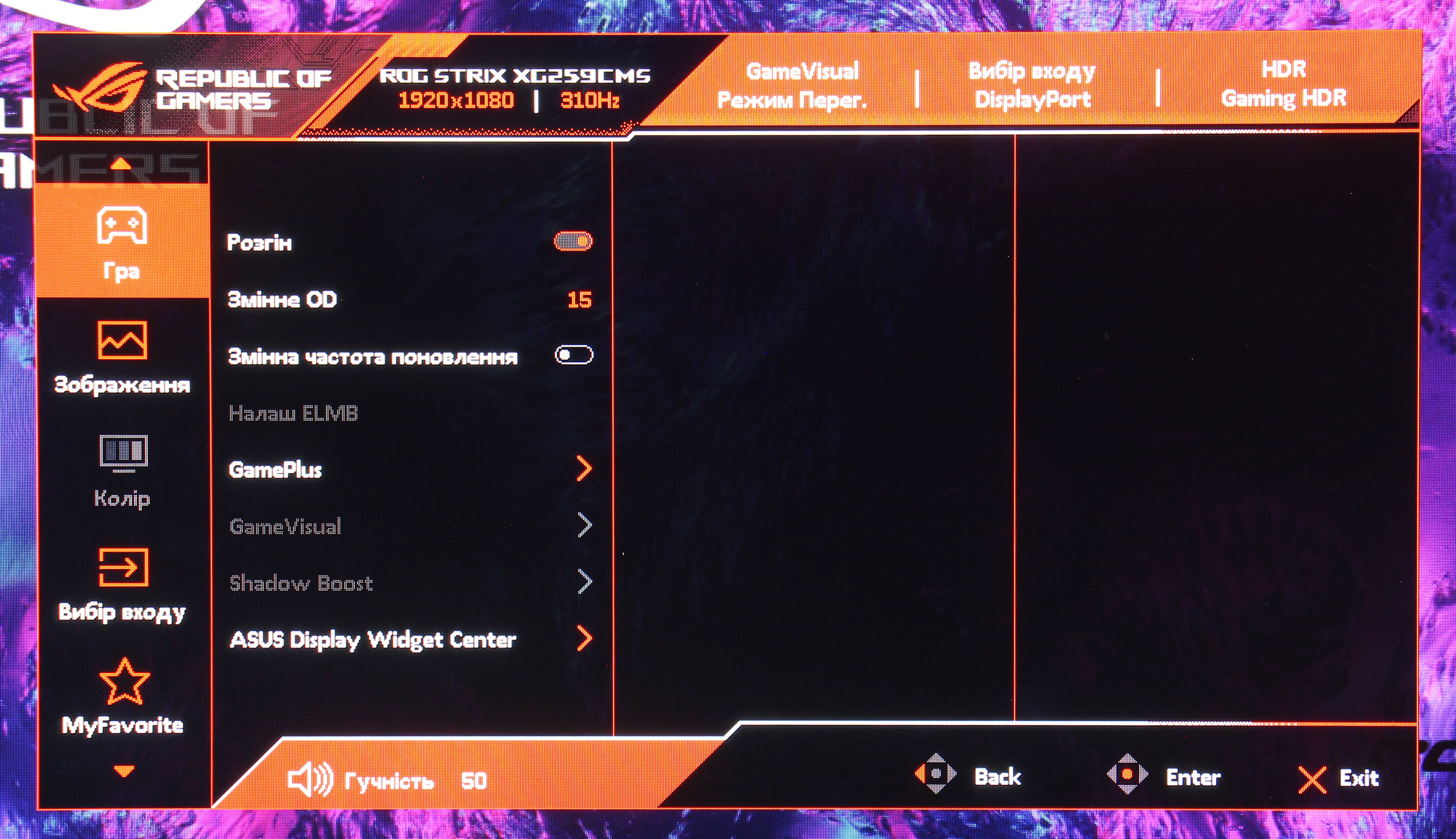 Из всех пунктов «Настроек системы» для нас самым приятным является «Язык» — да, ASUS ROG Strix XG259CMS имеет украинскую локализацию. Приятно и полезно! Спасибо, ASUS. Также рядом доступны: