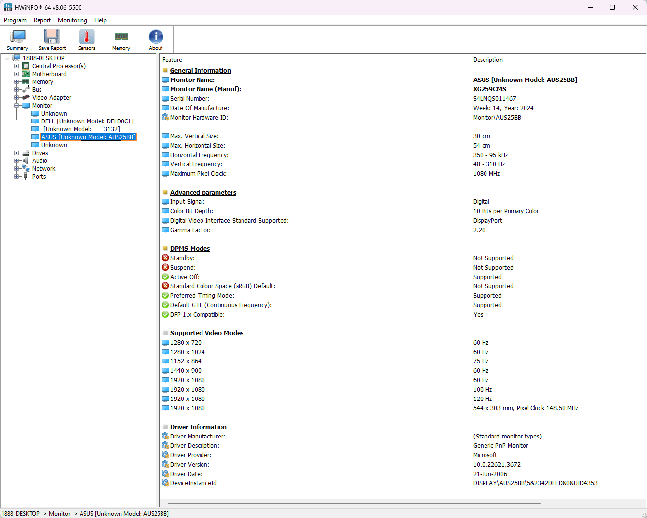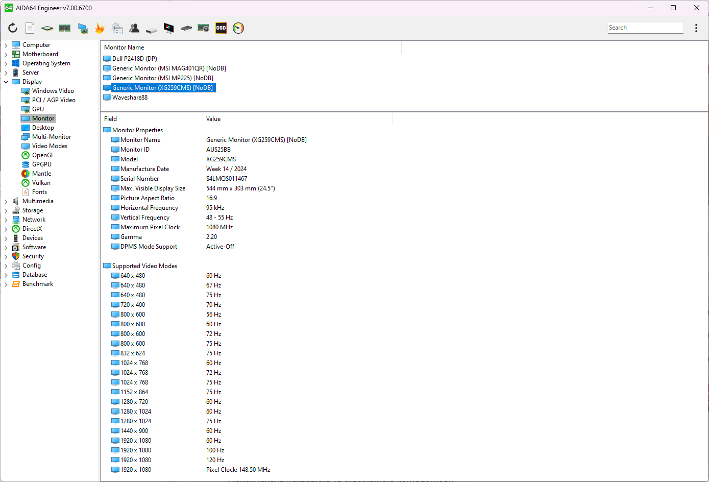 Начнем с того, как ASUS ROG Strix XG259CMS идентифицируется в AIDA64 и HWiNFO 64: