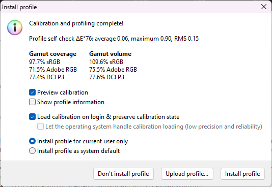 Для калибровки использовался профиль User без изменений, кроме следующих настроек: