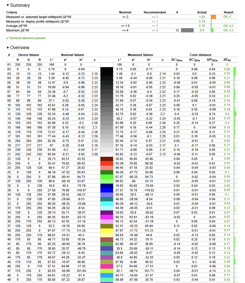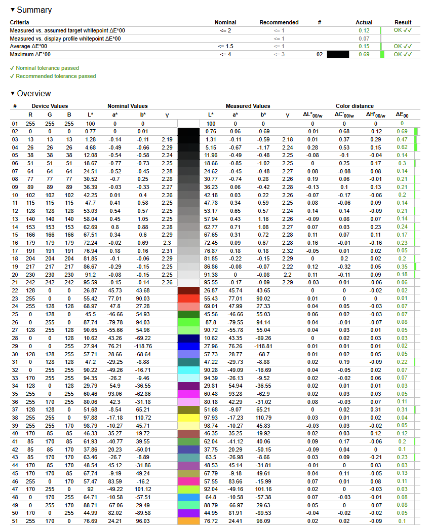 | Средняя ΔE*00 | 0,31 | 0,55 | 0,3 | 0,3 | 0,72 | 0,16 | 0,19 | 0,15 |