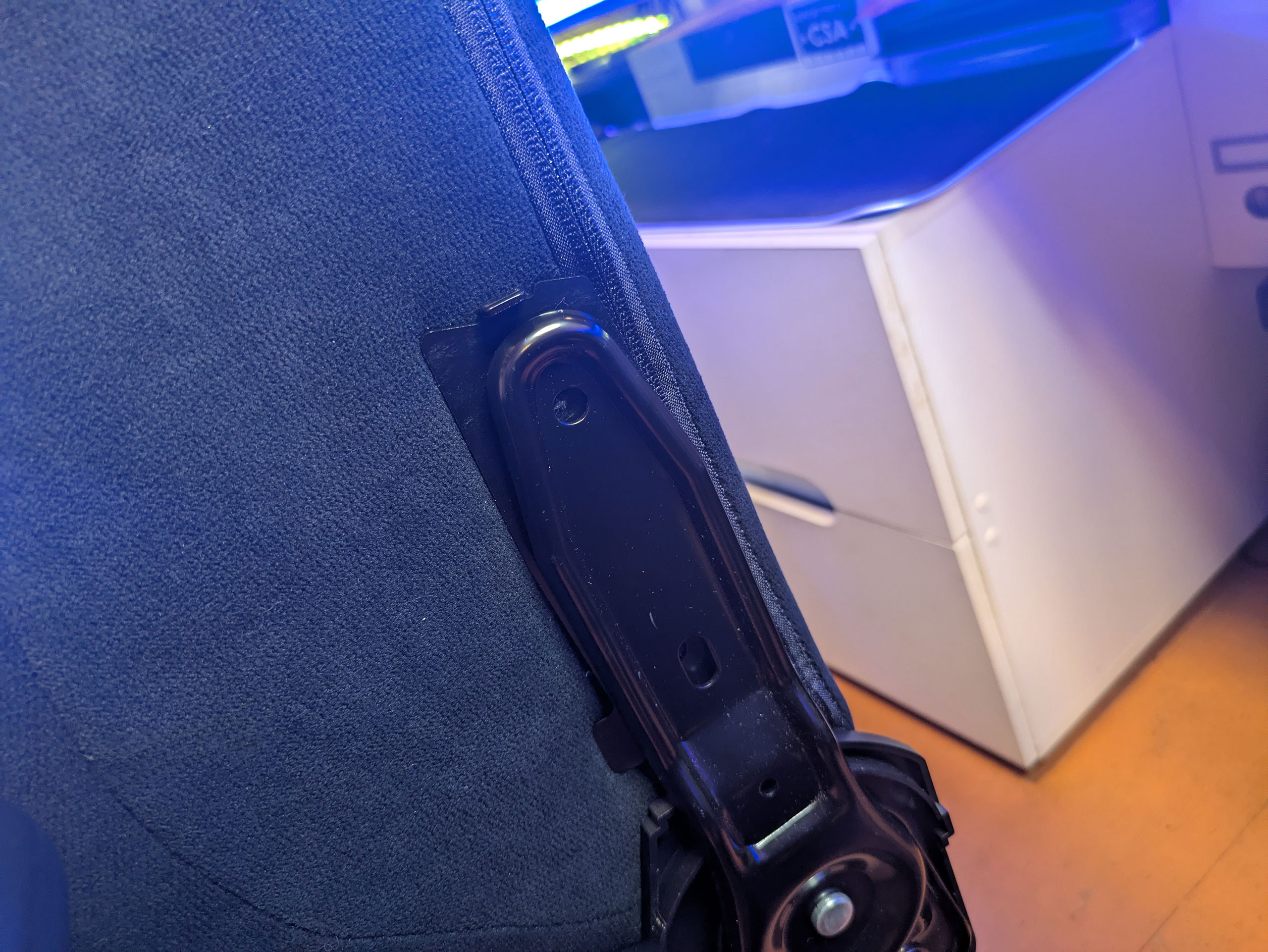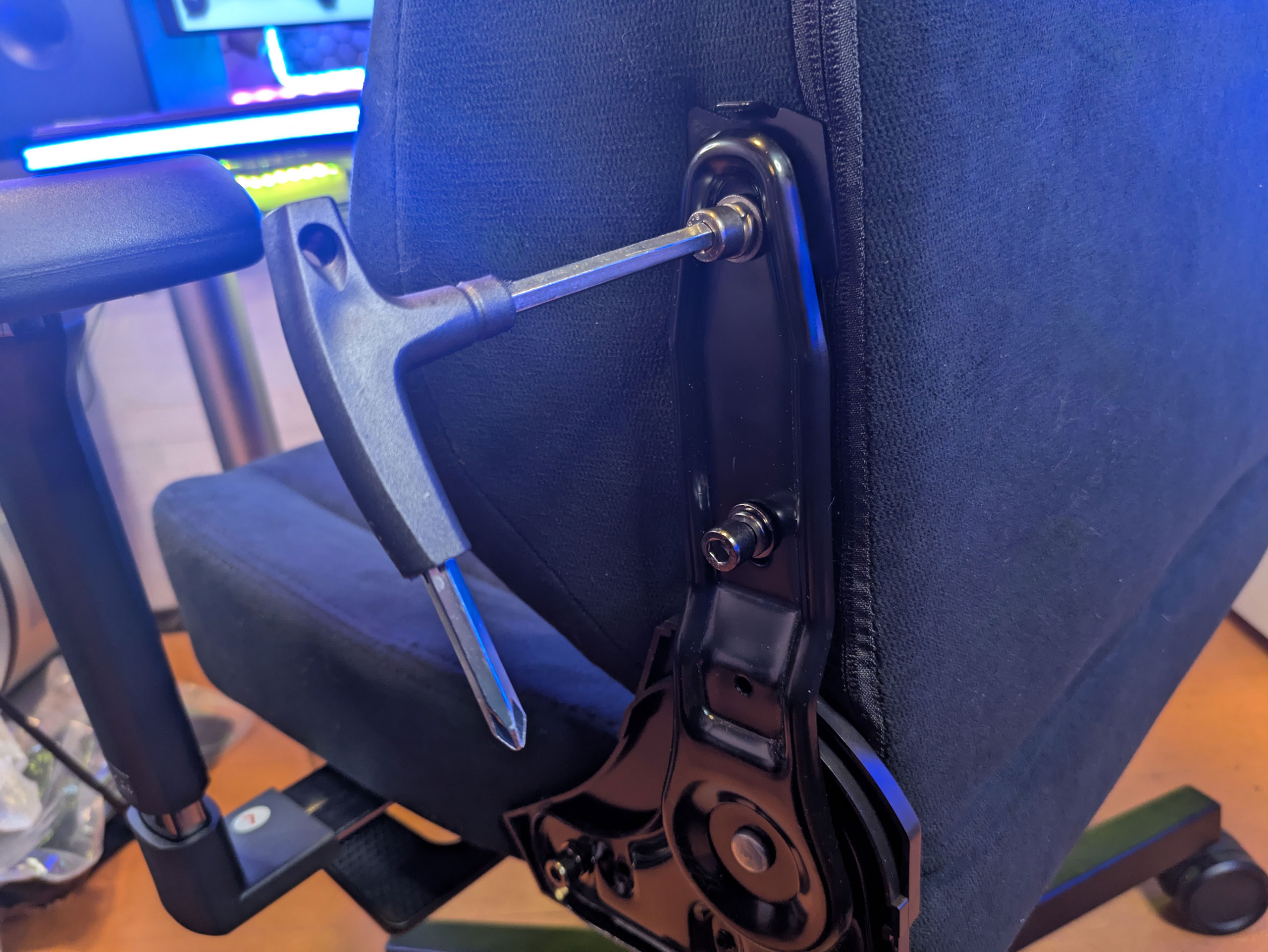 Далее — монтаж подлокотников к сиденью. Сиденье нужно положить на пол велюром вниз с мягкой подкладкой. Подлокотники прикладываются к кронштейнам по бокам с правильной ориентацией: рычаги регулировки должны быть с внутренней стороны (ближе к центру), а не снаружи. Это очевидно, но без внимания можно и спутать. На всякий случай, на подлокотниках есть временные наклейки «R» и «L», маркирующие ориентацию. По четыре винта на каждый подлокотник затягиваются равномерно, без чрезмерного усилия. Инструмент для закручивания винтов со шлицем внутренний шестиугольник поставляется в комплекте с креслом.