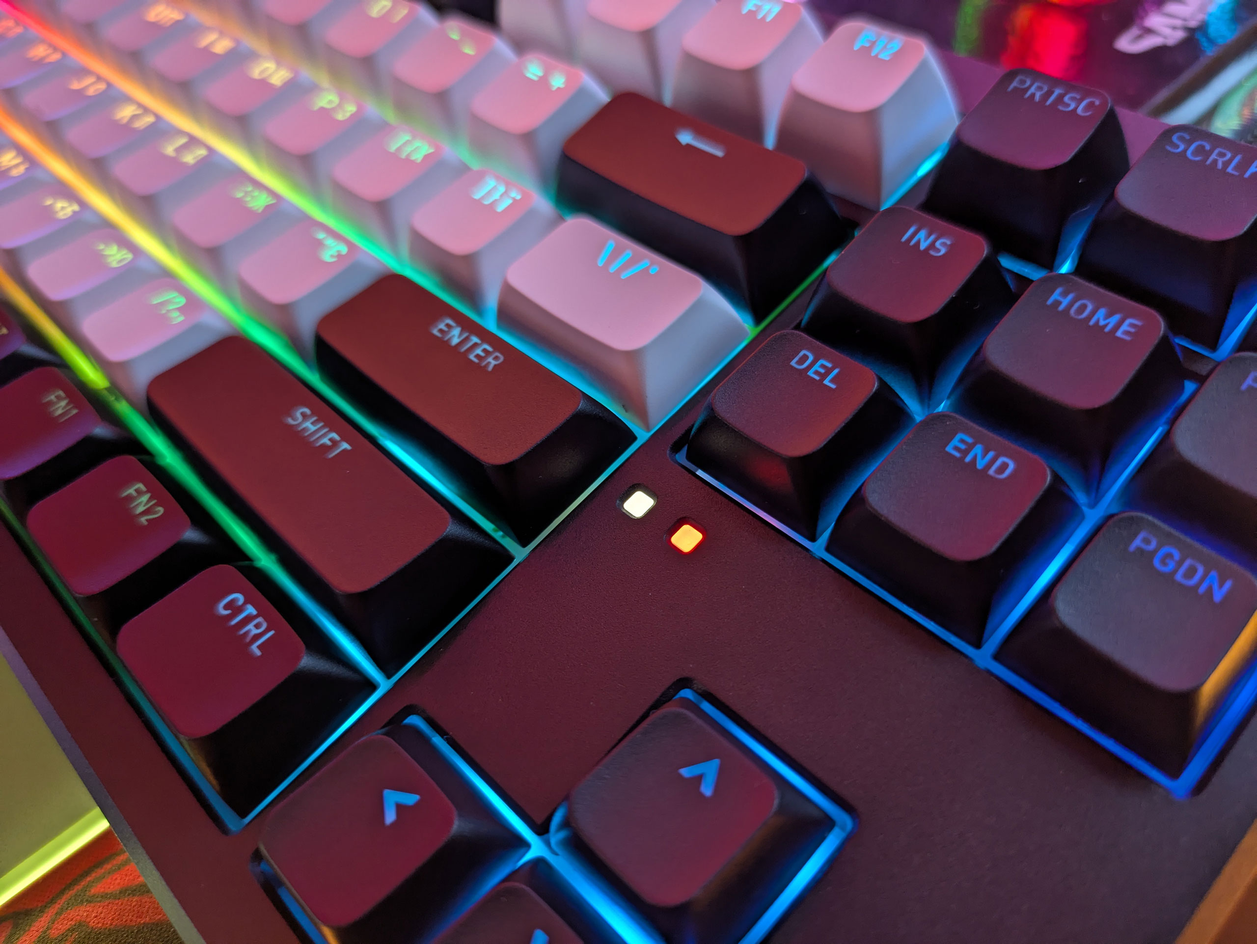 Как уже упомянуто, на PCB размещены светодиоды для подсветки каждой клавиши в отдельности. Их расположение стандартное, «северное», то есть выше центра переключателя, что является более популярным решением. Подсветка яркая и имеет множество (почти 50!) разновидностей режимов работы. Также на клавиатуре есть два индикатора возле блока стрелочек. Левый — это CAPS LOCK (светится белым), а правый — зарядки (красный, когда заряжается).