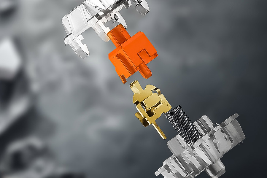 Фирменные механические переключатели HATOR Aurum Orange Linear rev.1 — линейные, имеют силу срабатывания 38 ±10% грамм, расстояние до срабатывания 1,9 ±0,4 мм и полный ход в 4 ±0,4 мм. Нейлоновая основа обеспечивает стабильность, а шток из POM-пластика, предварительно смазанный на производстве, дает плавный, без скрипа, ход.