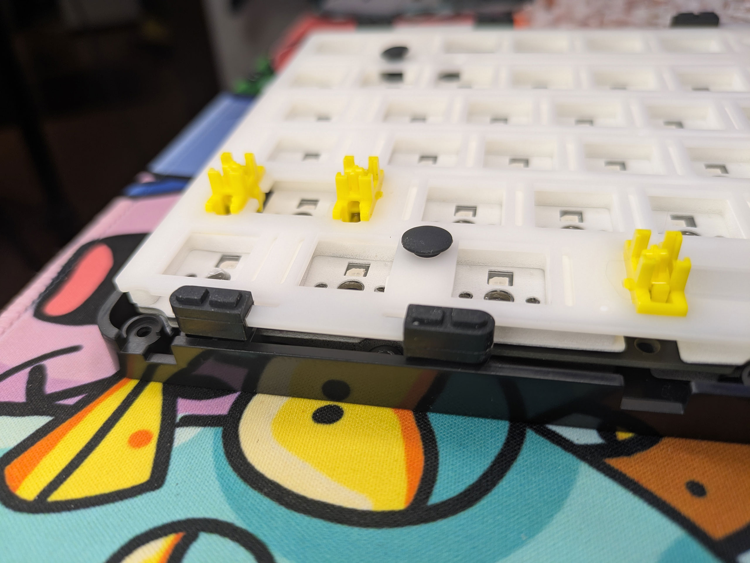 Главной конструктивной особенностью этой модели является реализация системы крепления платы gasket mount — решение, которое обычно встречается в значительно более дорогих клавиатурах. В отличие от традиционной конструкции с жестким креплением, здесь плата монтируется через специальные силиконовые прокладки, расположенные по периметру плейта. Сам плейт сделан из РОМ-пластика, то есть достаточно гибкий. Вместе с gasket mount это обеспечивает контролируемую гибкость при нажатии и улучшает акустические характеристики. При тестировании заметно, что клавиши имеют легкий, едва ощутимый прогиб — именно такой, который делает набор текста комфортным, не влияя на точность срабатывания. На плейте также закреплены стабилизаторы (обычного типа Cherry), смазанные с завода.