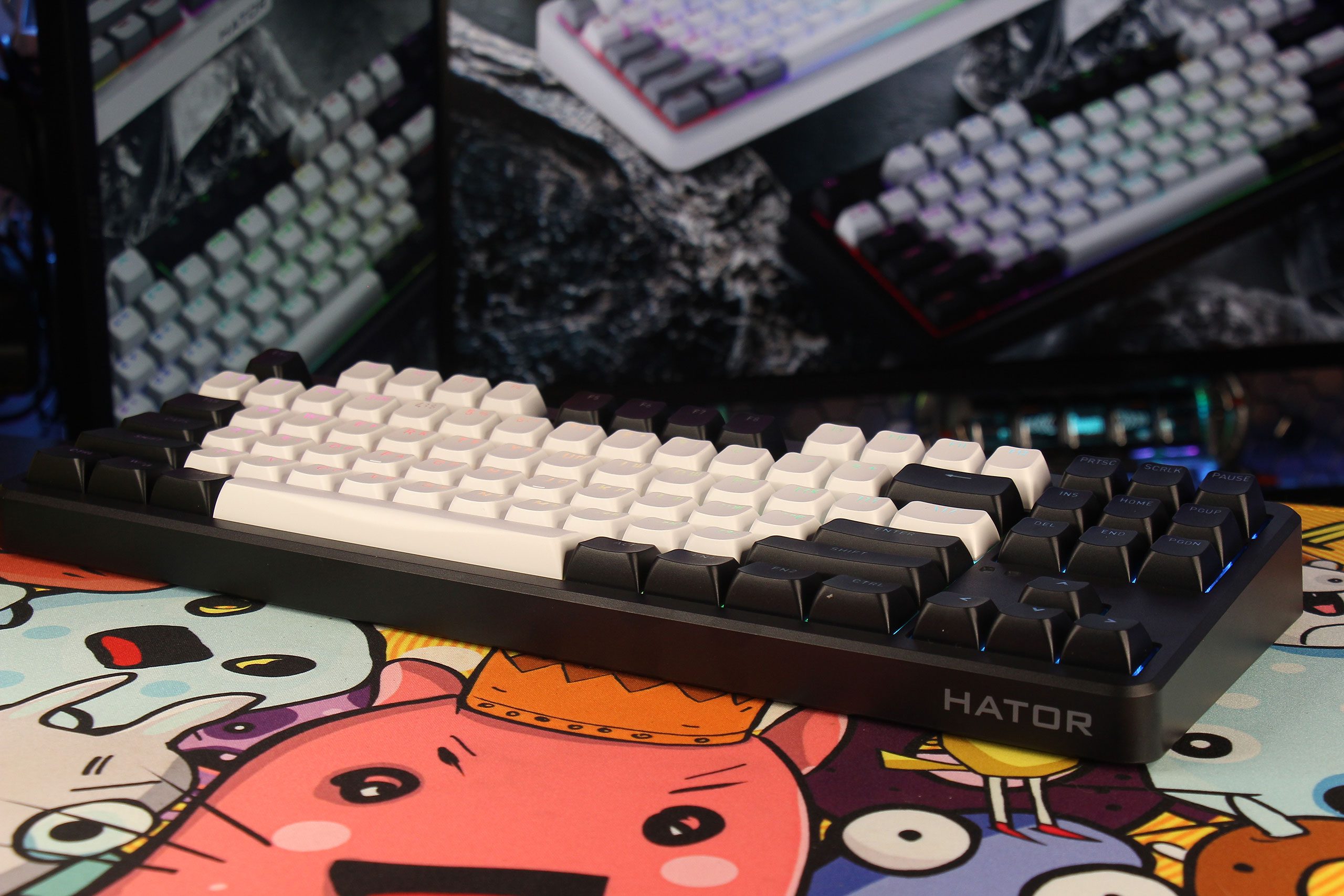 Все надписи находятся на верхней половине клавиш для максимальной совместимости со стандартной north-facing LED-подсветкой. Естественно, клавиатура имеет английский и украинский языки — другого от HATOR ждать и не стоит. Что интересно, больше в комплекте не поставляются запасные клавиши с русскими буквами — так сказать, переходный период закончился. В целом, раскладка стандартная типа ANSI, но, как и на Gravity TKL, справа от пробела присутствуют две клавиши FN1 и FN2. При желании заменить кейкапы можно без проблем, ведь формат TKL предусматривает самый обычный набор клавиш без специфического профиля и размера некоторых, как это сделано в формате 75%. А желание заменить может возникнуть, потому что на черной клавиатуре HATOR решили использовать двухцветные кейкапы, где «альфы» вместе с половиной F-ряда имеют белый цвет.