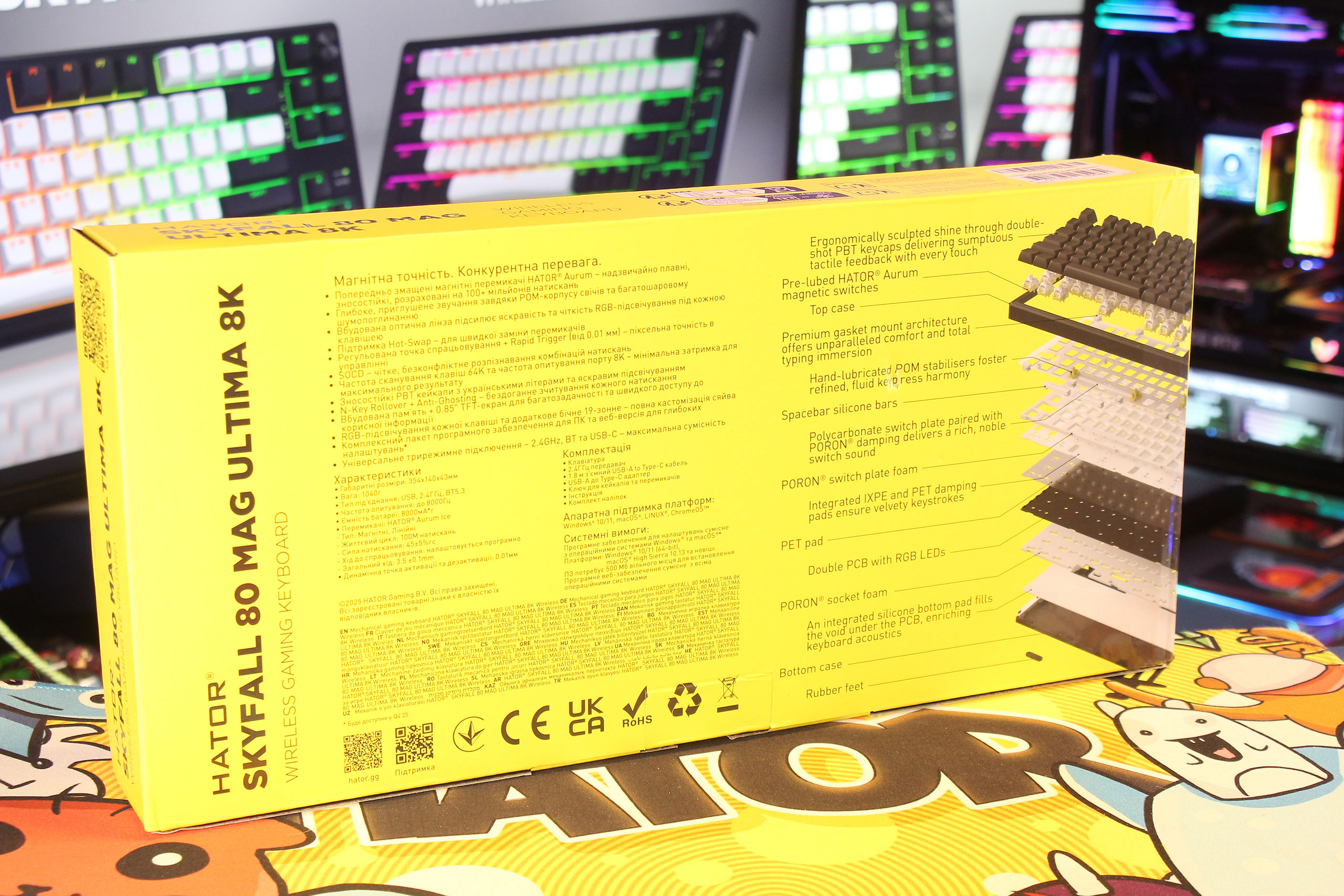 HATOR Skyfall 80 MAG Ultima 8K Wireless поставляется в фирменной желтой картонной коробке, уже ставшей визитной карточкой бренда. Внутри клавиатура надежно зафиксирована картоном для защиты во время транспортировки.