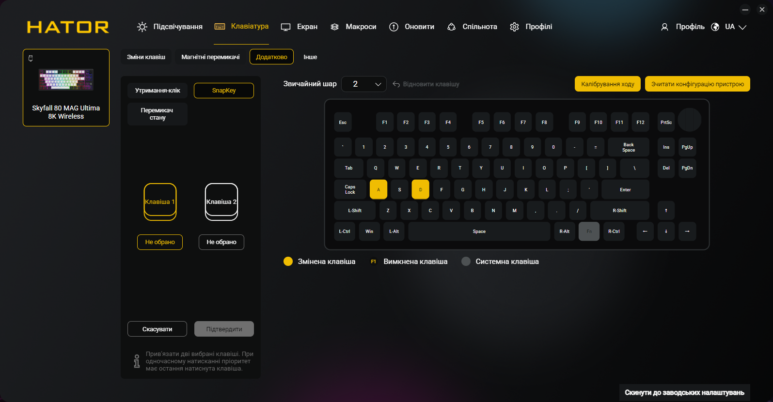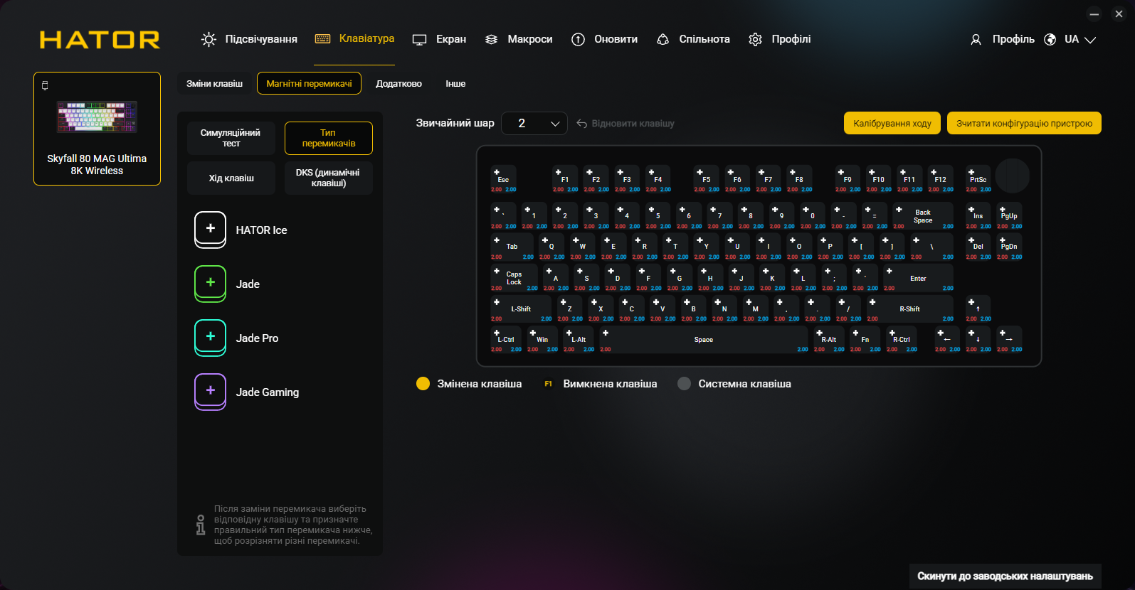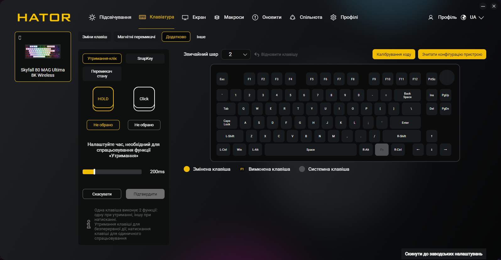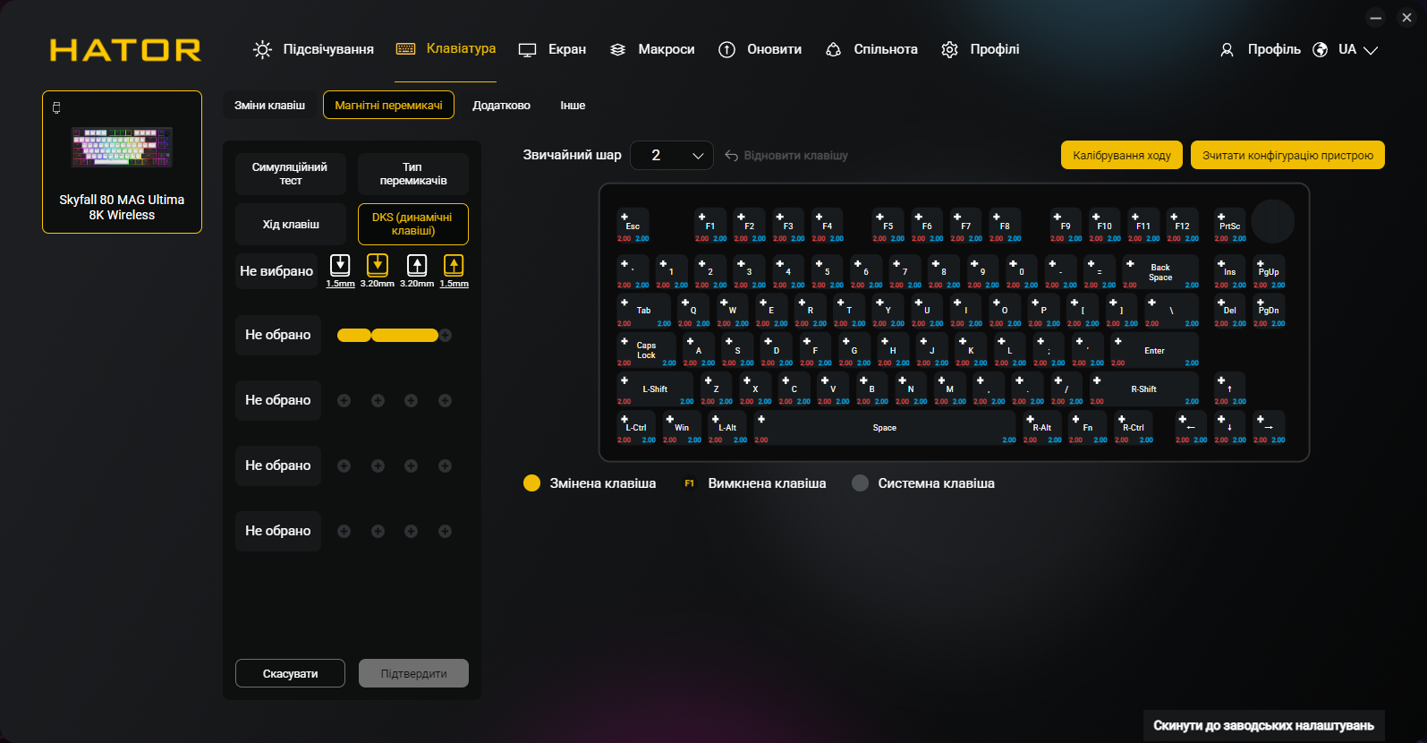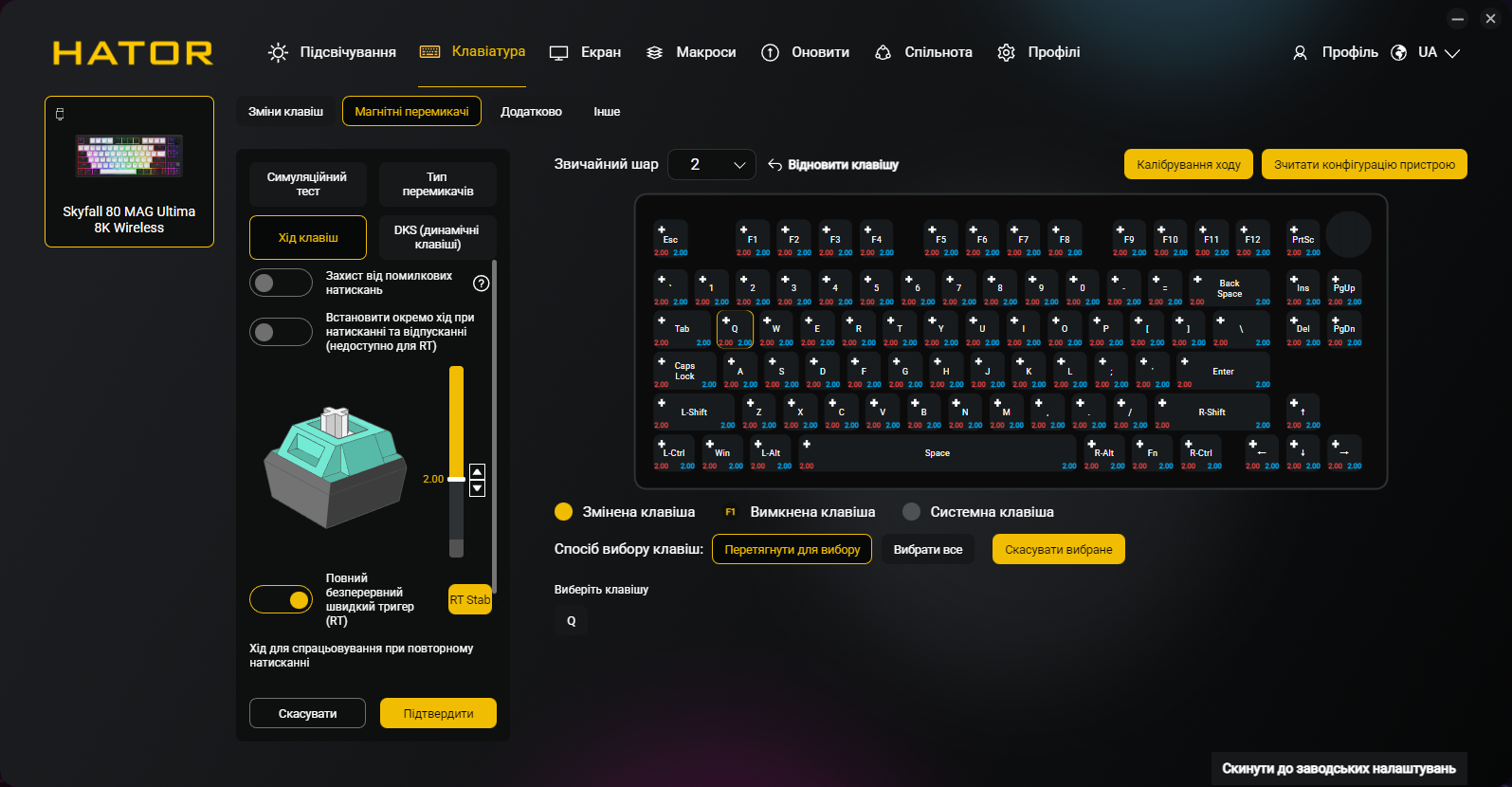 Кроме всех обычных функций типа переназначения клавиш и записи макросов, приложение позволяет программировать точку срабатывания и Rapid Trigger для каждой клавиши индивидуально, настраивать DKS, Mod Tap, Toggle и SOCD, управлять RGB-подсветкой и боковыми полосами, создавать и сохранять профили, настраивать функции регулятора громкости и TFT-экрана. Естественно, присутствует украинский (и английский) языки интерфейса.
