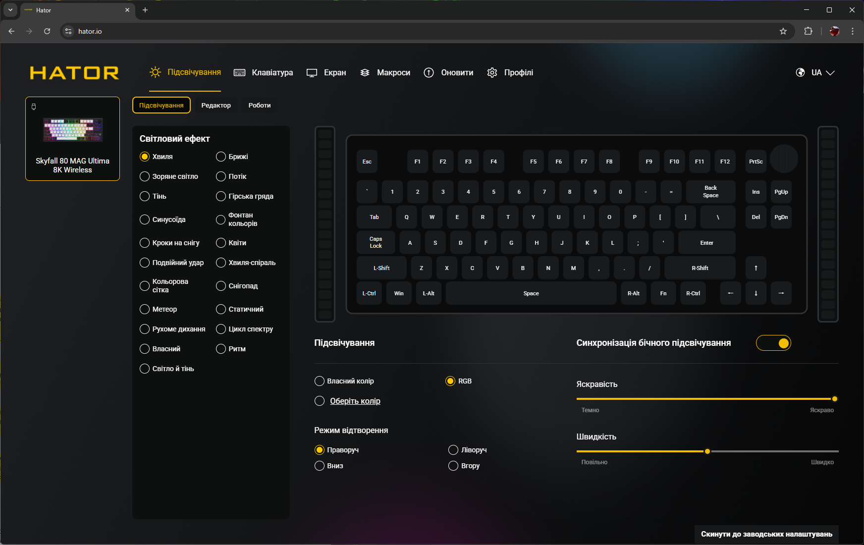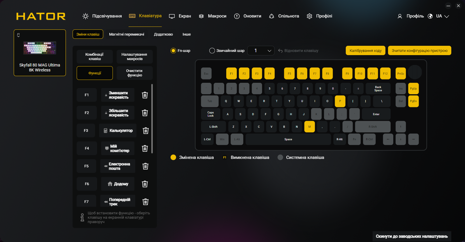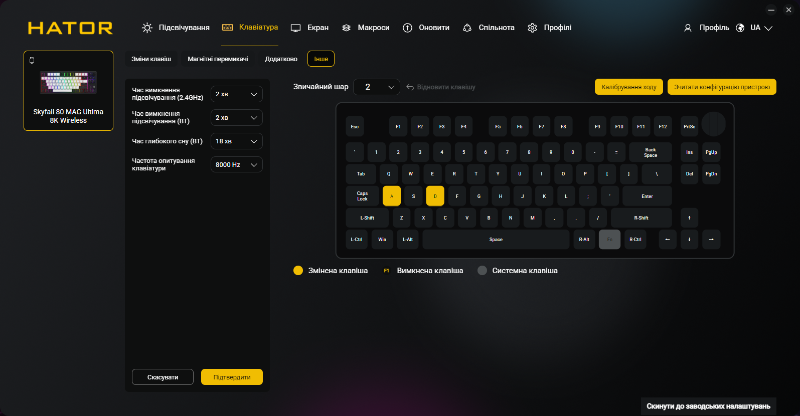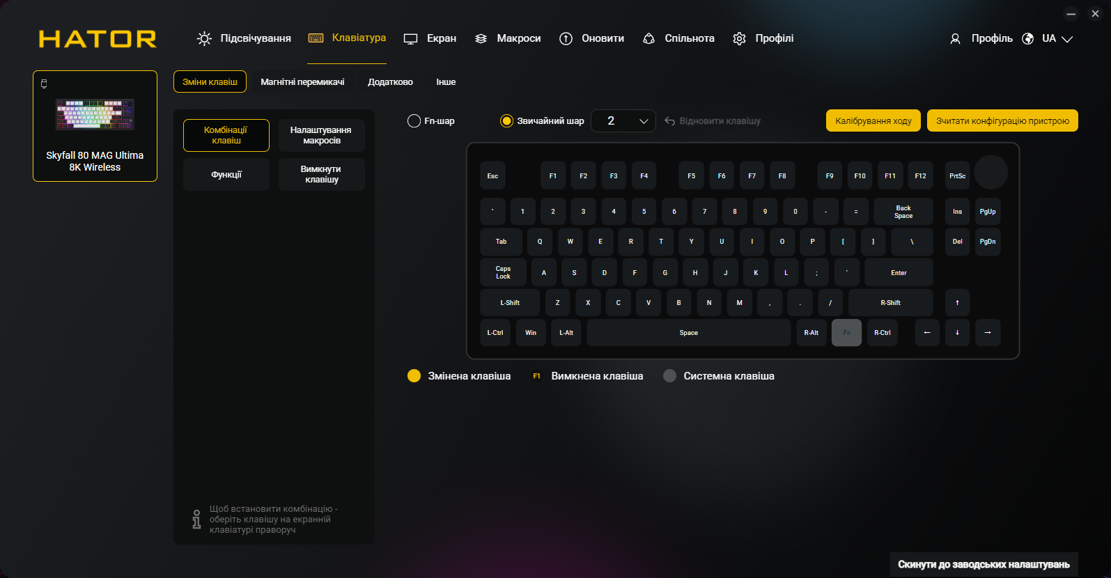 Кроме всех обычных функций типа переназначения клавиш и записи макросов, приложение позволяет программировать точку срабатывания и Rapid Trigger для каждой клавиши индивидуально, настраивать DKS, Mod Tap, Toggle и SOCD, управлять RGB-подсветкой и боковыми полосами, создавать и сохранять профили, настраивать функции регулятора громкости и TFT-экрана. Естественно, присутствует украинский (и английский) языки интерфейса.
