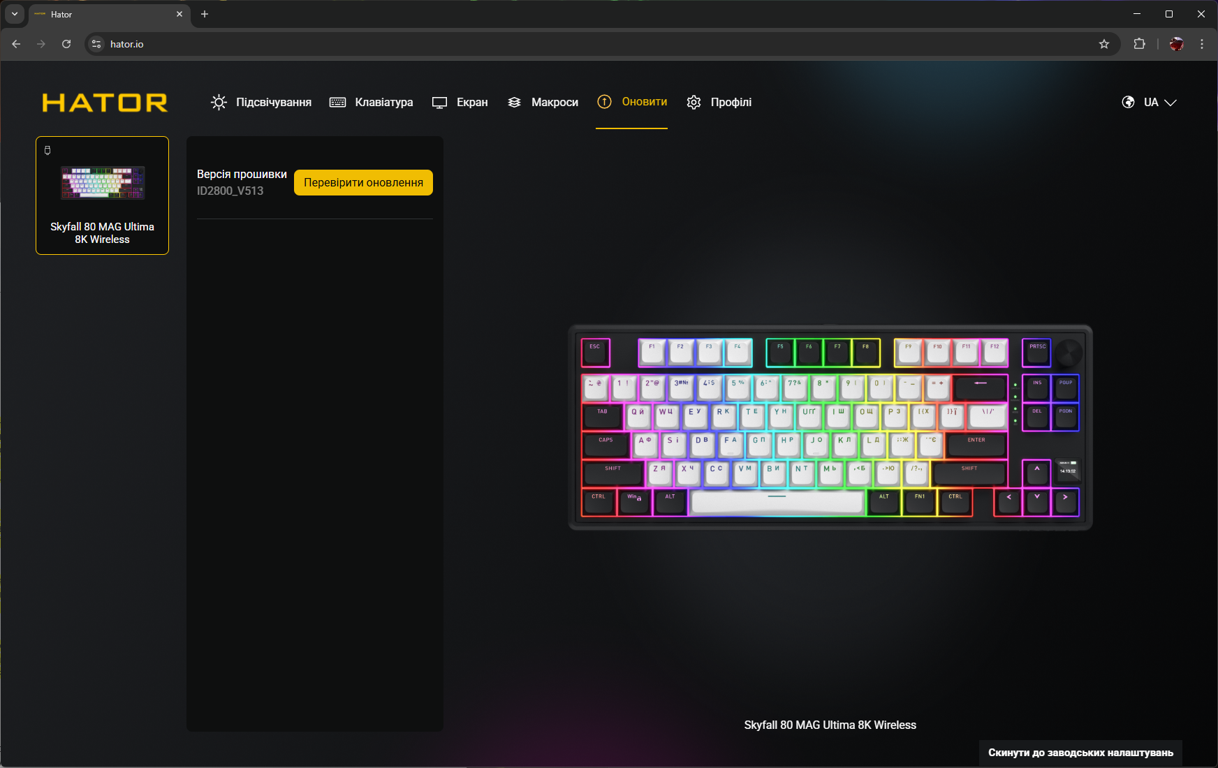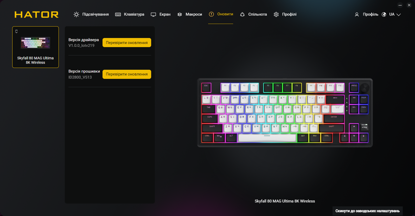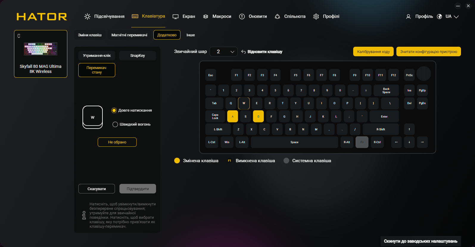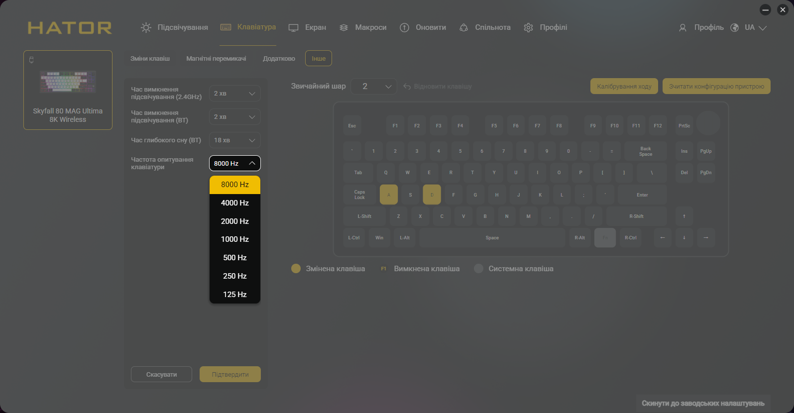 Почему магнитные переключатели важны именно для беспроводной клавиатуры? Дело в том, что технология на эффекте Холла позволяет реализовать весь арсенал игровых функций: Rapid Trigger, Dynamic Key Stroke (DKS), аналоговый ввод для плавного управления движением в шутерах и гонках. Ранее эти возможности ассоциировались преимущественно с проводными устройствами премиум-класса вроде Wooting. Теперь HATOR предлагает их в беспроводном формате с polling rate 8000 Гц (одинаково для проводного и беспроводного режимов) за цену около 5000 грн. Для сравнения: неофициально завезенные Wooting 80HE стоят в Украине минимум вдвое дороже и эта модель работает исключительно по кабелю. В это время простая проводная версия магнитной клавиатуры HATOR под названием Skyfall 80 MAG Ultra 8K вообще предлагается за 3299 грн и позволяет сэкономить тем, кто не интересуется возможностью работы без проводов или наличием TFT-экрана на устройстве.