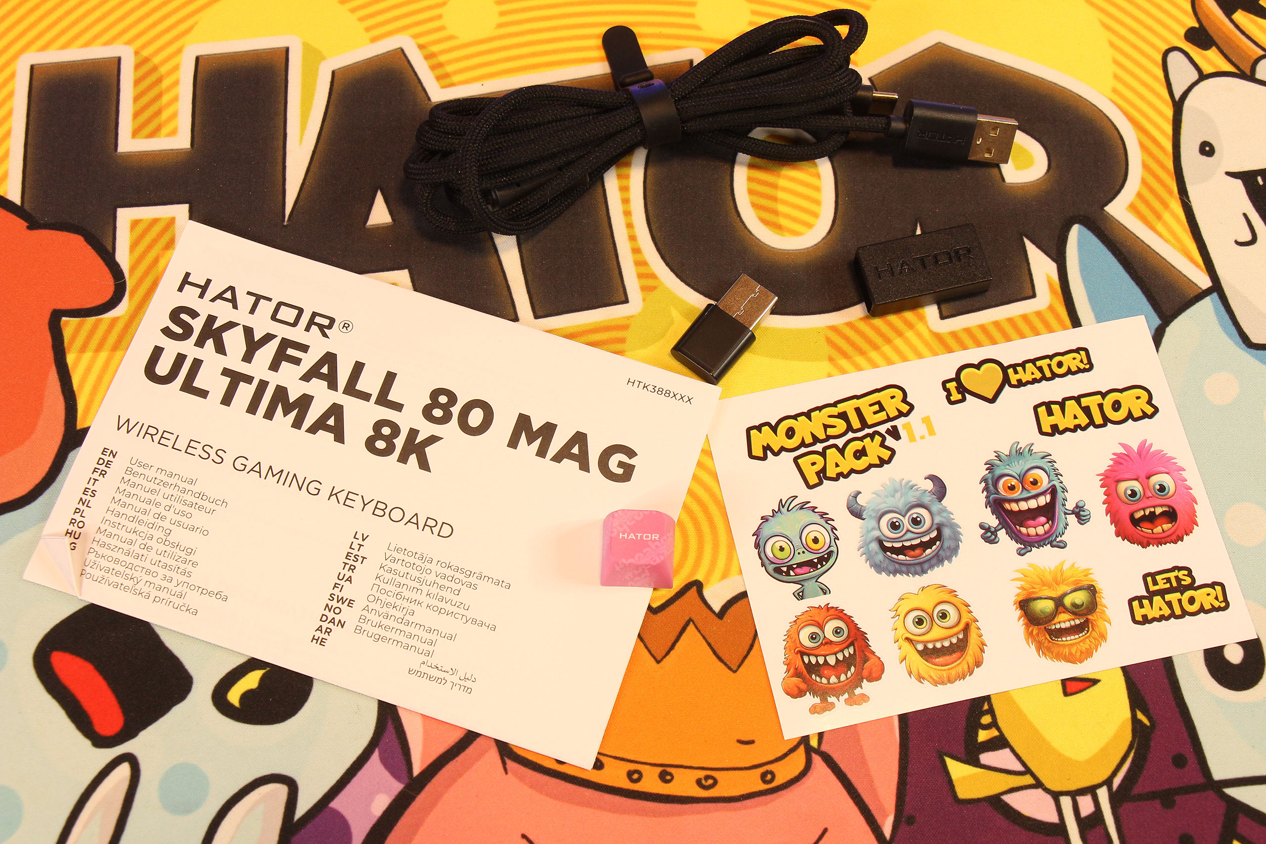 HATOR Skyfall 80 MAG Ultima 8K Wireless поставляется в фирменной желтой картонной коробке, уже ставшей визитной карточкой бренда. Внутри клавиатура надежно зафиксирована картоном для защиты во время транспортировки.