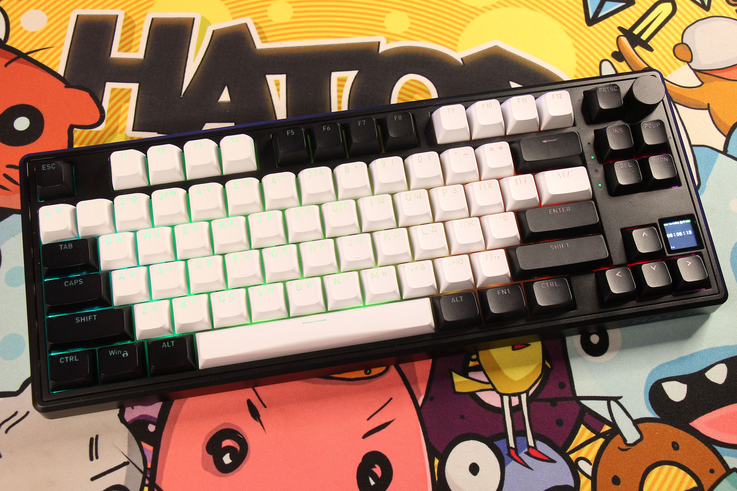 | Дополнительно | TFT-экран 0,85″, регулятор громкости, gasket mount, шумоподавление, колпачки PBT двойного литья (профиль OMA), ключ для снятия колпачков и переключателей, адаптер USB‑C to USB‑A, один дополнительный колпачок в комплекте |