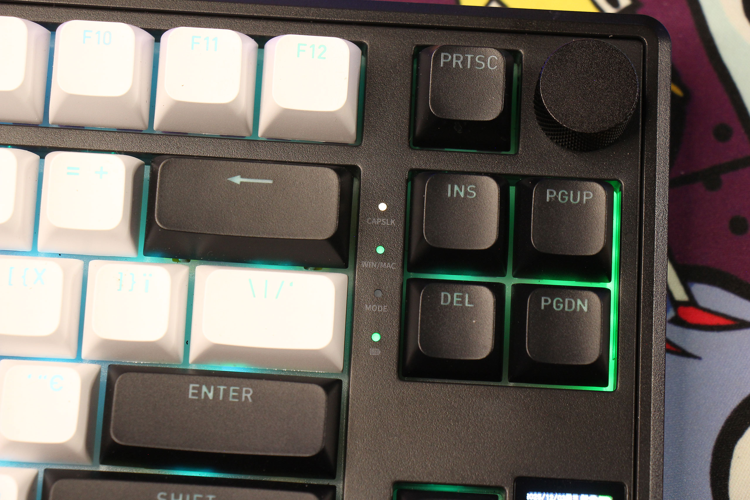 Регулятор громкости остался на своем месте: анодированный в черный цвет алюминиевый энкодер с приятным шаговым механизмом. Он работает на системном уровне и имеет функцию нажатия. Четыре светодиодных индикатора (Caps Lock, Win/Mac, режим и батарея) находятся вертикально между основным блоком клавиш и навигационным кластером.