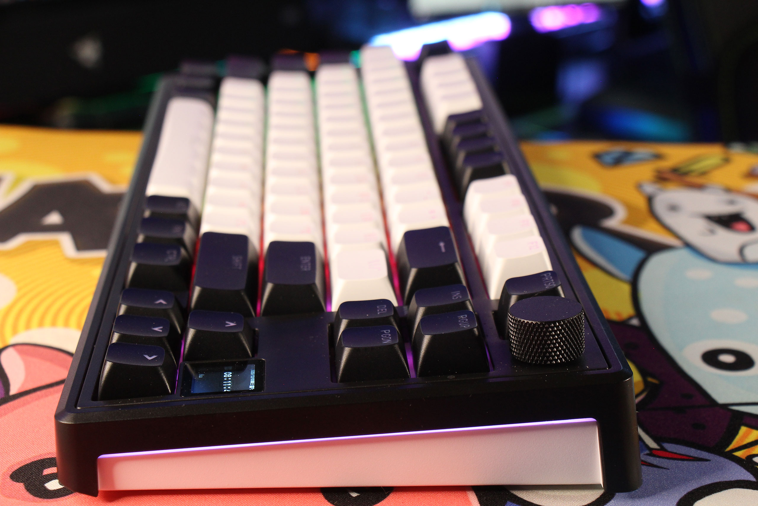 Главным визуальным отличием от обычной Skyfall 80 Wireless является TFT-экран диагональю 0,85 дюйма, расположенный в правом верхнем углу рядом с регулятором громкости. Экран позволяет отображать текущие настройки клавиш, полезную информацию или собственную анимацию. Это не только декоративный элемент: на экране можно видеть активный профиль, режим подключения, уровень заряда и другие параметры без необходимости открывать программное обеспечение.