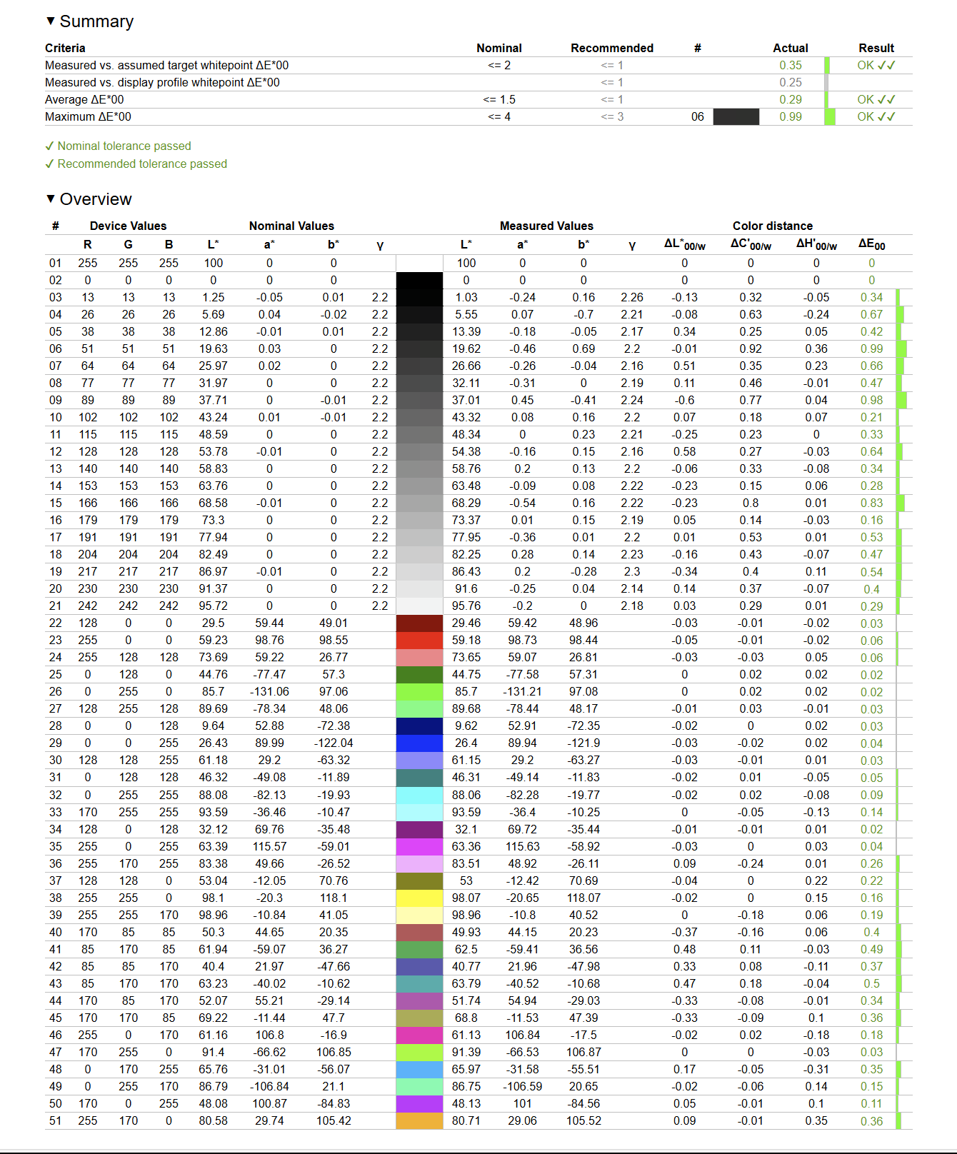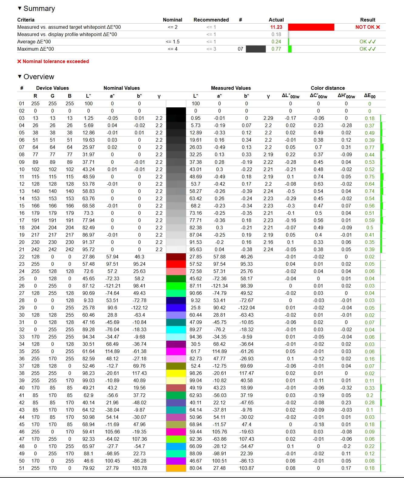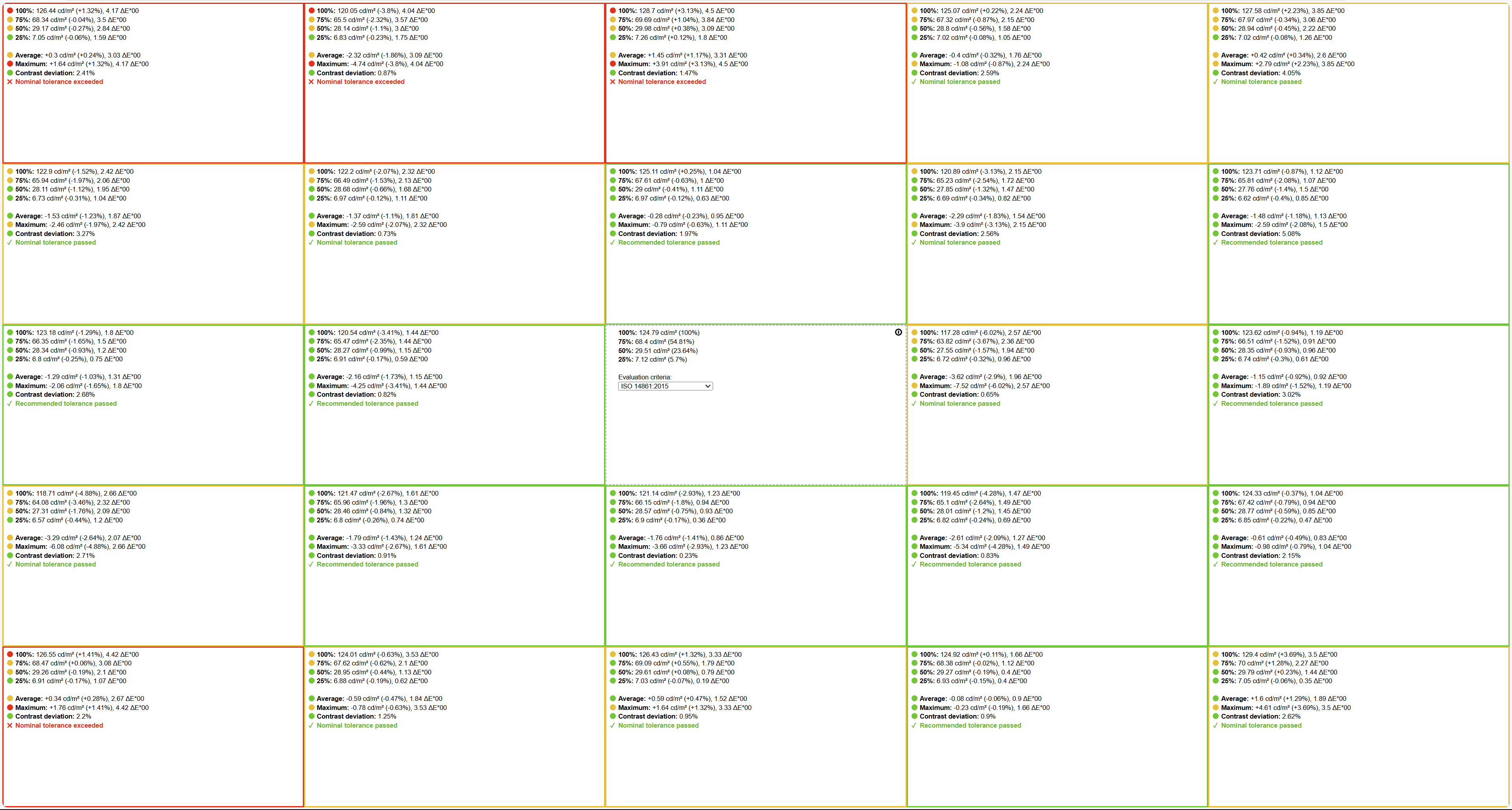 | Максимальная ΔE*00 | 0,77 | 0,9 | 1,34 | 0,95 | 0,67 | 0,91 | 0,93 | 1,31 | 0,58 | - | 1,09 | 1,2 | 1,22 | 0,99 |