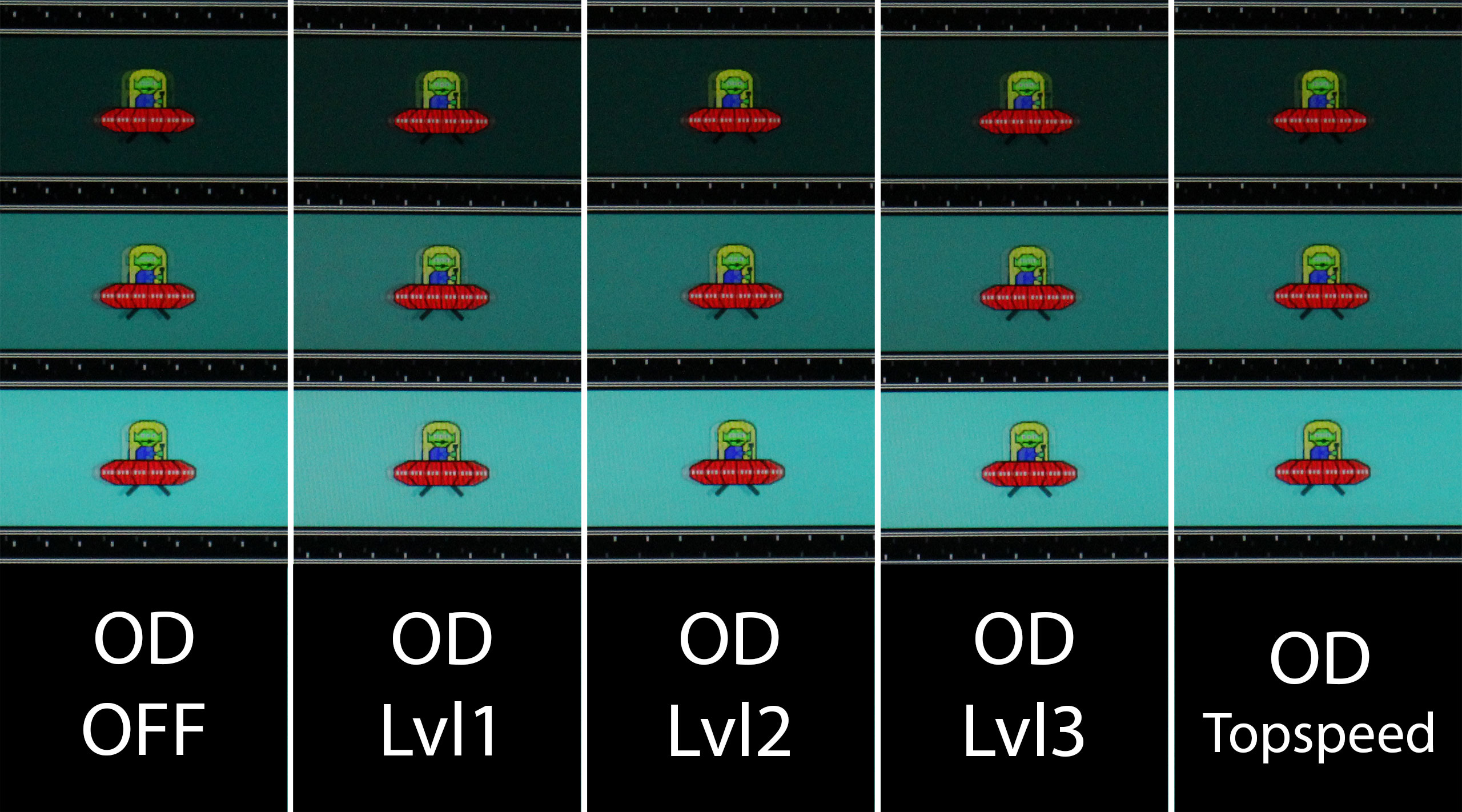 Время отклика 1 мс (GtG) обеспечивает четкое отображение движущихся объектов без заметного размытия или ореолов. Для овердрайва есть пять режимов: Off, Level 1/2/3 и Topspeed.