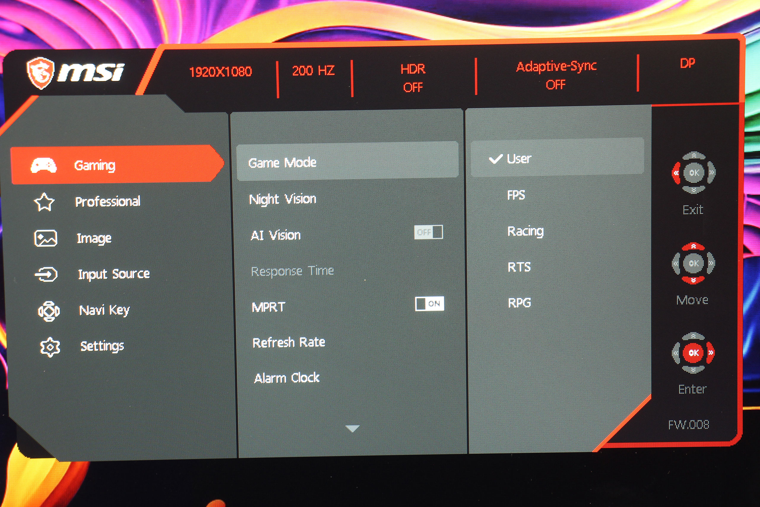Раздел Gaming содержит предварительно настроенные профили для разных жанров игр: FPS, Racing, RTS и RPG, плюс режим по умолчанию под названием User. Каждый профиль оптимизирует параметры яркости, контрастности и цветовой температуры в соответствии с тем, как специфику жанра видят в MSI. Технология AI Vision заслуживает отдельного внимания — это алгоритм, который автоматически повышает детализацию в темных областях изображения, не влияя на общую яркость. Функция особенно полезна в играх с большим количеством темных сцен, где важно различать детали в тенях. Помимо этого, доступна более прямолинейная функция Night Vision. Также из специфически геймерских функций присутствует отображение прицела, таймера и частоты обновления на экране. Кроме того, в разделе Gaming можно выбрать скорость отклика (Normal/Fast/Fastest), активировать MPRT и Adaptive Sync.