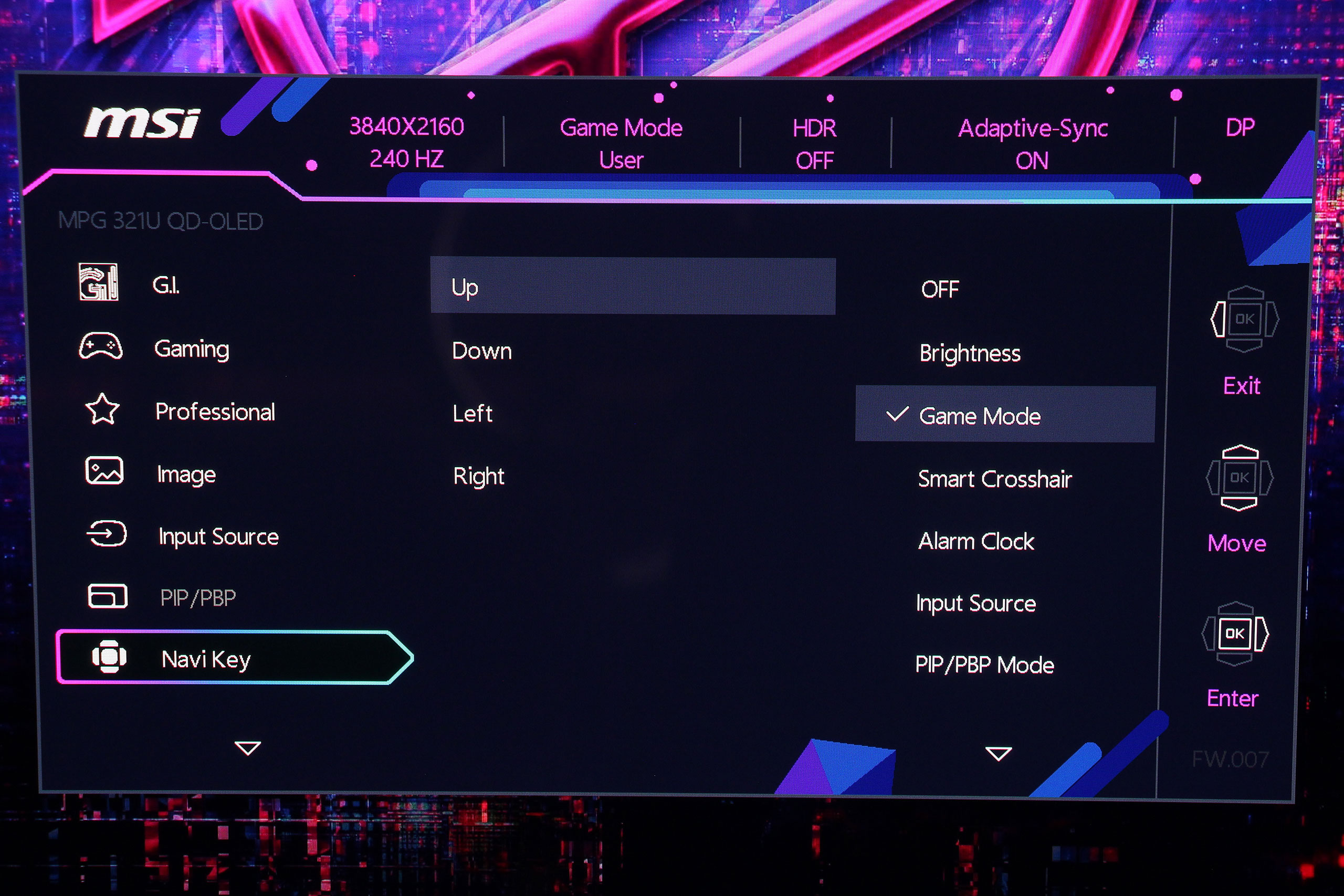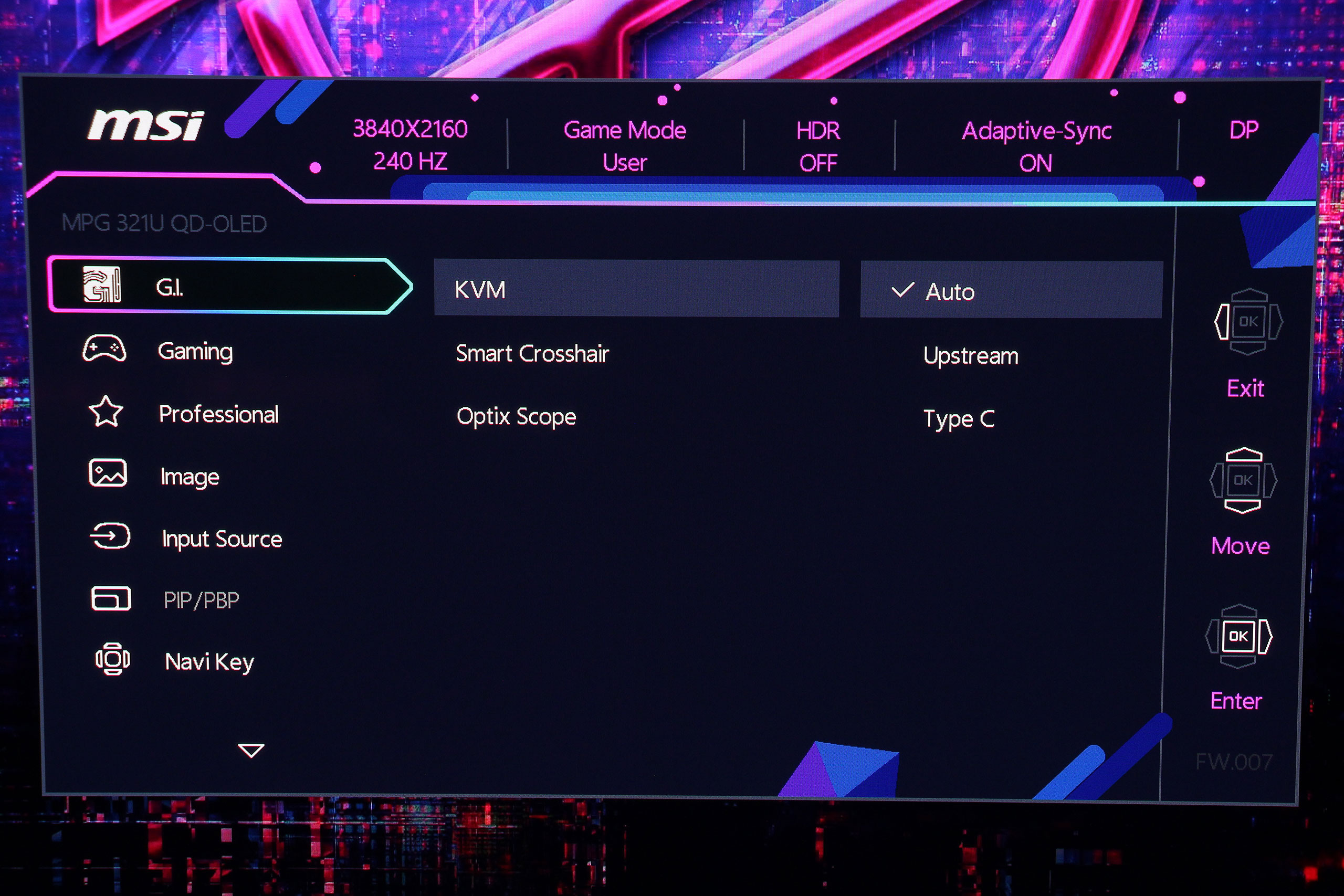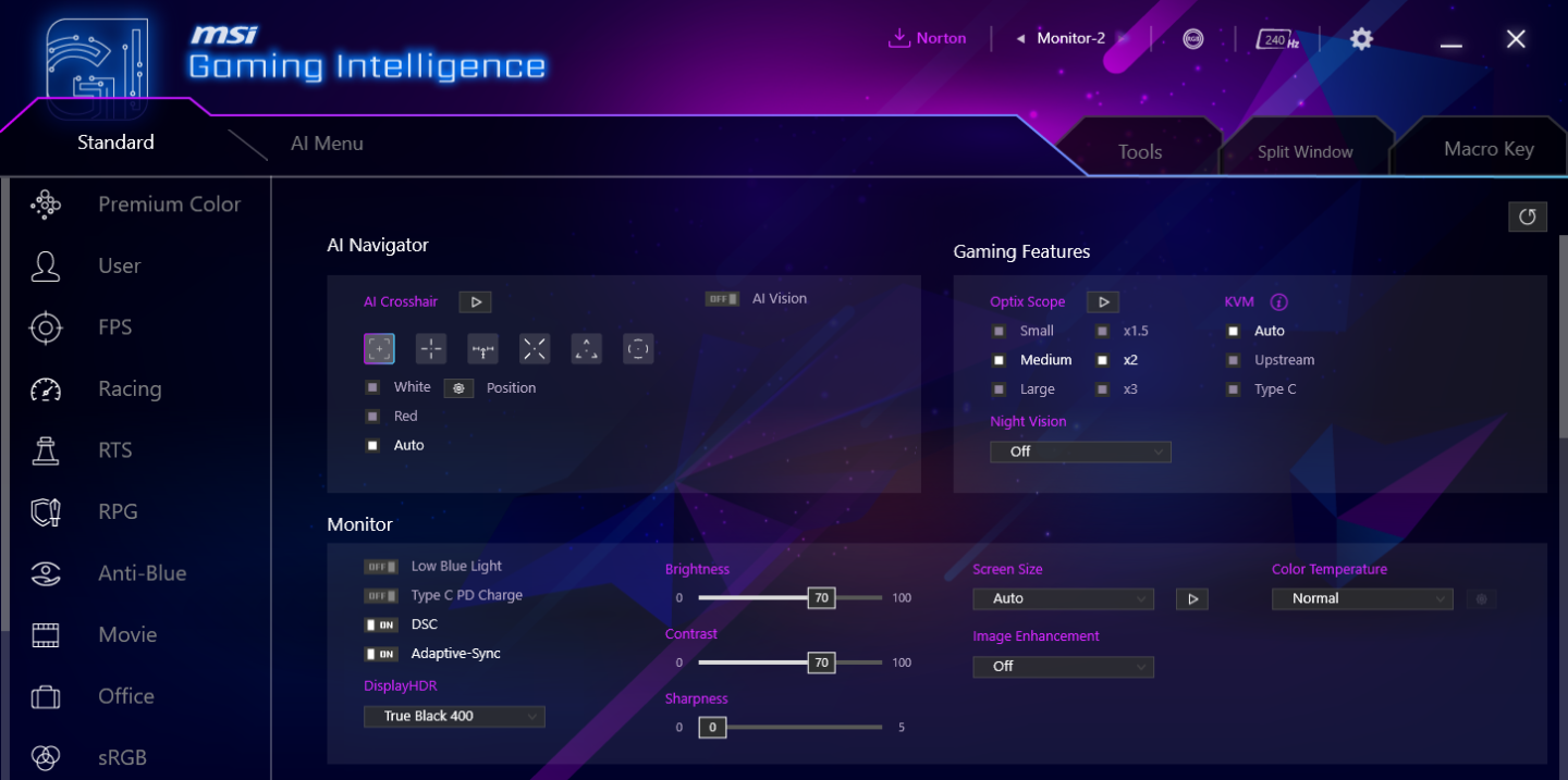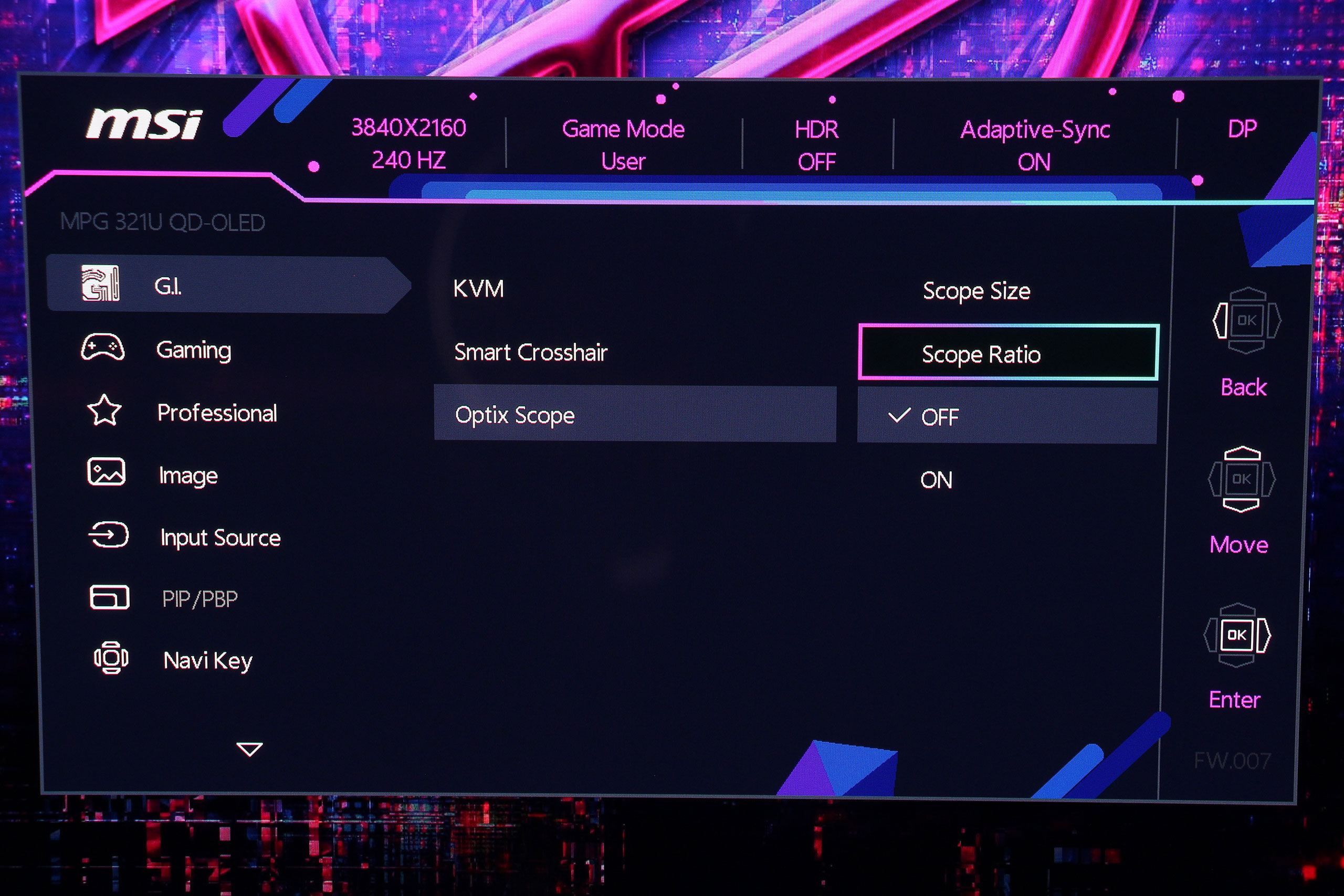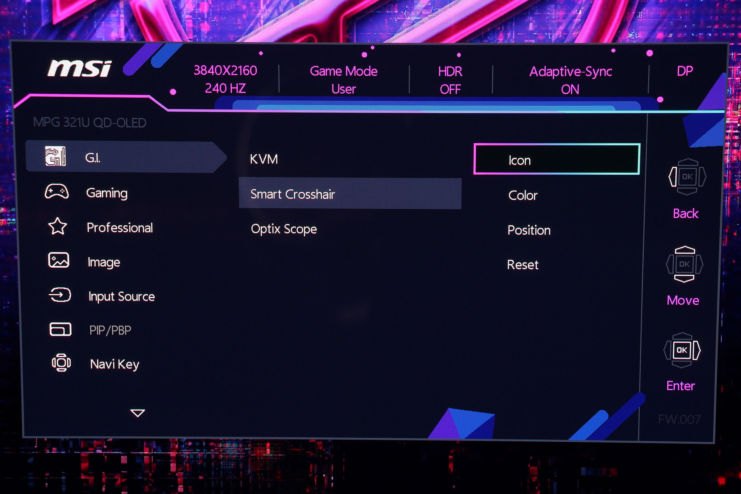 Экранное меню MSI имеет логическую структуру с четкой навигацией через центральный джойстик. Интерфейс организован в несколько основных категорий, каждая из которых содержит соответствующие параметры для настройки изображения и функций монитора. На удивление, меню оказалось лаконичнее некоторых предыдущих моделей, впрочем, все важные пункты — на месте. Первой идет вкладка G.I. (Gaming Intelligence), предлагающая настройки KVM, а также возможность отобразить аппаратное перекрестие прицела или даже «снайперский» прицел Optix Scope.
