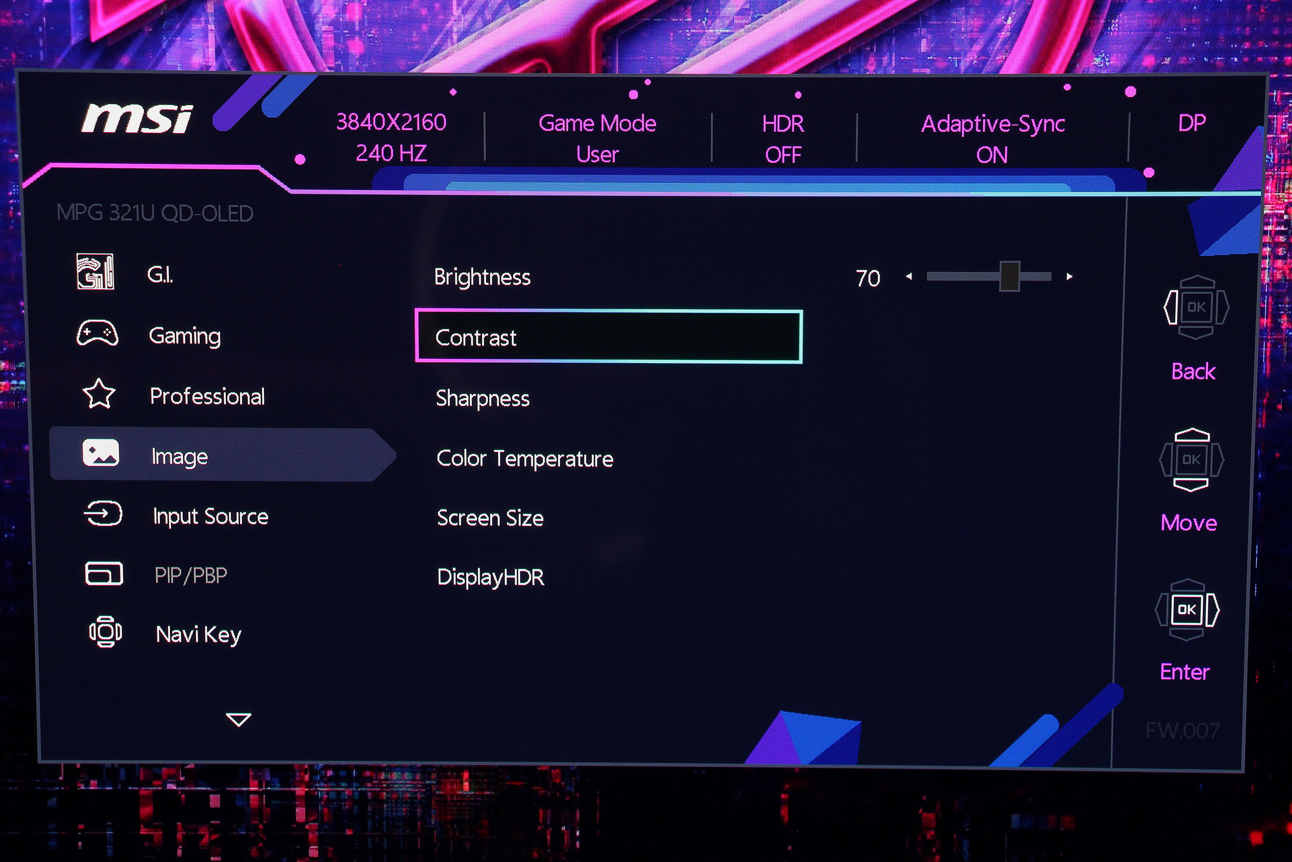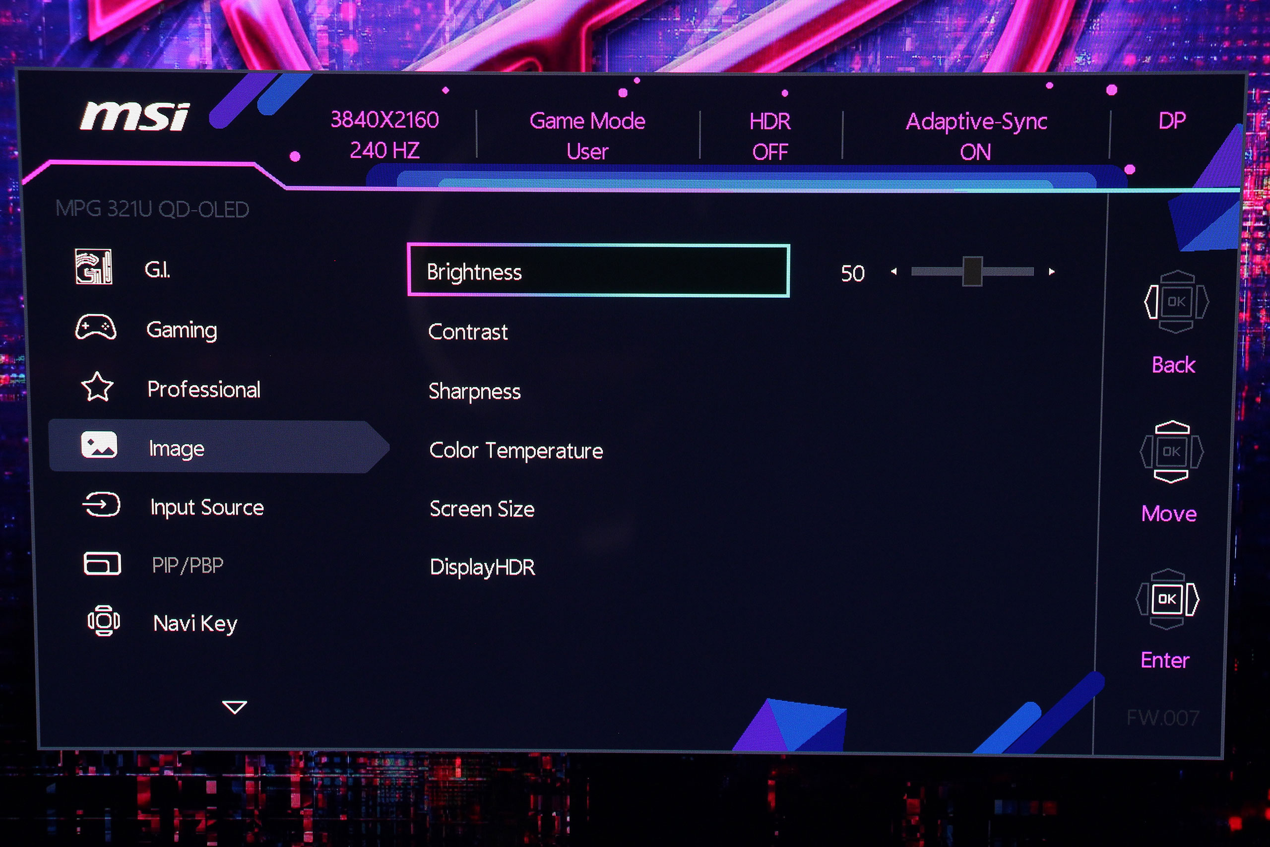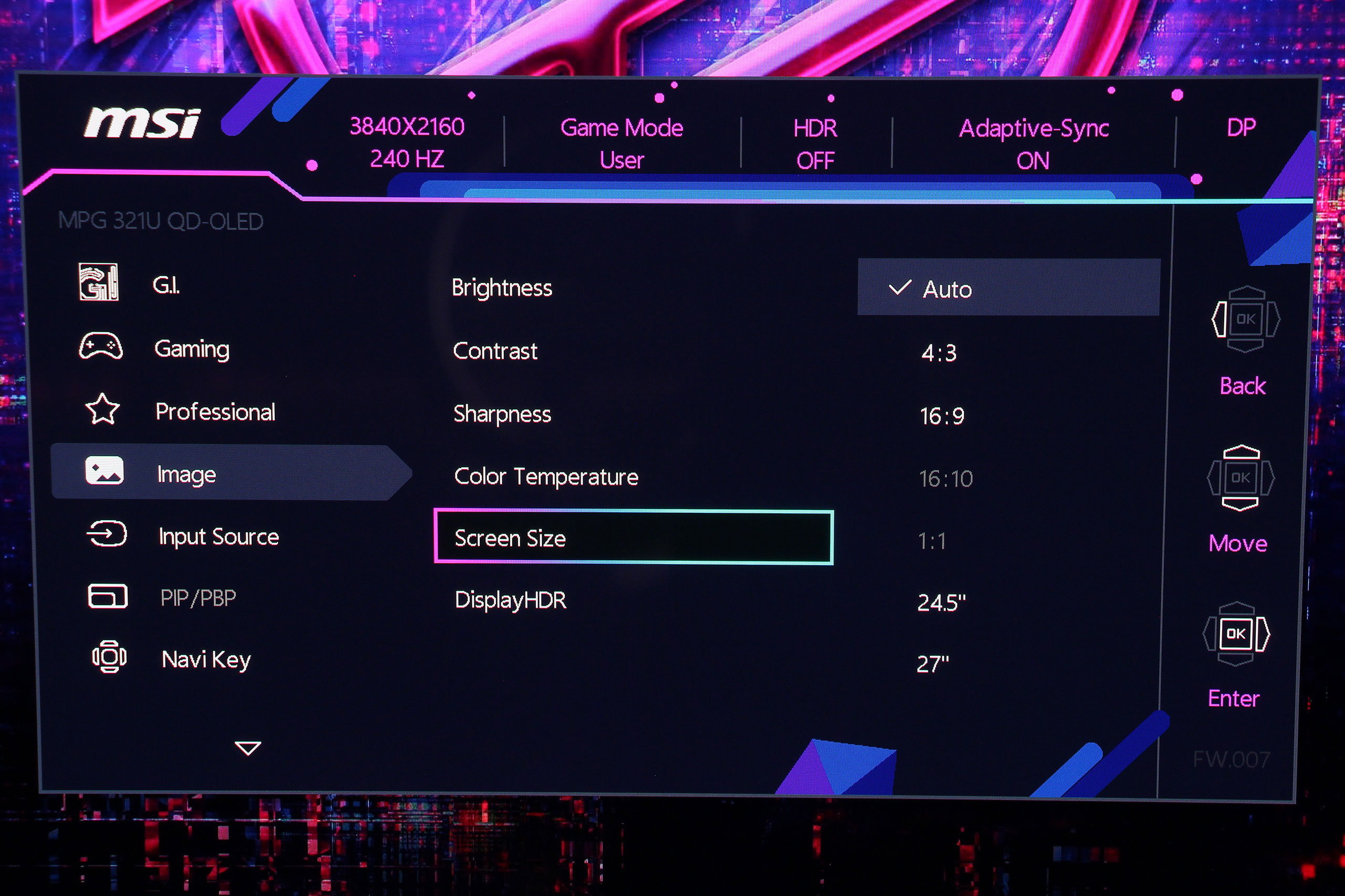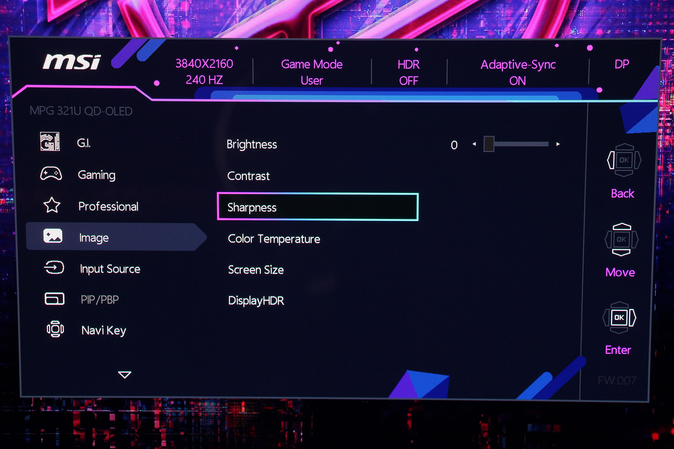 Экранное меню MSI имеет логическую структуру с четкой навигацией через центральный джойстик. Интерфейс организован в несколько основных категорий, каждая из которых содержит соответствующие параметры для настройки изображения и функций монитора. На удивление, меню оказалось лаконичнее некоторых предыдущих моделей, впрочем, все важные пункты — на месте. Первой идет вкладка G.I. (Gaming Intelligence), предлагающая настройки KVM, а также возможность отобразить аппаратное перекрестие прицела или даже «снайперский» прицел Optix Scope.