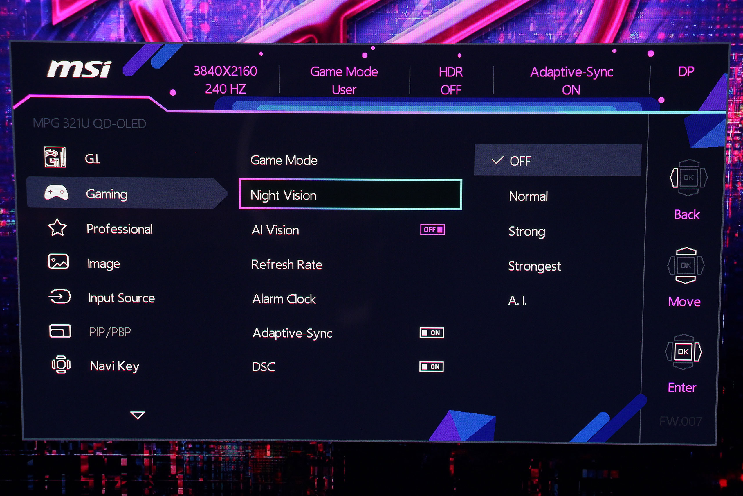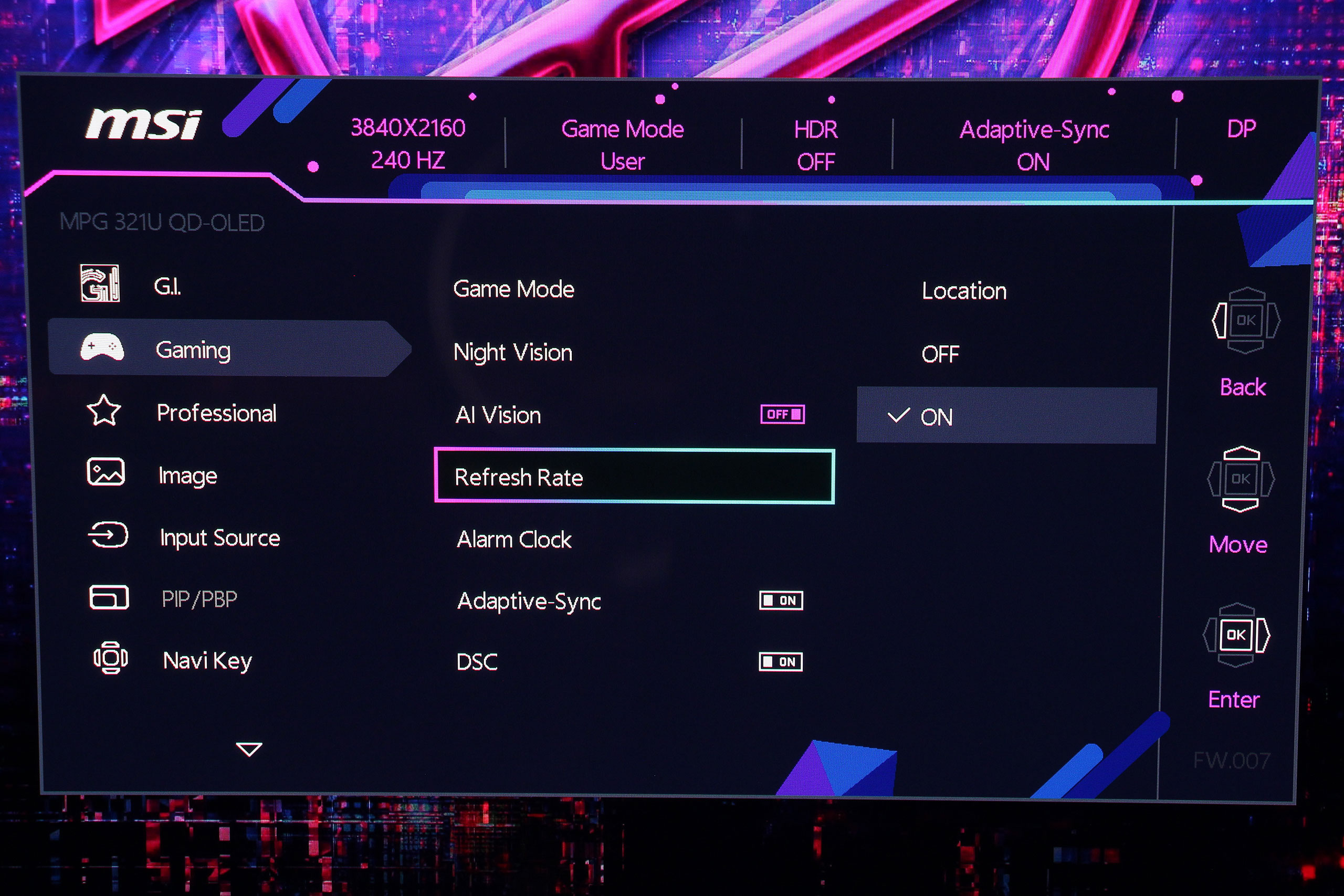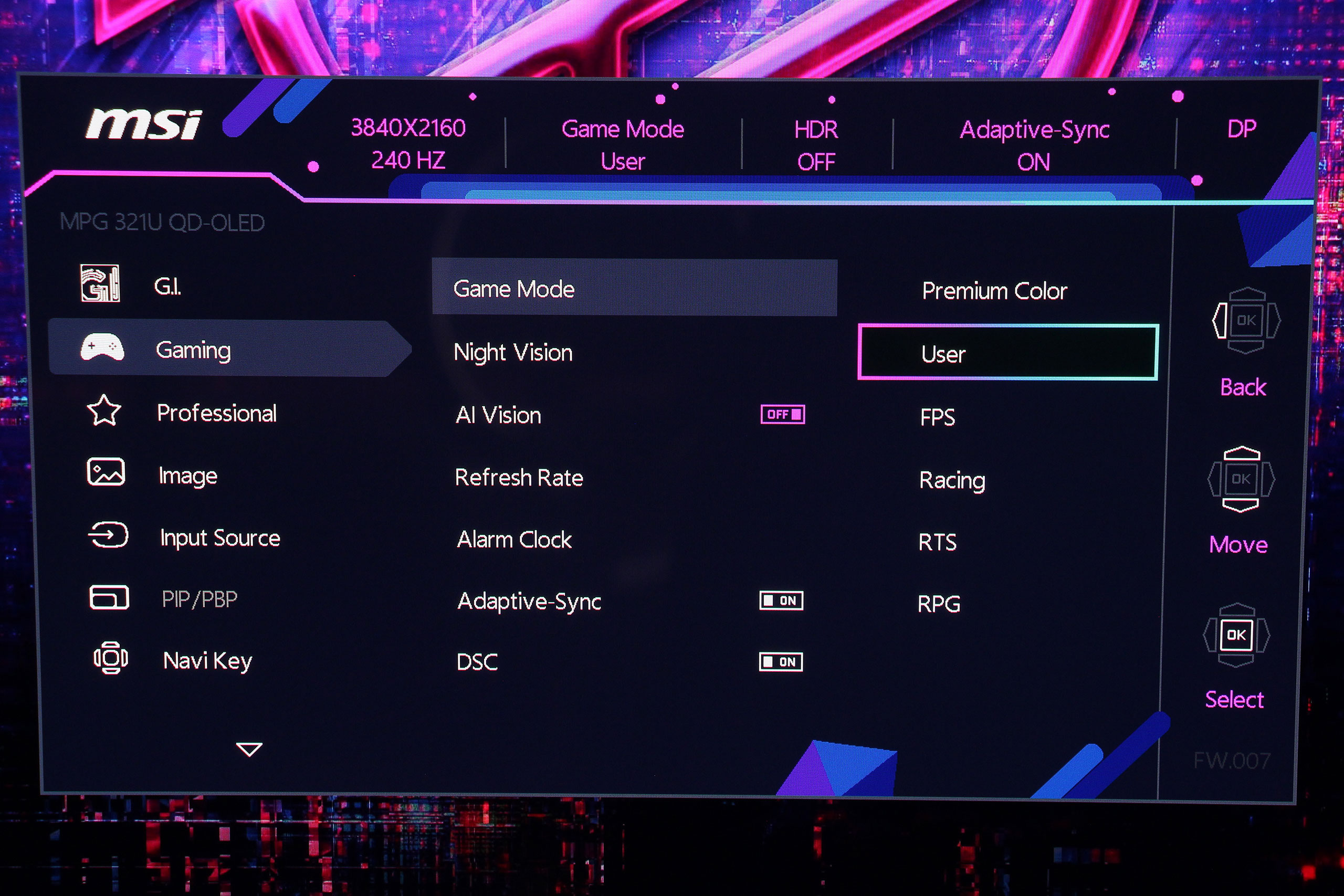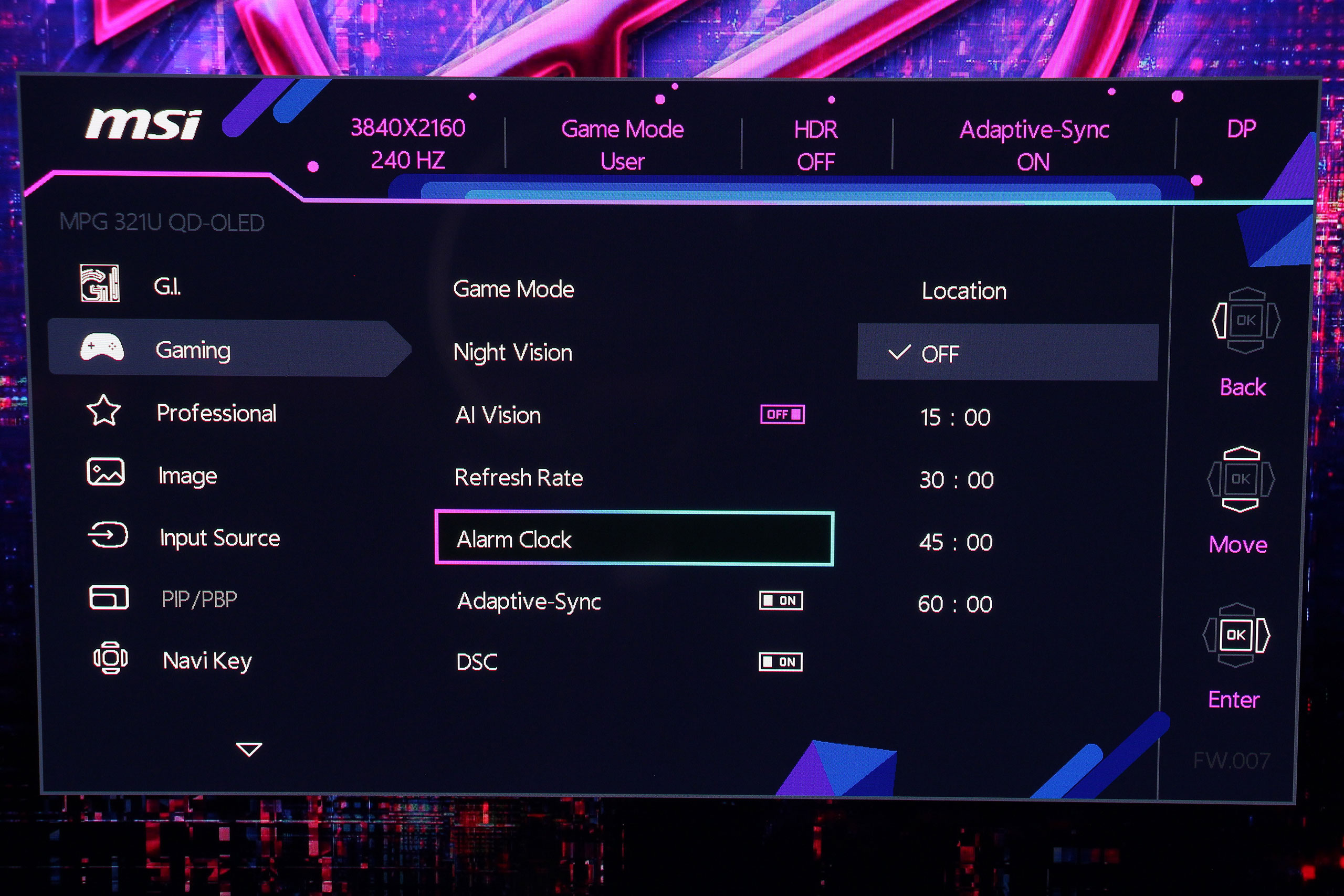 Раздел Gaming включает ключевые функции для игрового процесса. Здесь размещены профили настроек для разных жанров, настройки адаптивной синхронизации, «улучшители» изображения Night Vision и AI Vision, а также будильник и, наконец, правильно названный индикатор частоты обновления (ранее его ошибочно именовали счетчиком кадров).