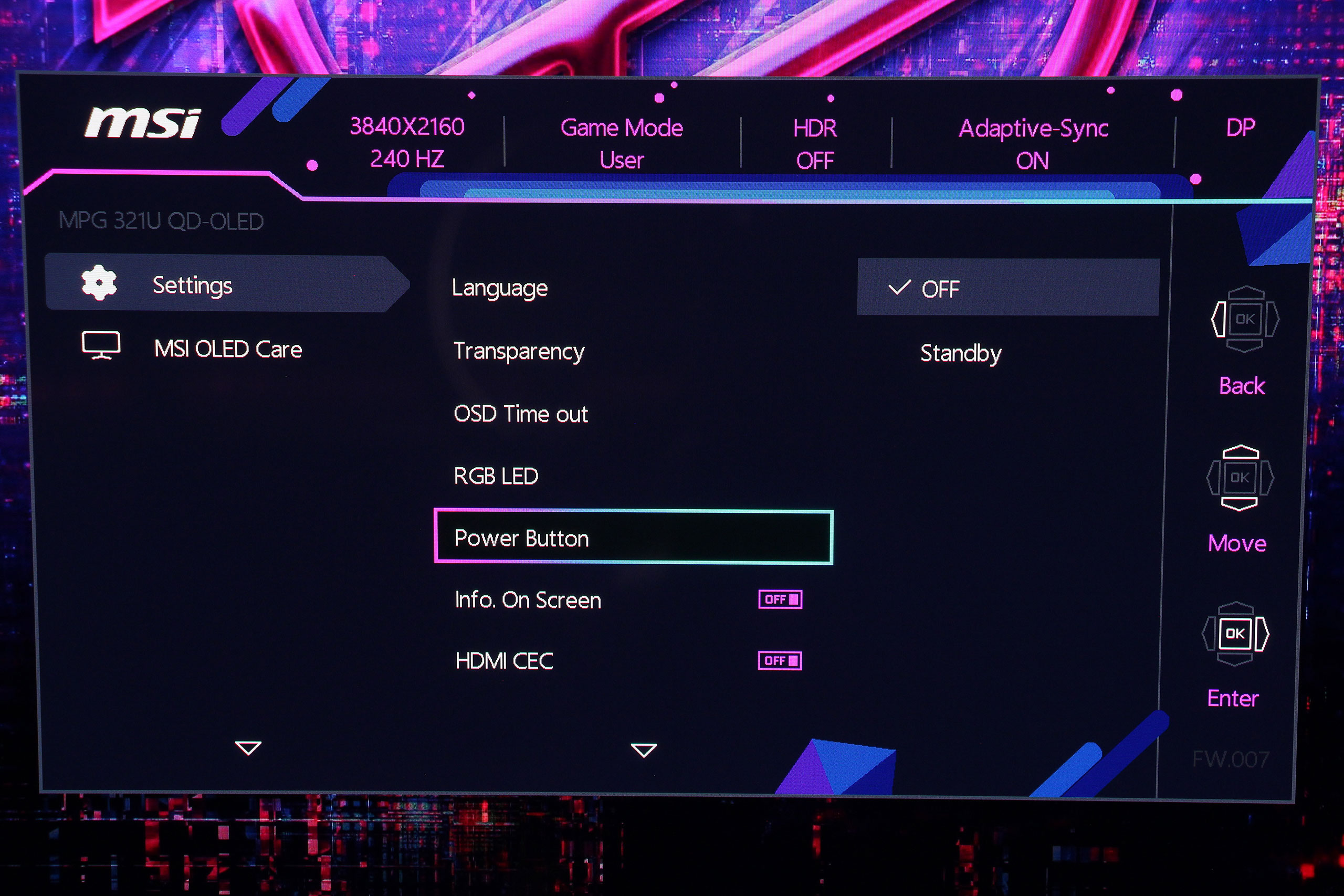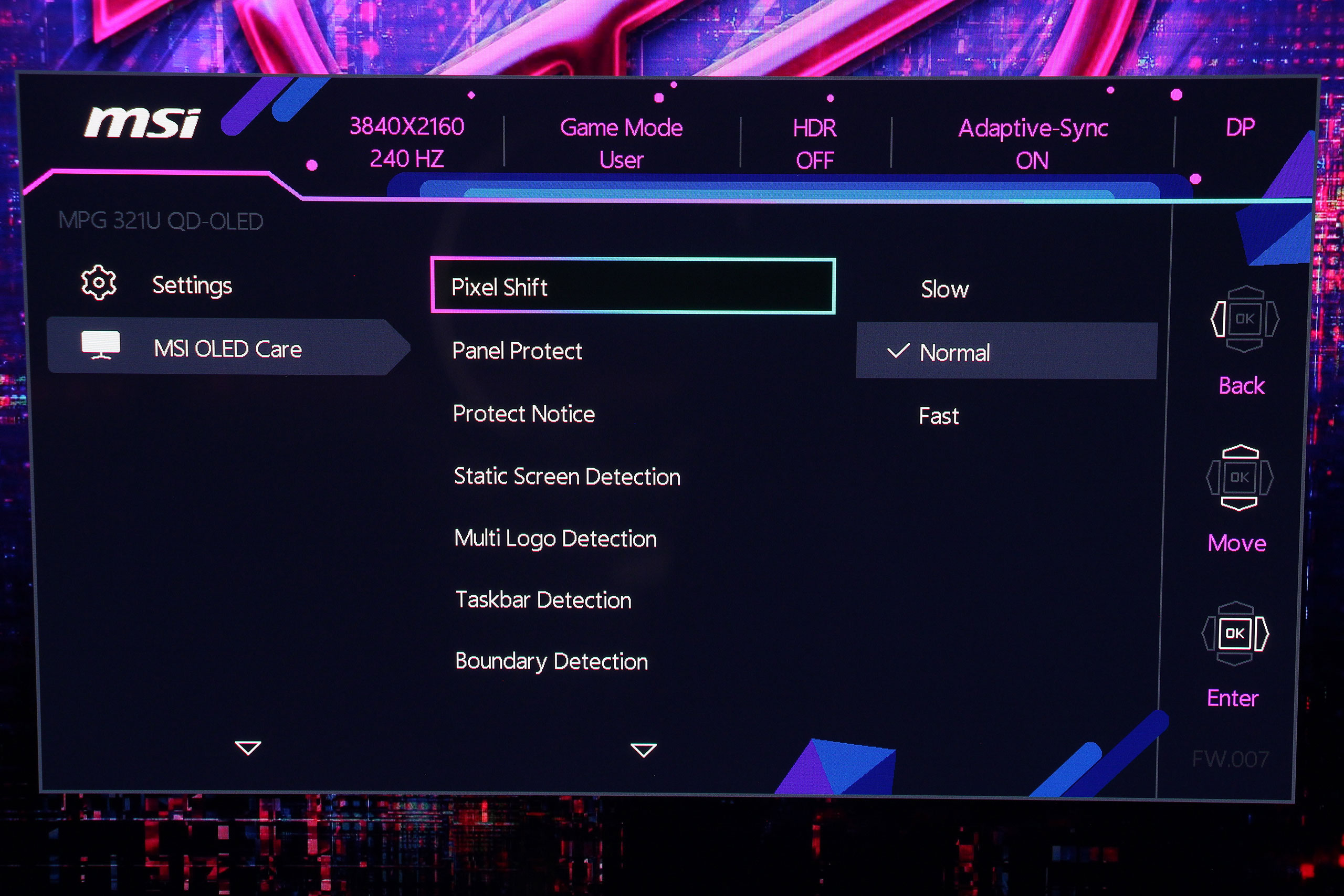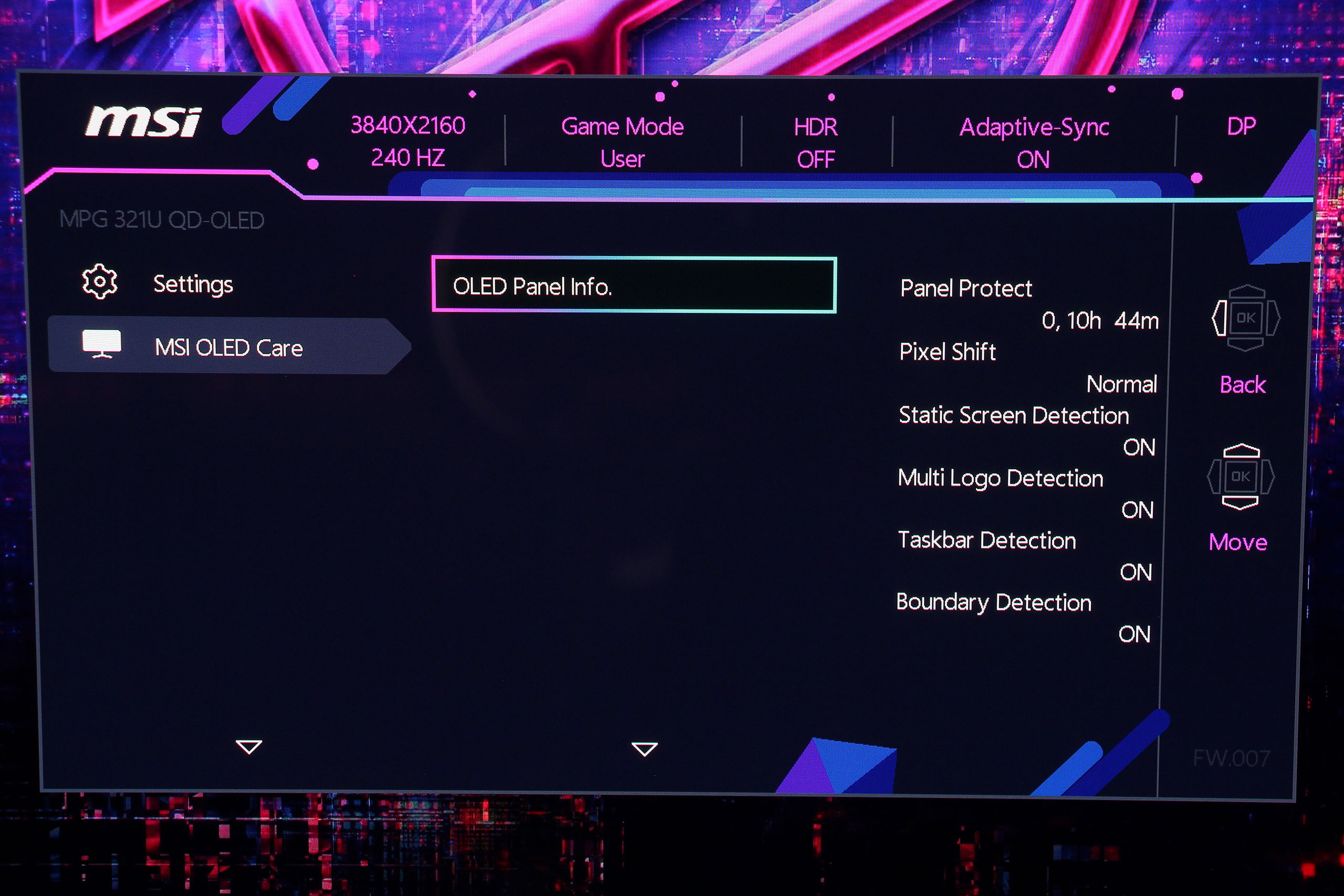 OLED Care объединяет все функции защиты панели от выгорания. Система включает Pixel Shift, незаметно смещающий изображение на несколько пикселей для предотвращения статической нагрузки на отдельные участки, Panel Protect — цикл восстановления пикселей для очистки панели и восстановления равномерности, Static Screen Detection для автоматического затемнения статических элементов интерфейса после определенного периода бездействия, а также Taskbar Detection для распознавания и защиты области панели задач Windows.