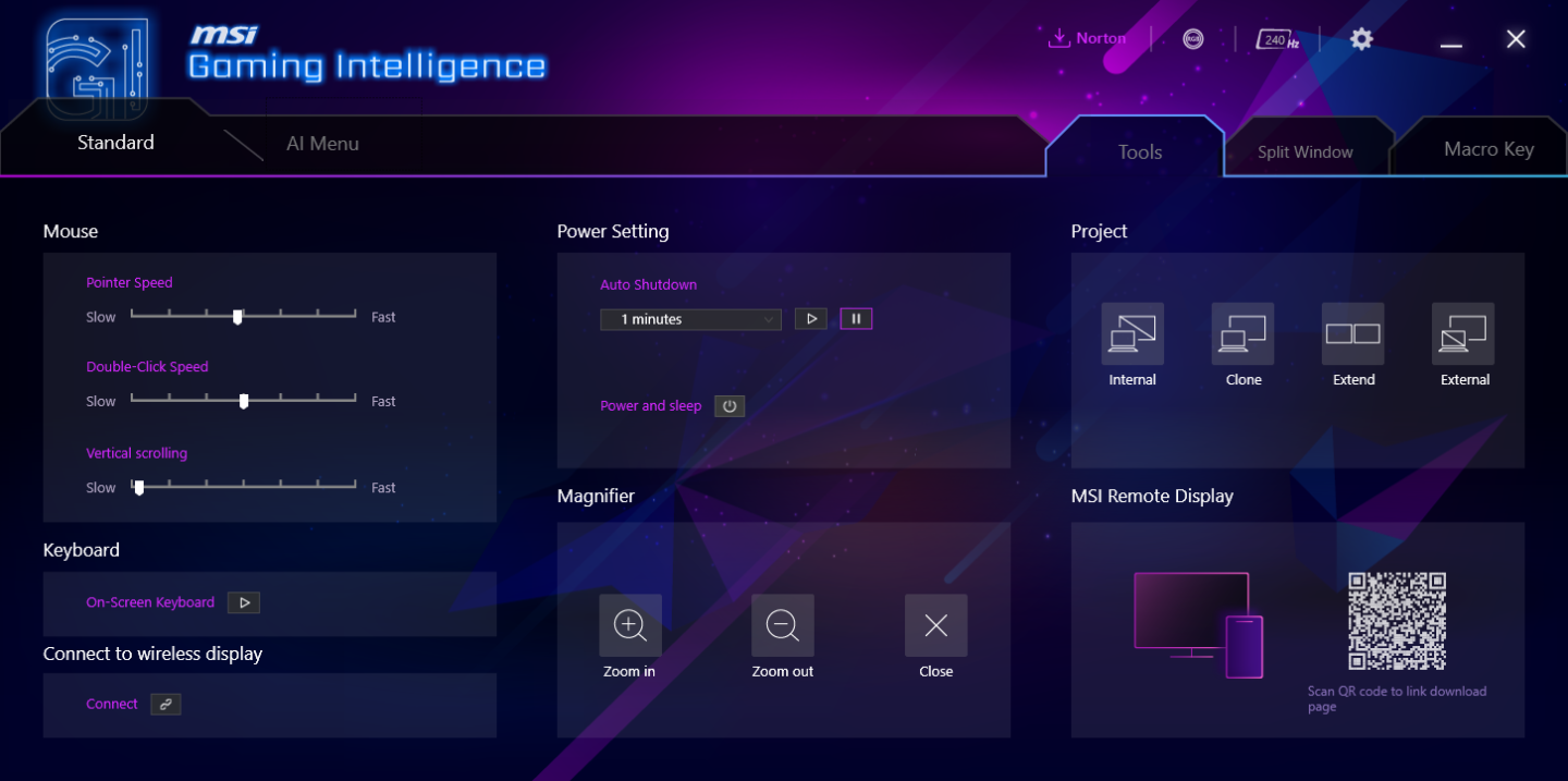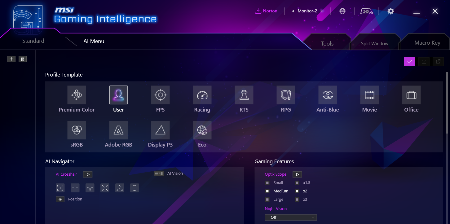 Графический интерфейс организован в виде вкладок с интуитивной структурой и дублирует большинство функций экранного меню с дополнительным удобством управления с помощью мыши. Главный экран отображает текущий профиль изображения и основные параметры с возможностью быстрой настройки ползунками и числовыми значениями. Это упрощает точную калибровку по сравнению с использованием кнопок на мониторе. Интерфейс Gaming Intelligence выглядит современно и работает стабильно.