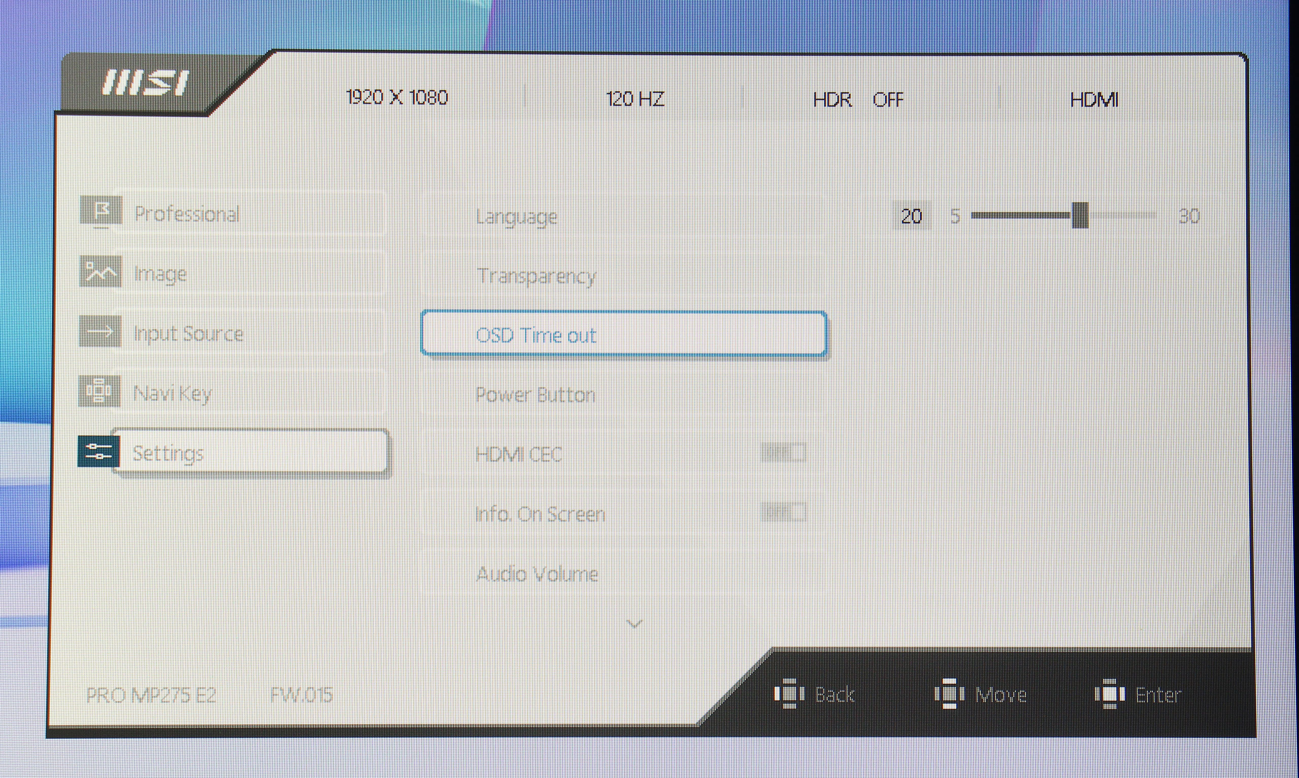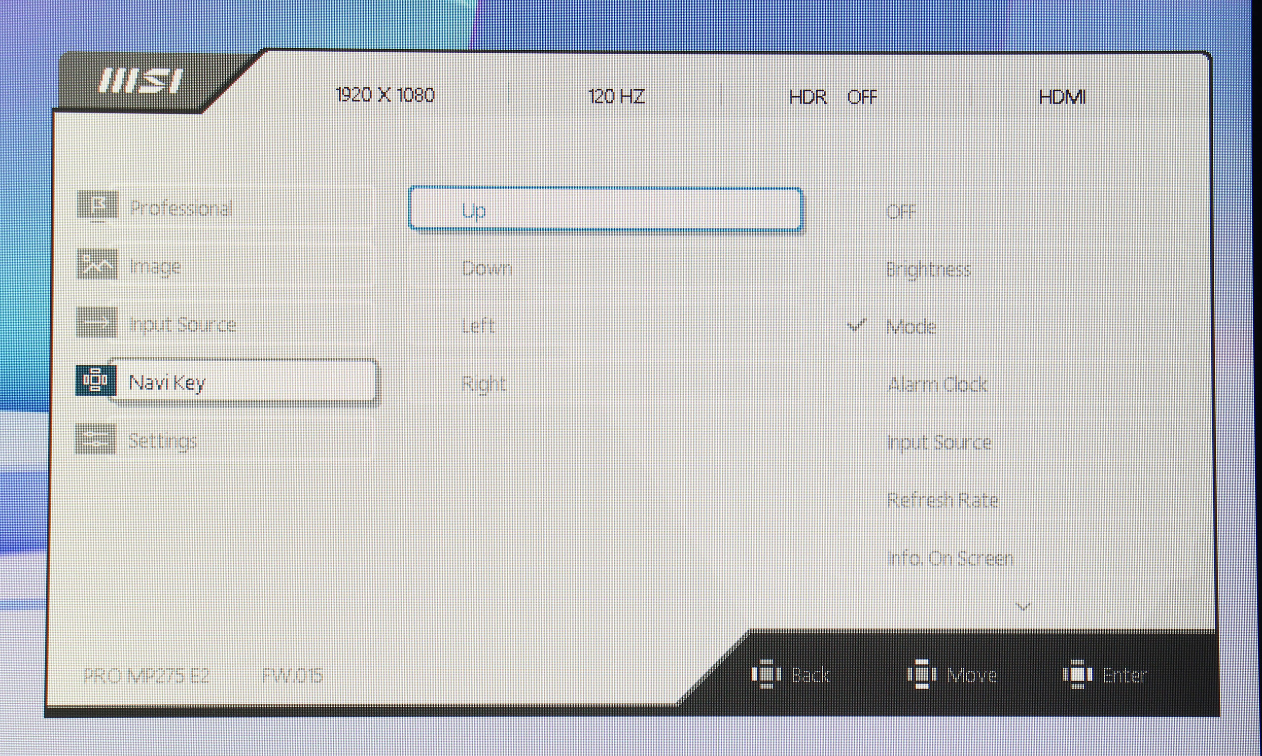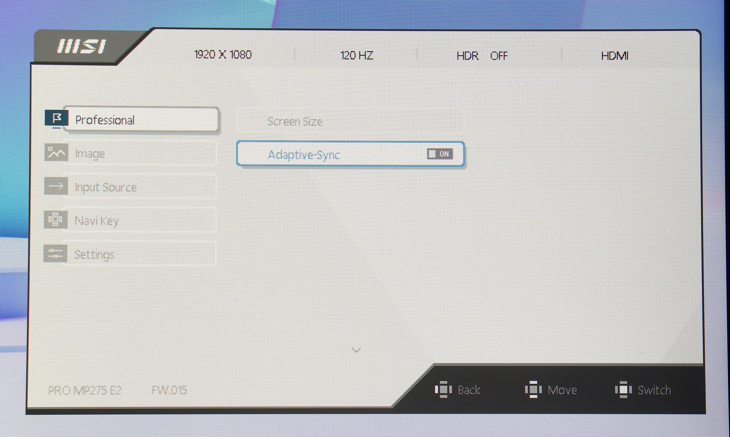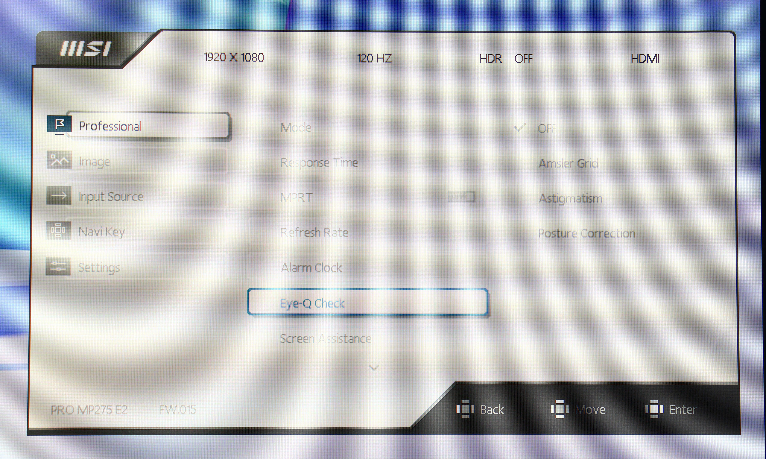 Управление монитором осуществляется с помощью одного джойстика, расположенного на задней панели. Такое решение оказывается довольно удобным и интуитивно понятным. Экранное меню (OSD) имеет незамысловатую структуру. Первая вкладка — Professional, дает возможность выбрать один из семи имеющихся профилей, настроить овердрайв и MPRT, включить VESA Adaptive Sync, активировать встроенный будильник и различные индикаторы. Также, здесь есть раздел Eye‑Q Check, который предлагает инструменты для проверки зрения и напоминания о необходимости отдыха: тест на астигматизм, сетка Амслера для проверки зрения и нехитрый инструмент для коррекции осанки.