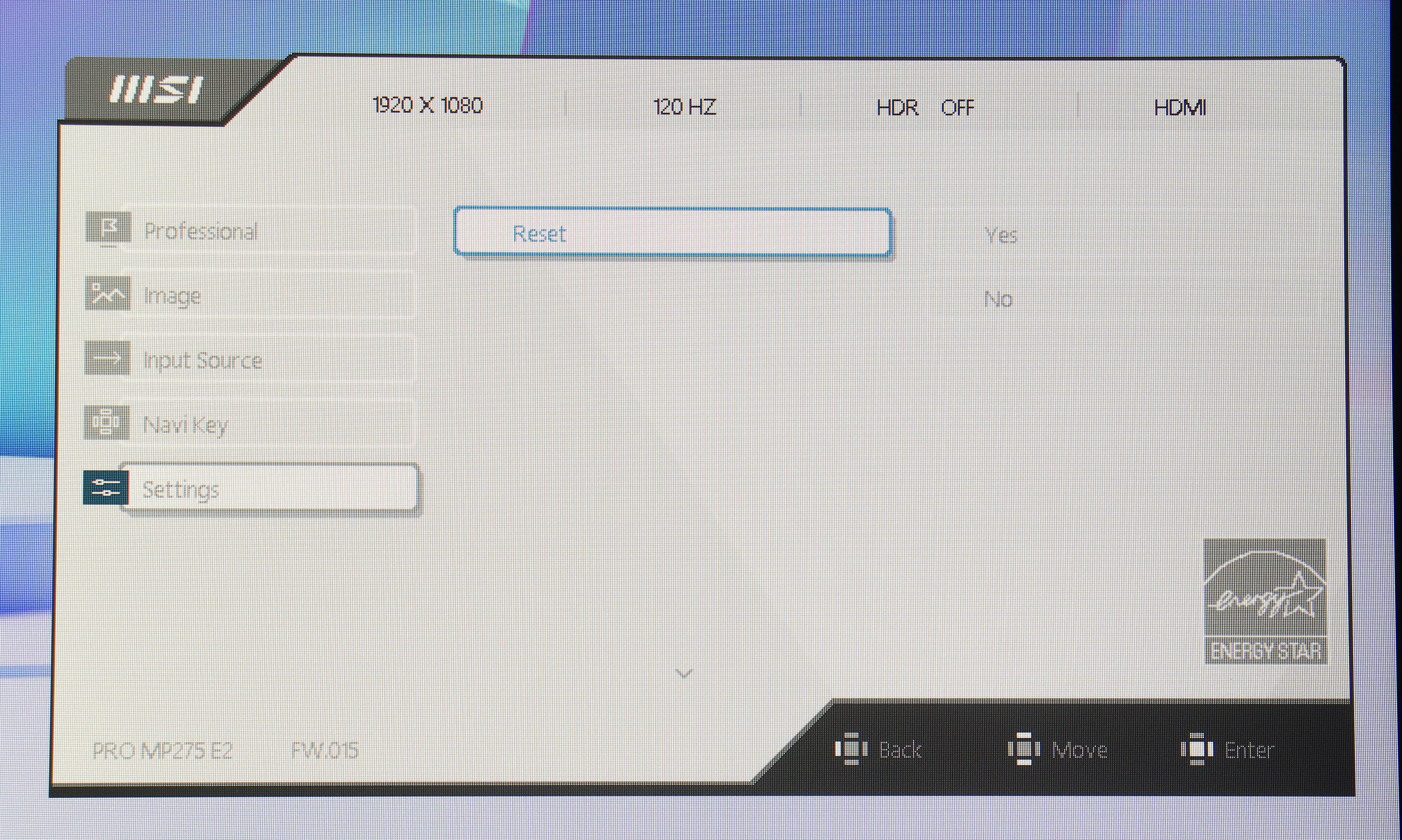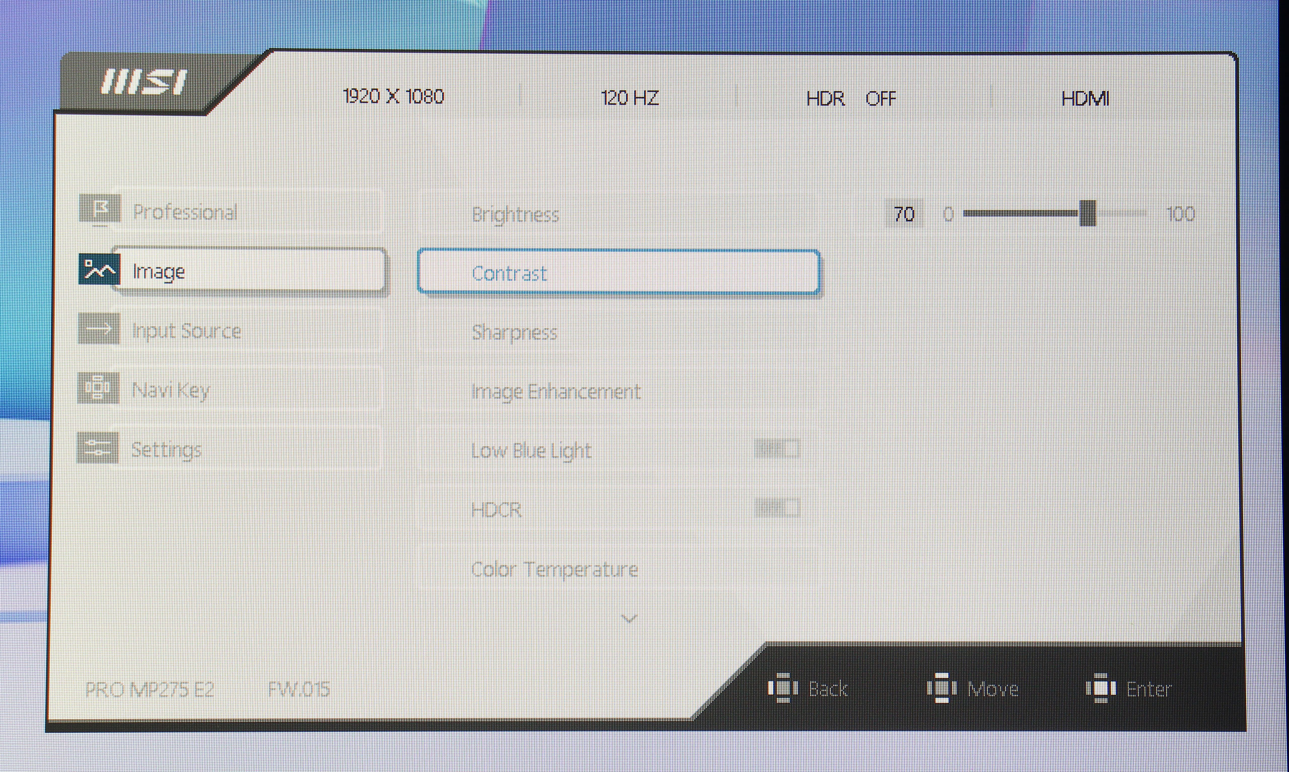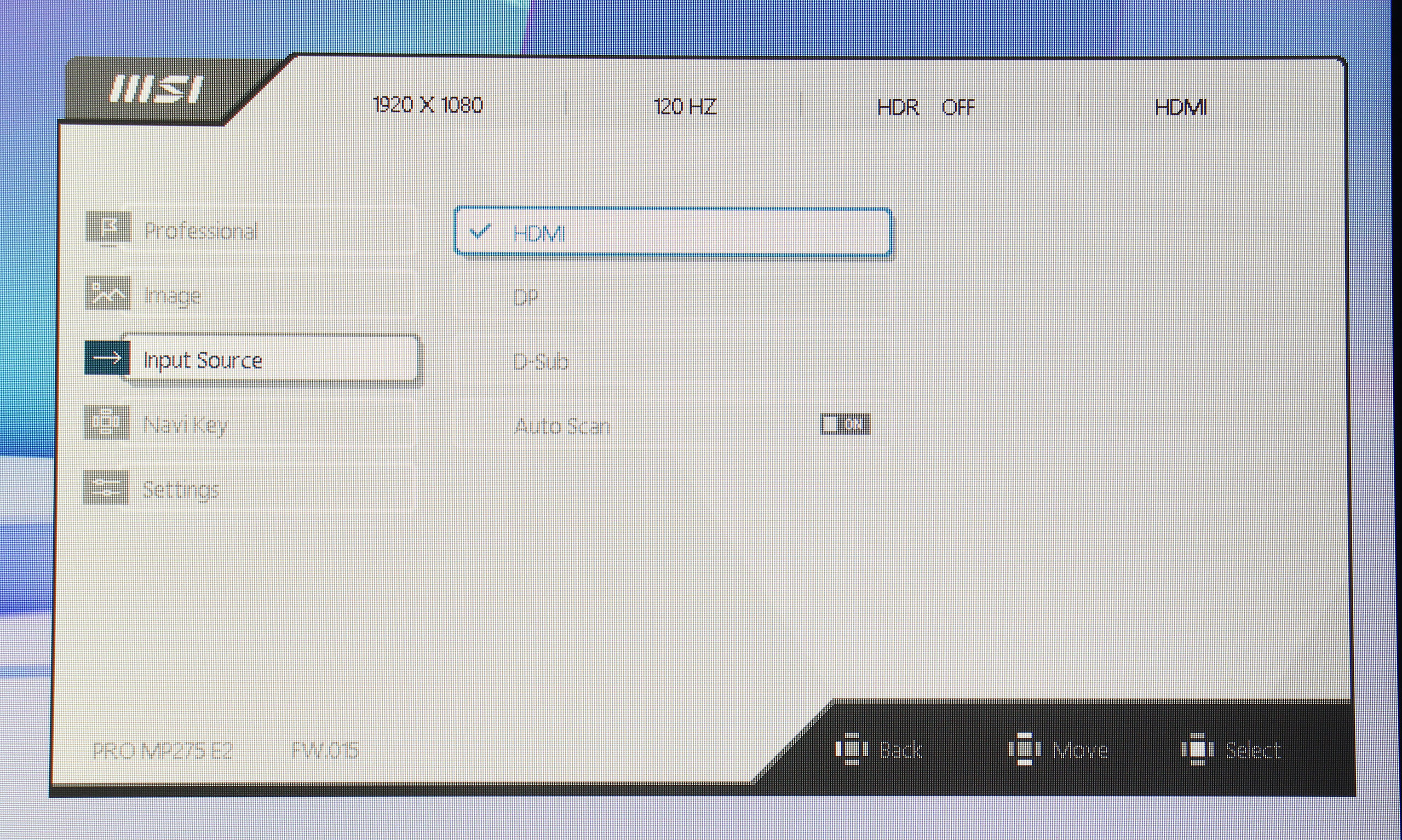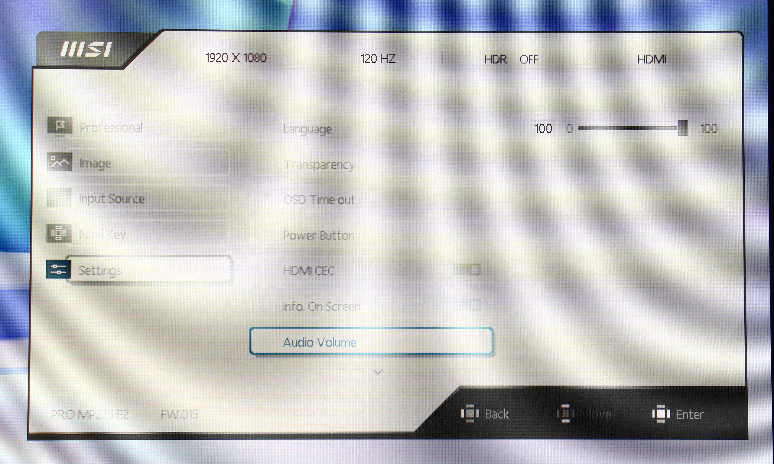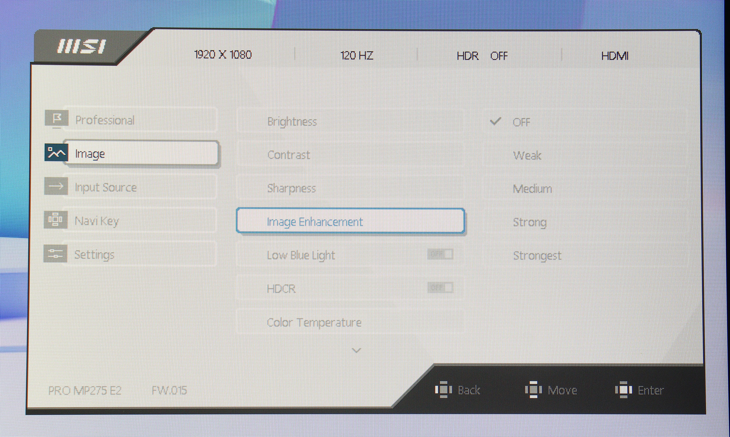 Управление монитором осуществляется с помощью одного джойстика, расположенного на задней панели. Такое решение оказывается довольно удобным и интуитивно понятным. Экранное меню (OSD) имеет незамысловатую структуру. Первая вкладка — Professional, дает возможность выбрать один из семи имеющихся профилей, настроить овердрайв и MPRT, включить VESA Adaptive Sync, активировать встроенный будильник и различные индикаторы. Также, здесь есть раздел Eye‑Q Check, который предлагает инструменты для проверки зрения и напоминания о необходимости отдыха: тест на астигматизм, сетка Амслера для проверки зрения и нехитрый инструмент для коррекции осанки.