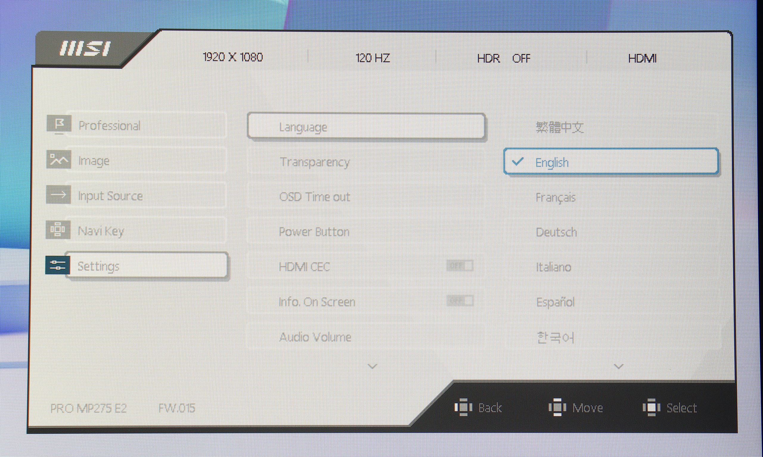 Вкладка Input Source соответствует своему названию и управляет источником сигнала. Аналогично и Navy Key, которая полностью посвящена перенастройке быстрых функций джойстика. Наконец, во вкладке Settings собраны общие пункты, как-то язык (к сожалению, без украинского), громкость звука, режим работы кнопки включения, HDMI CEC, прозрачность экранного меню и сброс к заводским настройкам.