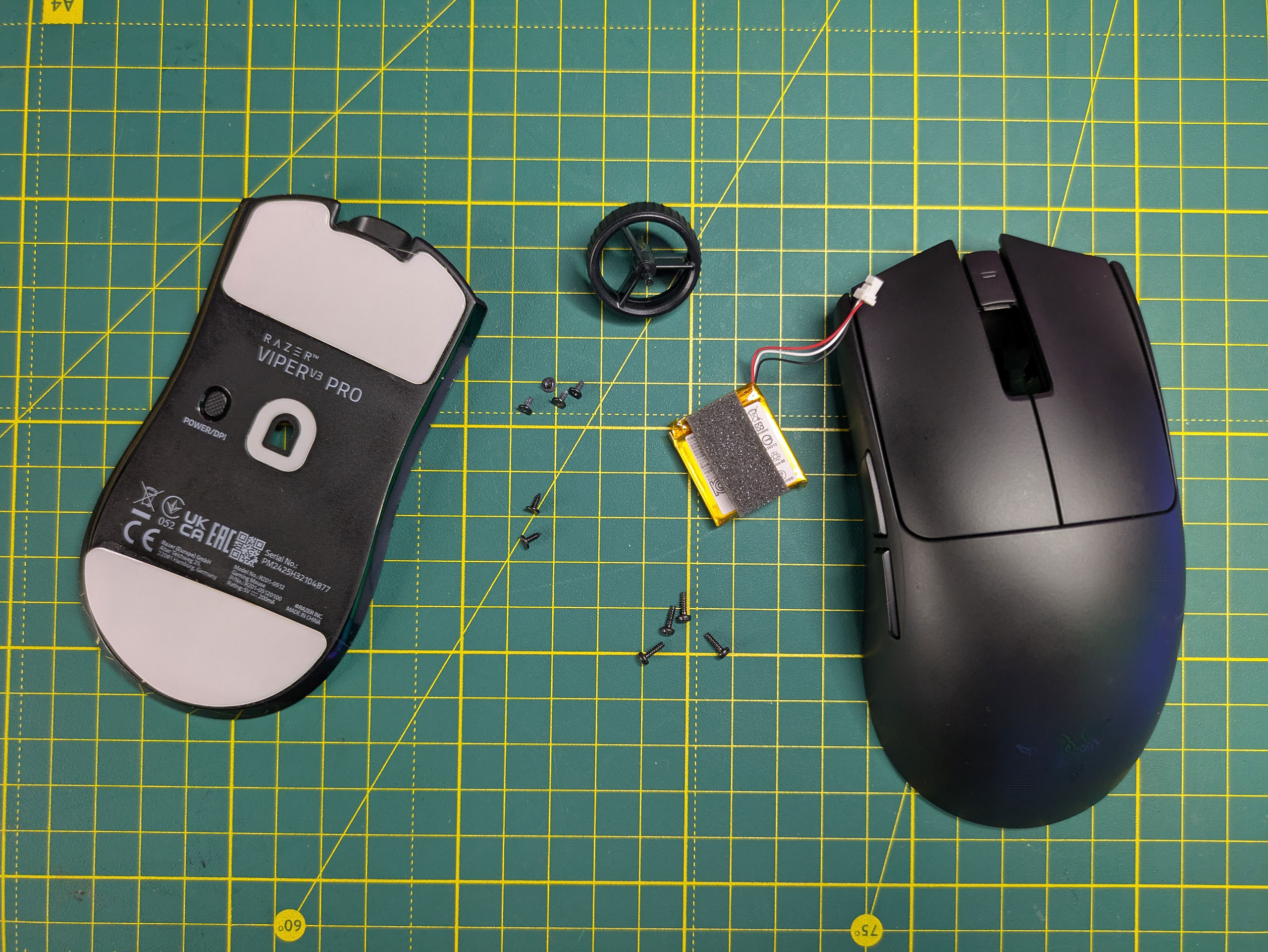 Сначала необходимо полностью разобрать Viper V3 Pro, получив отдельно все внутренние компоненты — основную плату, боковые кнопки со шлейфом, плату колесика, батарею и все винты. Процесс требует осторожности с кабелями.