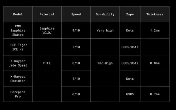 Что касается возможных глайдов, PMM на сайте дают удобную табличку разницы между вариантами, а что более интересно в таком случае — это то, что как PTFE-набор от Corepad, так и семь сапфировых глайдов весят одинаково мало по сравнению с почти 3 граммами оригинальных глайдов Viper V3 Pro: