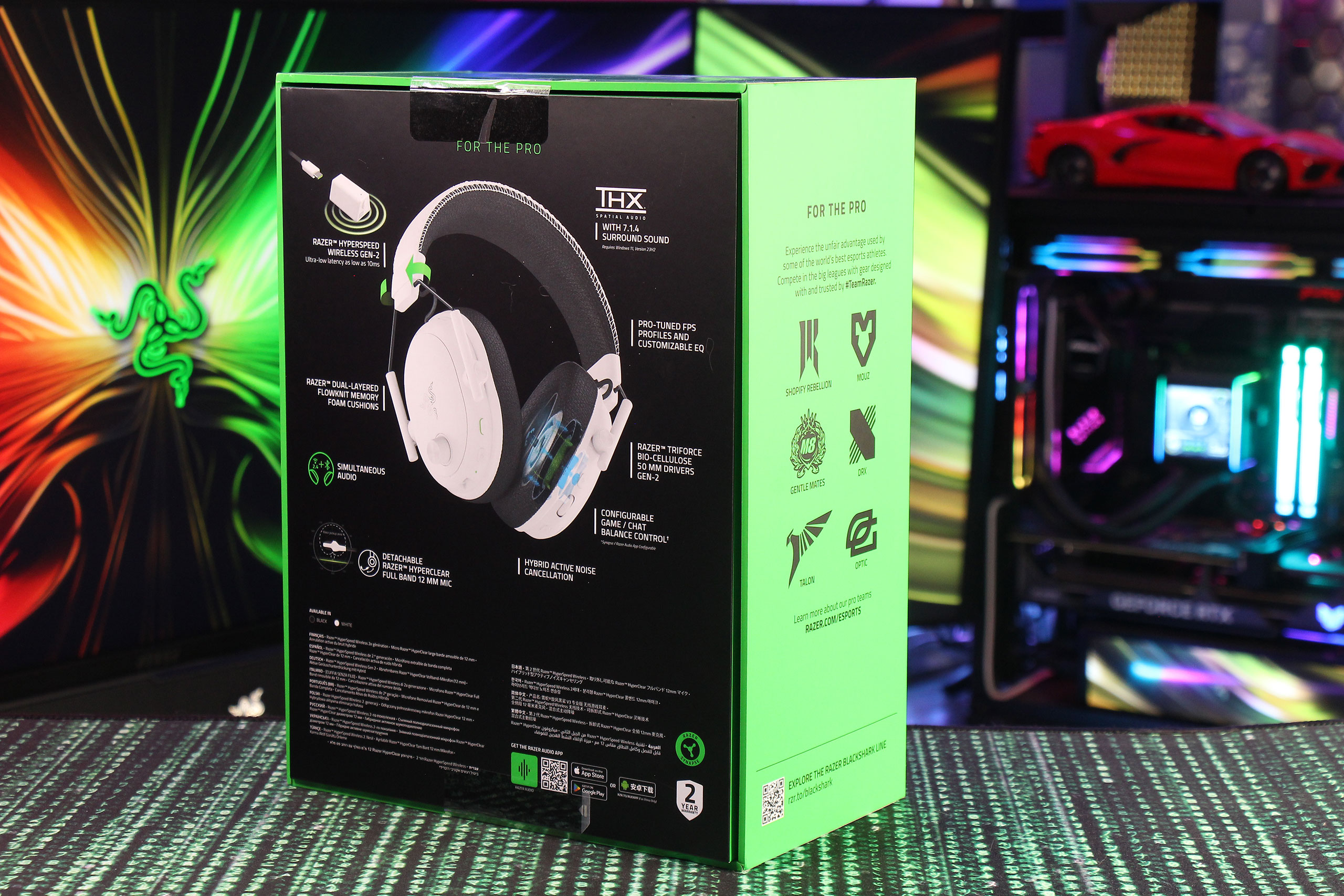 Razer BlackShark V3 Pro поставляется в черной коробке с характерным для бренда зеленым акцентом. Упаковка выполнена качественно и сразу дает понять, что это продукт соответствующего уровня. Поскольку на тест пришел белый вариант — именно он изображен на фотографиях, а маркировка содержит слова White Edition. Впрочем, как-то особо на этом концентрироваться не стоит, так как White Edition не является каким-то ограниченным выпуском, а просто одним из двух стандартных вариантов (второй, очевидно, черный). На коробке подробно описаны ключевые особенности устройства, включая THX Spatial Audio, Active Noise Cancellation и технологию HyperSpeed Wireless.