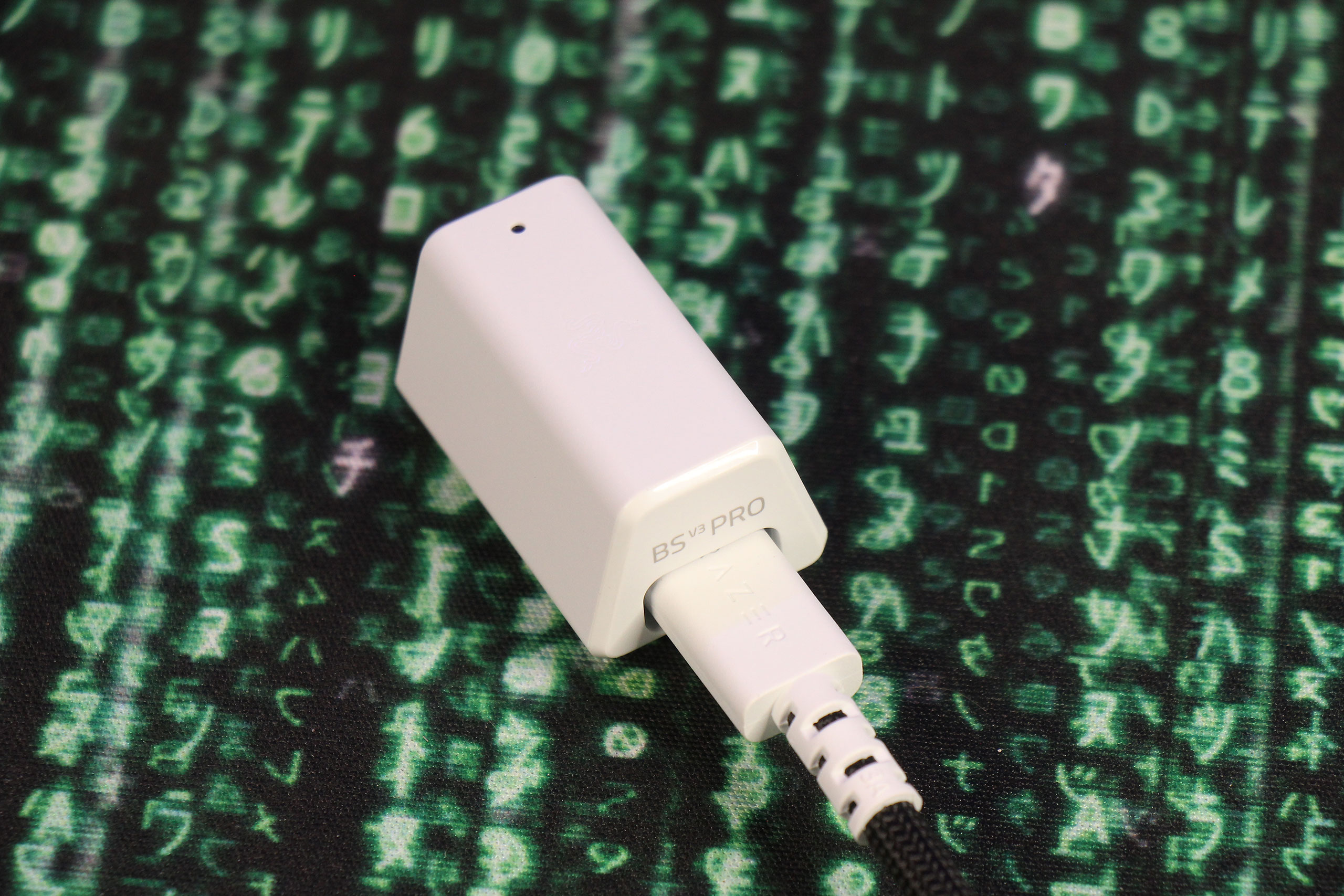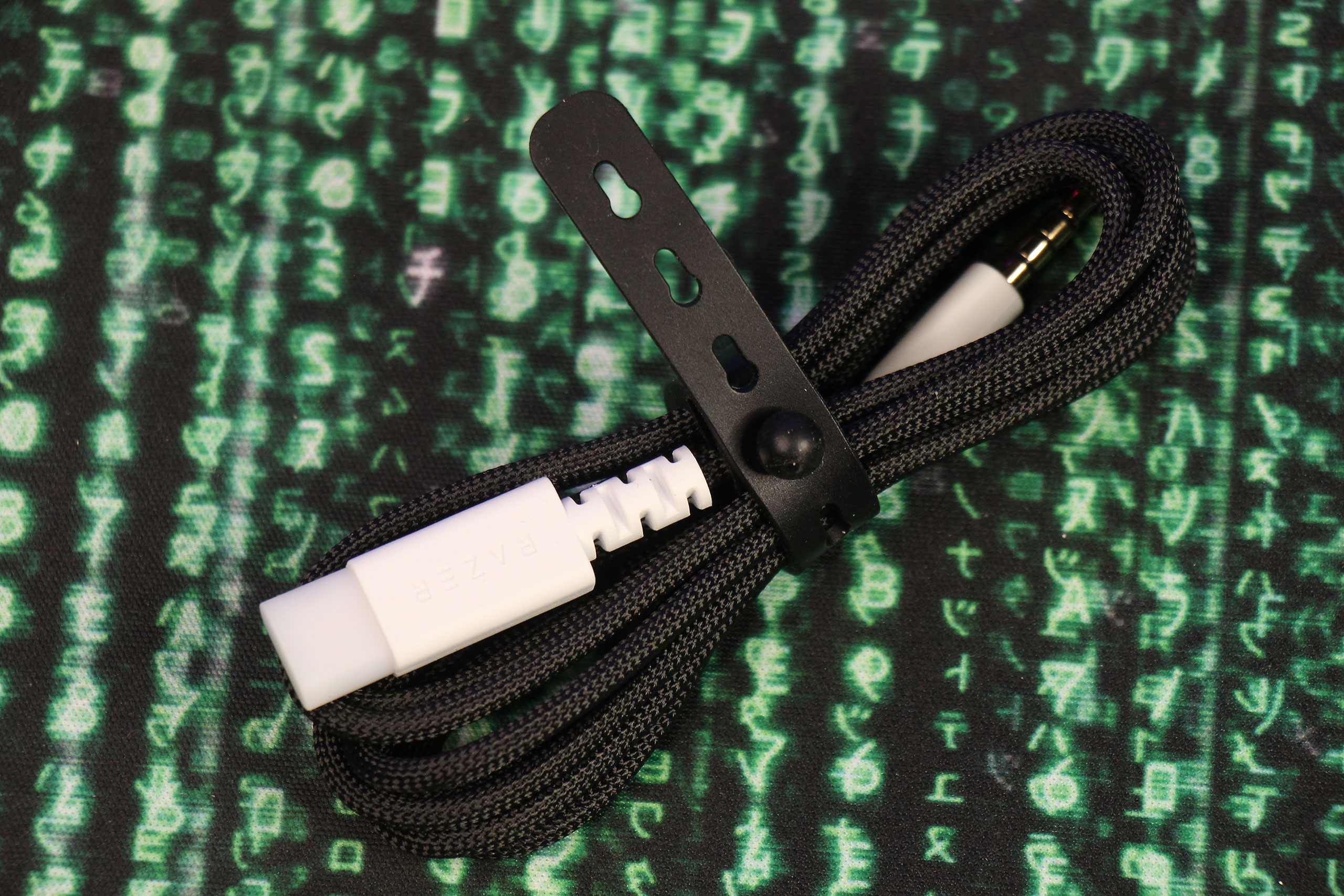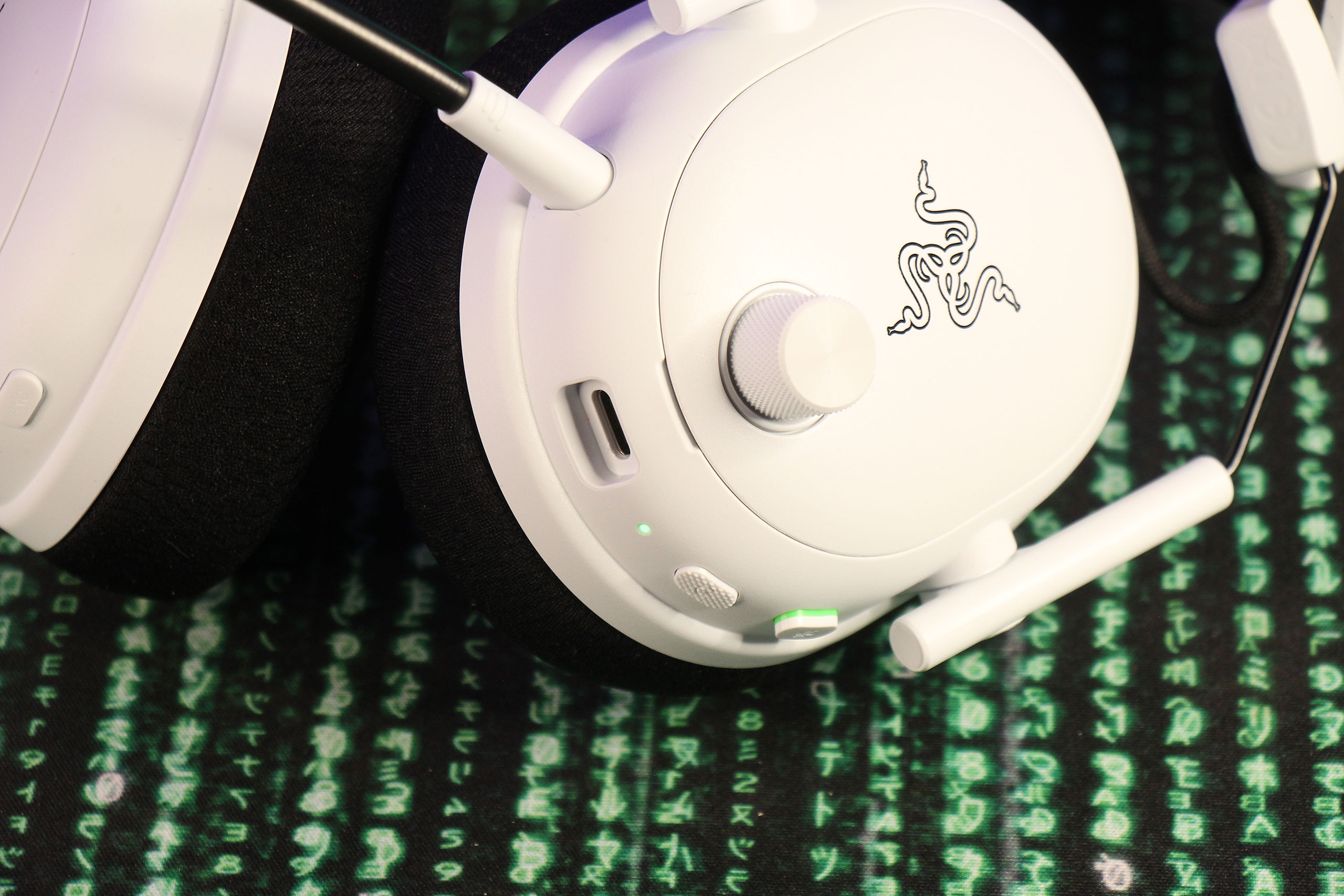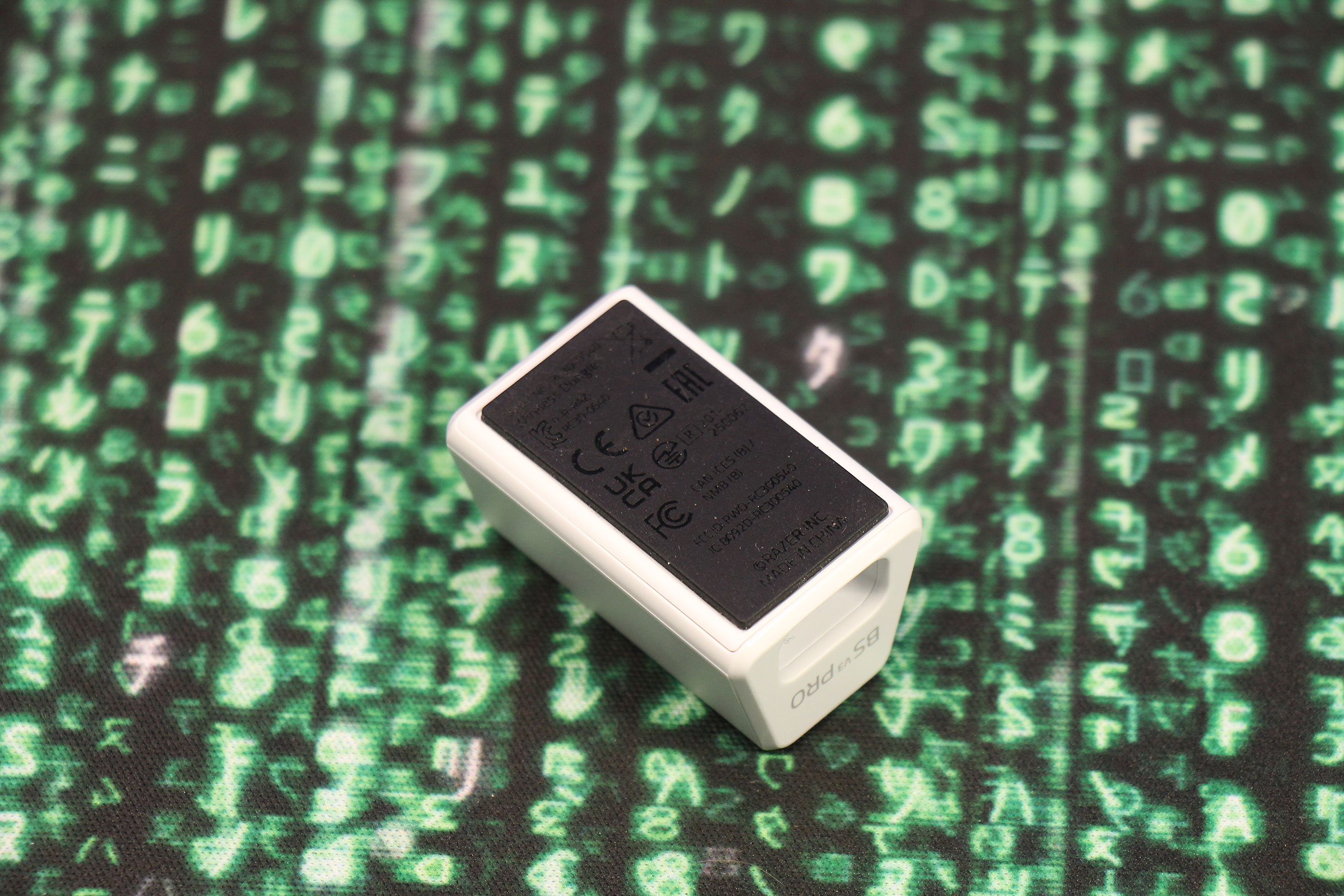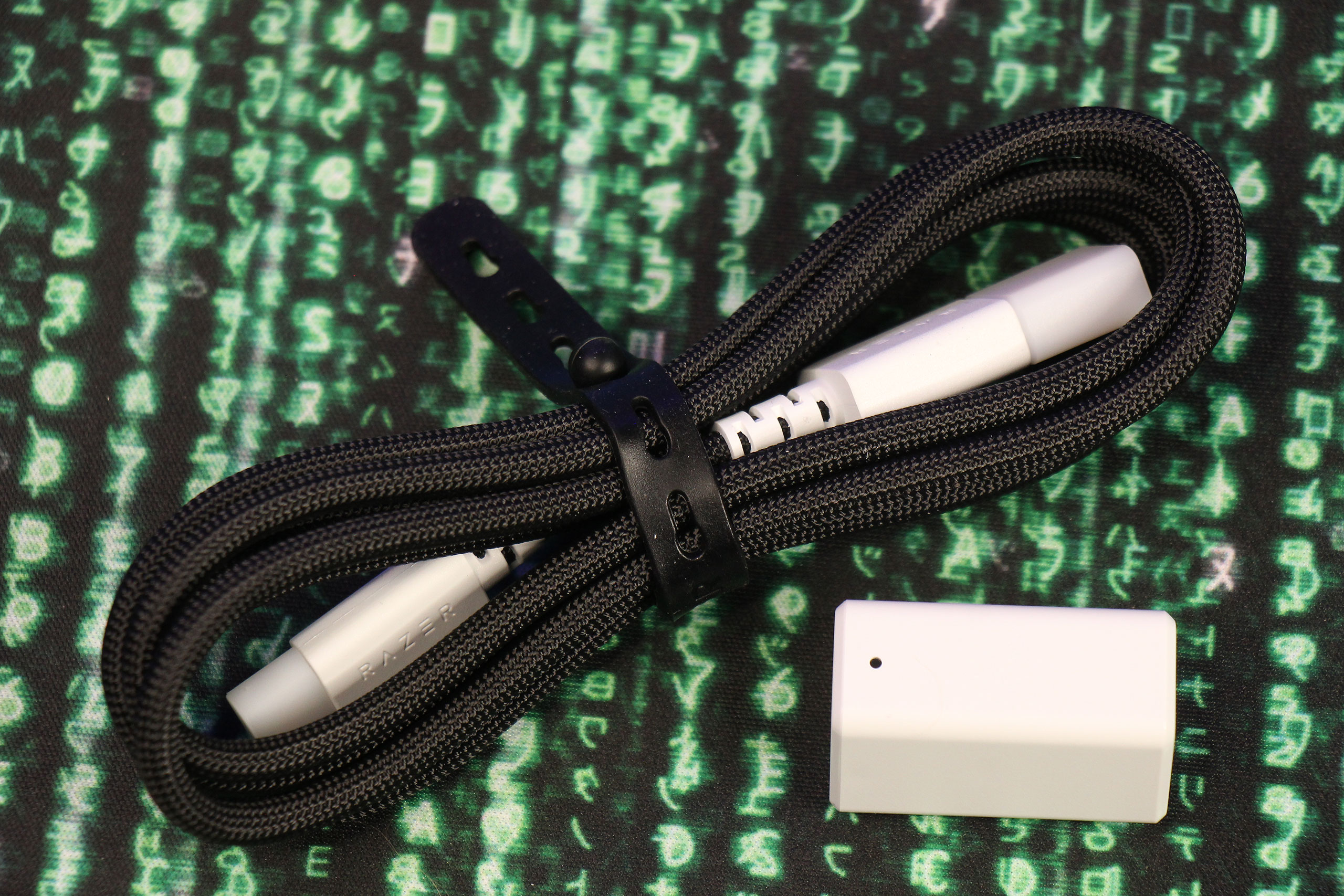 Немного непривычно вместе с гарнитурой видеть довольно большой USB-донгл Hyperspeed Wireless Gen‑2, выполненный в том же формате, что и у мышей типа Razer Viper V3 Pro. Это потому, что вместо обычного соединения по 2,4‑гигагерцовому каналу он позволяет работать с минимальной задержкой (заявлено 10 мс против 15 мс у первого поколения, которое использовалось в разных моделях линеек Kraken V4, BlackShark V2 и Barracuda). Сам донгл выполнен в белом цвете, а вот USB-провод к нему поставляется обычный, черный.