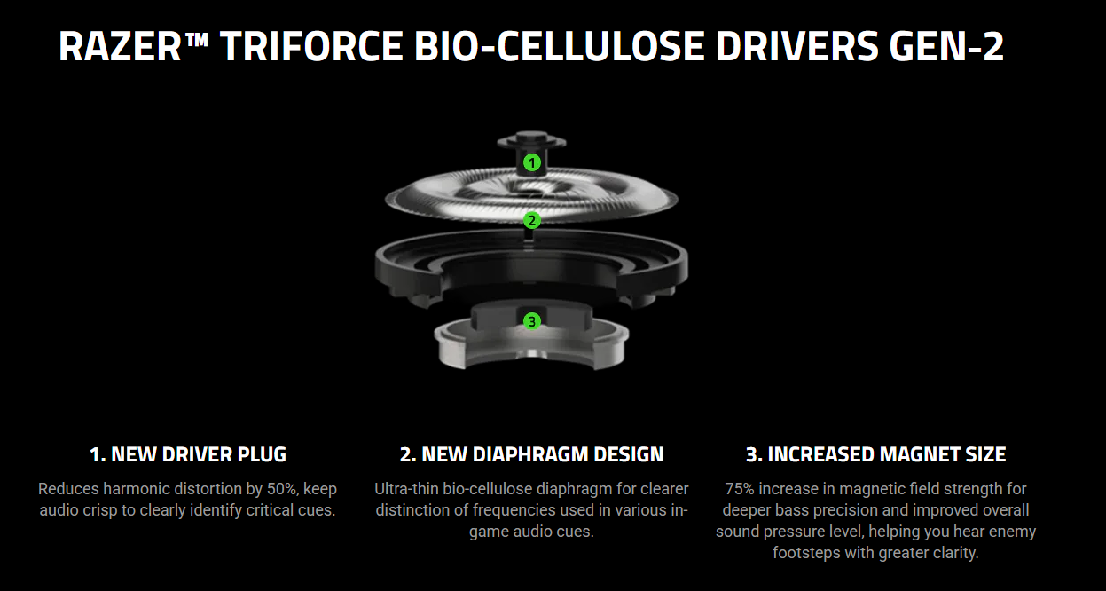 Биоцеллюлозный материал выбран за его жесткость и легкость, что теоретически обеспечивает более быстрый отклик и меньшие искажения по сравнению с традиционными материалами. По состоянию на момент написания обзора, такие драйверы присутствуют только в данной модели (в линейке Kraken V4 используется первое поколение, а в более доступных BlackShark V3 и BlackShark V3 X — другие материалы драйверов).